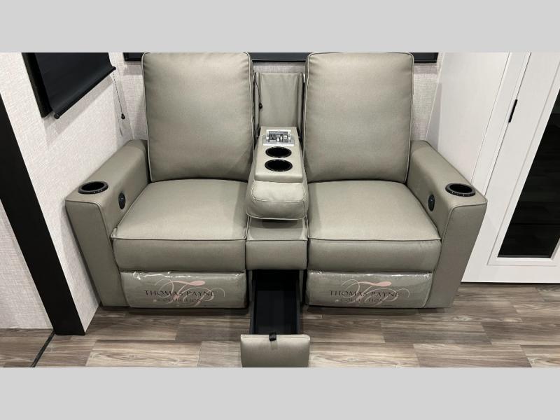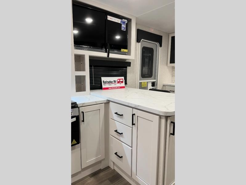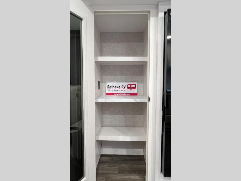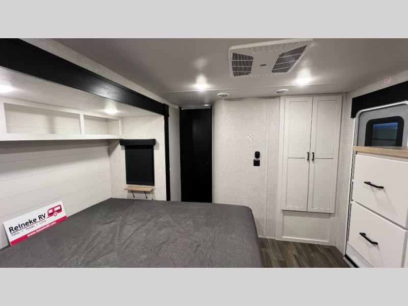 This is the perfect couple's unit to take on weekend excursions! You will find a front kitchen with ample counter space, including a bar top with two seats where you can enjoy breakfast at each morning. The theater seats are across from the entertainment center if you choose to stay in for the day, or you can grab your fishing poles from the pass-thru storage and head out for the day. A spacious full bath will let you freshen up when you return, and there is a closet with washer/dryer prep here if you want the option to add those appliances. Head to the rear private bedroom for a great night's rest on the king bed slide out. There is also a closet, dresser, and nightstand, plus one of the dual entry doors for added convenience!