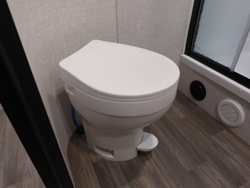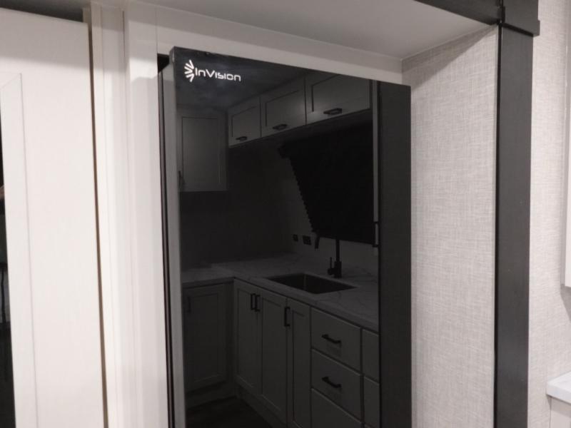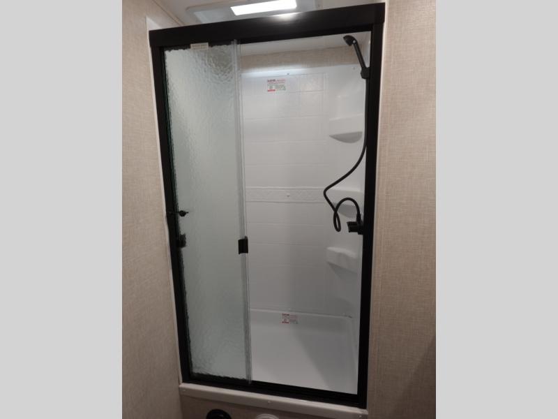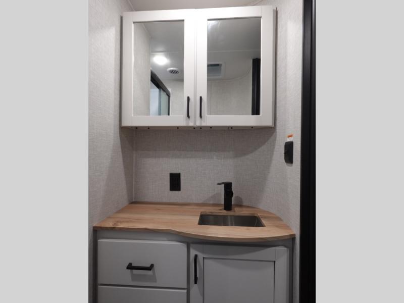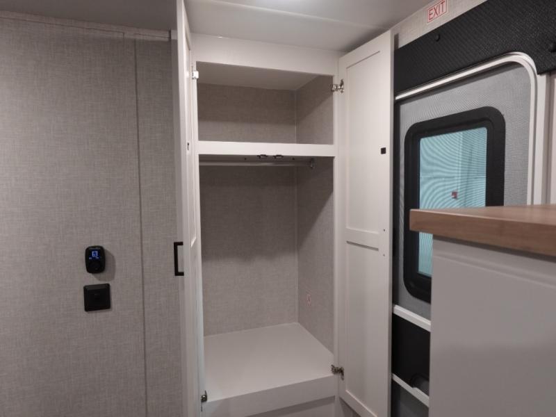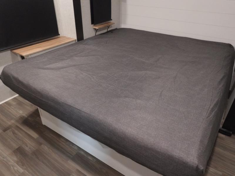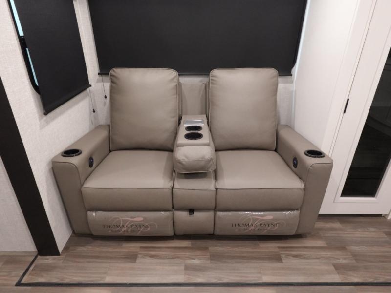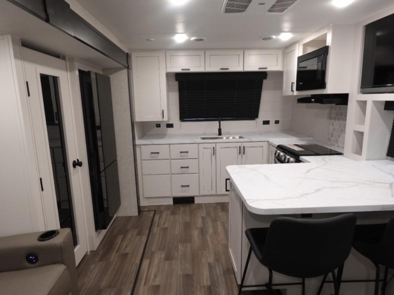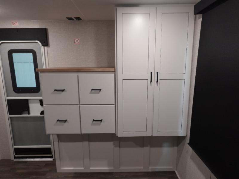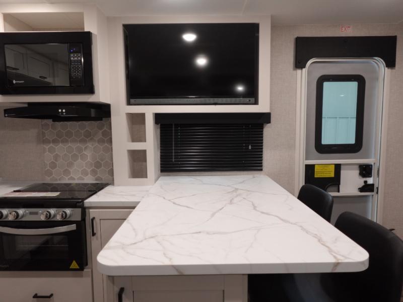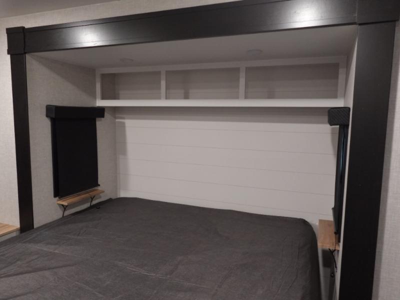 This is the perfect couple's unit to take on weekend excursions! You will find a front kitchen with ample counter space, including a bar top with two seats where you can enjoy breakfast at each morning. The theater seats are across from the entertainment center if you choose to stay in for the day, or you can grab your fishing poles from the pass-thru storage and head out for the day. A spacious full bath will let you freshen up when you return, and there is a closet.. Head to the rear private bedroom for a great night's rest on the king bed slide out. There is also a closet, dresser, and nightstand, plus one of the dual entry doors for added convenience!