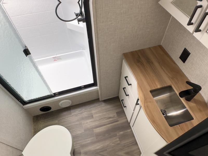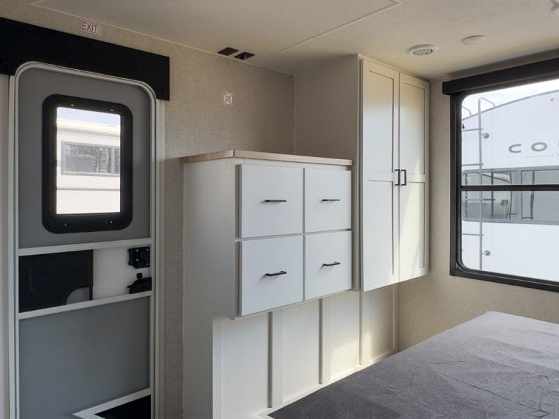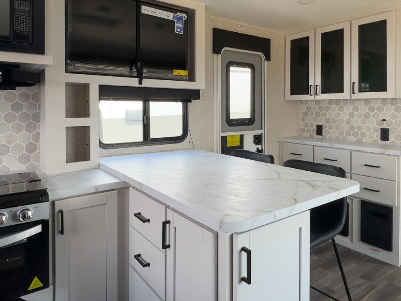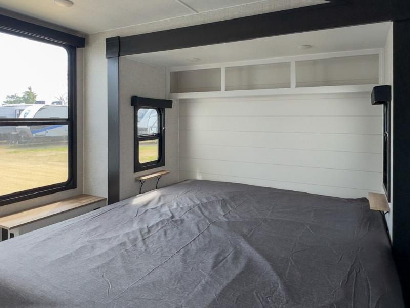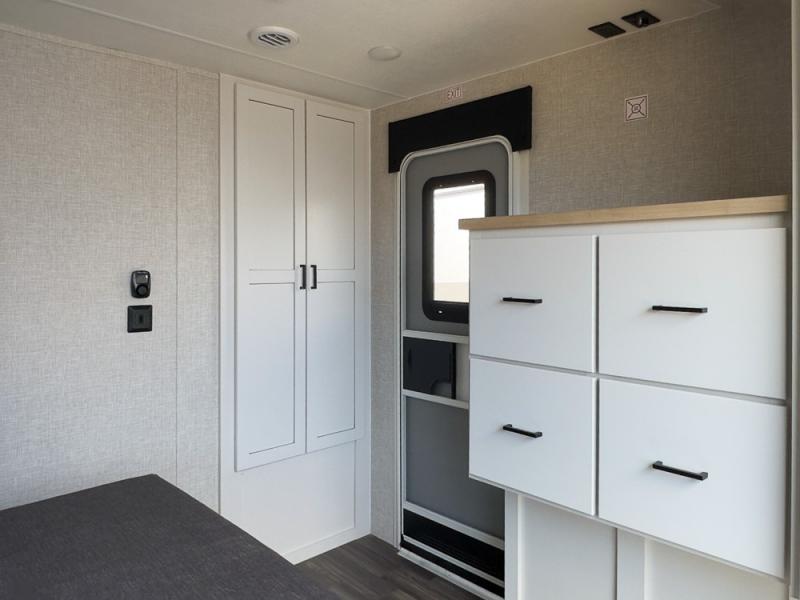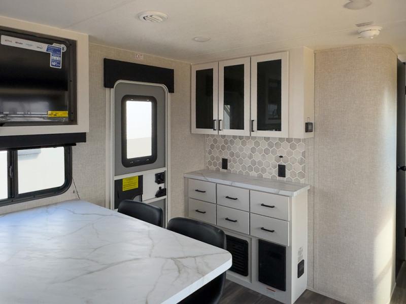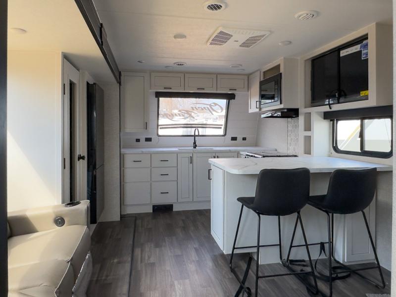 This is the perfect couple's unit to take on weekend excursions! You will find a front kitchen with ample counter space, including a bar top with two seats where you can enjoy breakfast at each morning. The theater seats are across from the entertainment center if you choose to stay in for the day, or you can grab your fishing poles from the pass-thru storage and head out for the day. A spacious full bath will let you freshen up when you return, and there is a closet with washer/dryer prep here if you want the option to add those appliances. Head to the rear private bedroom for a great night's rest on the king bed slide out. There is also a closet, dresser, and nightstand, plus one of the dual entry doors for added convenience!