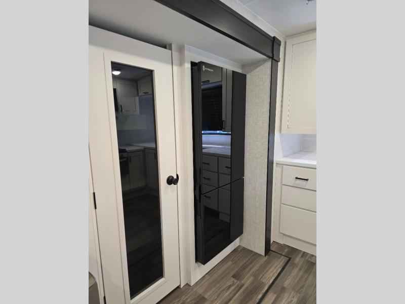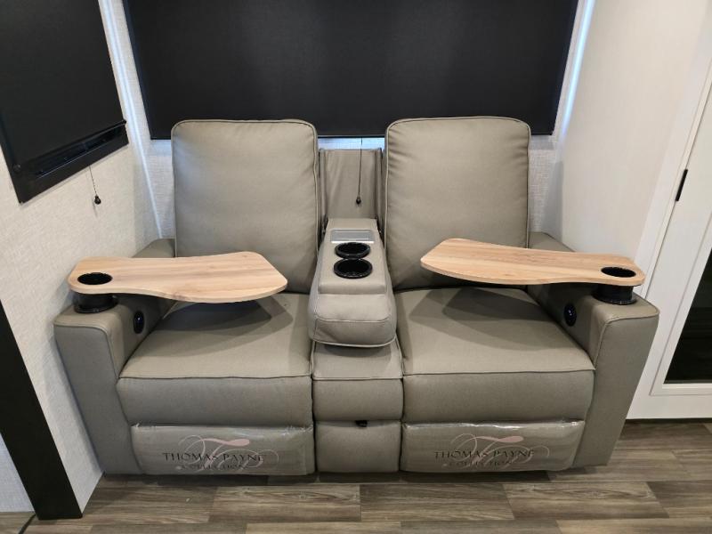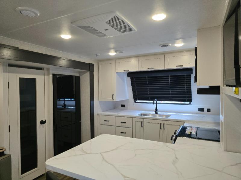 This is the perfect couple's unit to take on weekend excursions! You will find a front kitchen with ample counter space, including a bar top with two seats where you can enjoy breakfast at each morning. The theater seats are across from the entertainment center if you choose to stay in for the day, or you can grab your fishing poles from the pass-thru storage and head out for the day. A spacious full bath will let you freshen up when you return, and there is a closet with washer/dryer prep here if you want the option to add those appliances. Head to the rear private bedroom for a great night's rest on the king bed slide out. There is also a closet, dresser, and nightstand, plus one of the dual entry doors for added convenience!