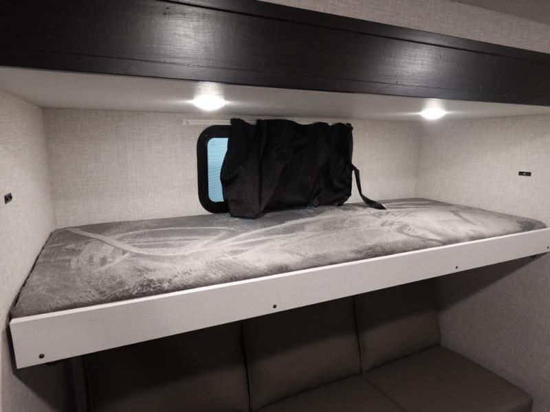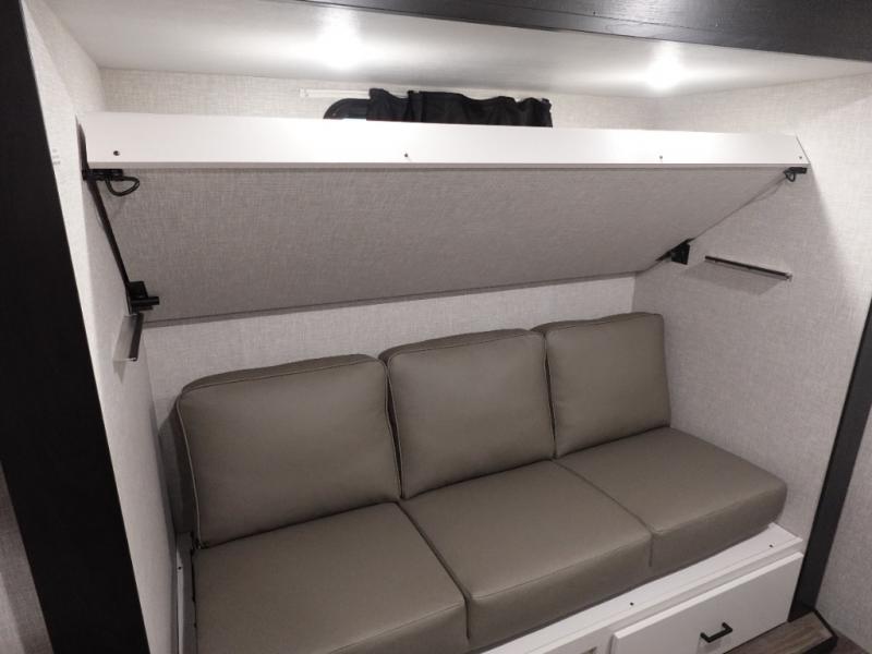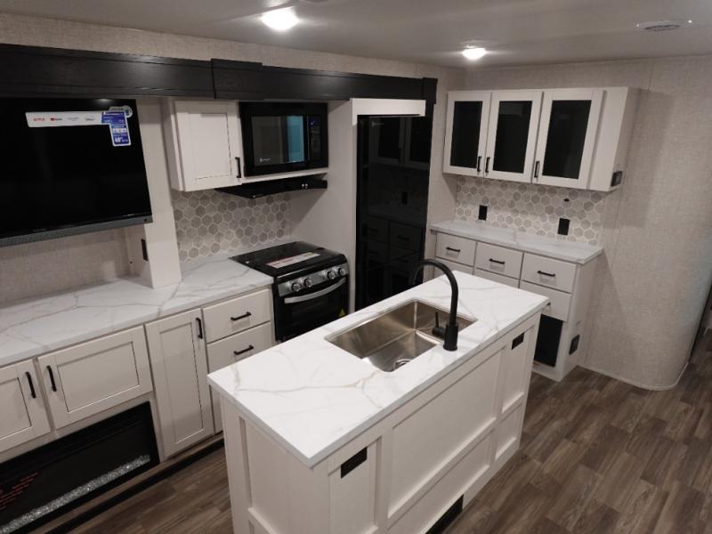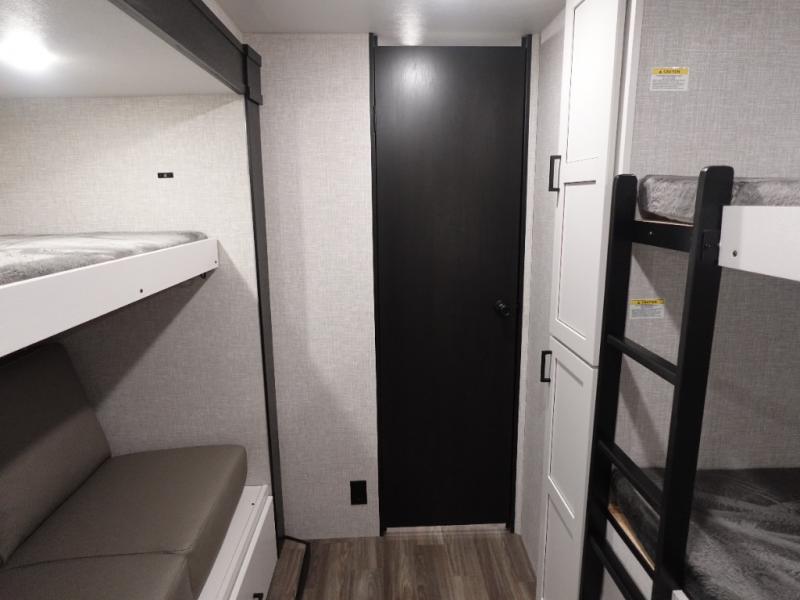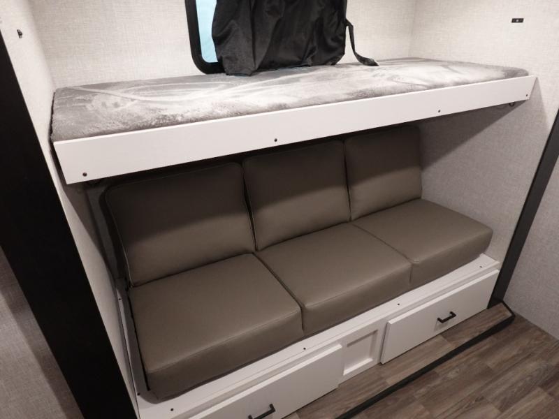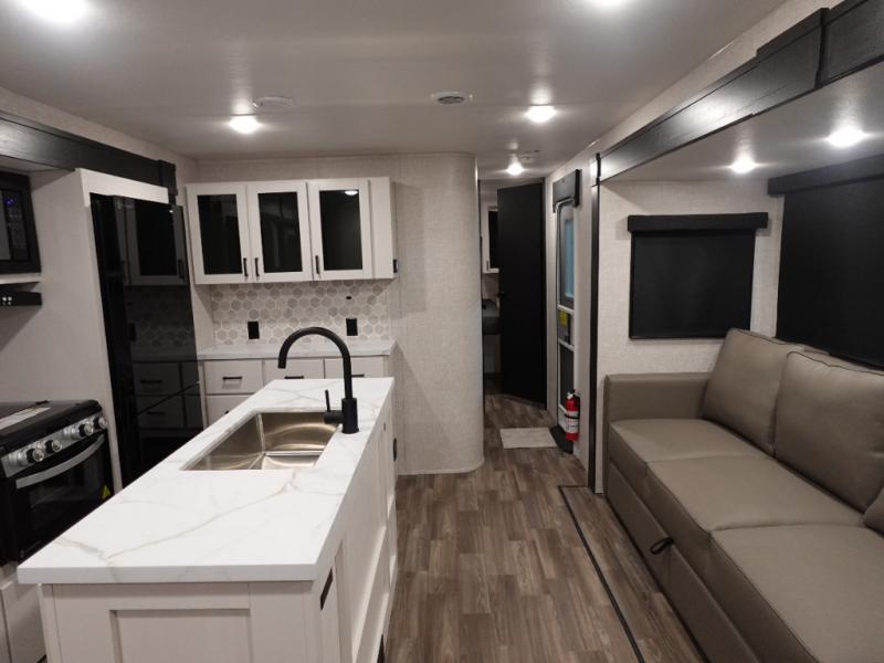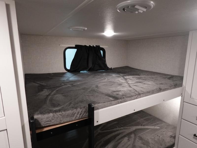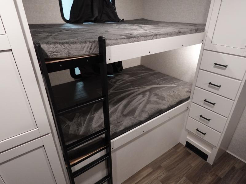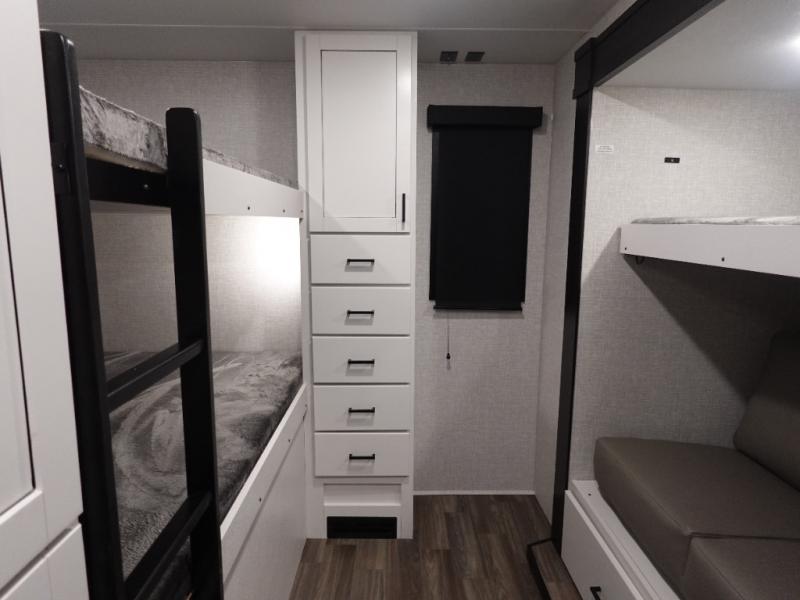 This travel trailer will have you feeling right at home! The rear private bunkhouse has plenty of space for the kiddos to move around, as well as a set of double-size bunks with a ladder, two wardrobes, and a slide with a flip-up bunk above a jackknife sofa. Everyone can gather together and relax on the super sofa. The kitchen island makes meal prepping easier and you can store your dishes in the hutch. You could even cook your meals while breathing in some fresh air with the outside kitchen which also has a refrigerator to keep your beverages cold. There's a full bathroom to stay clean and a closet in the front private bedroom with washer/dryer prep if you want to add those appliances.