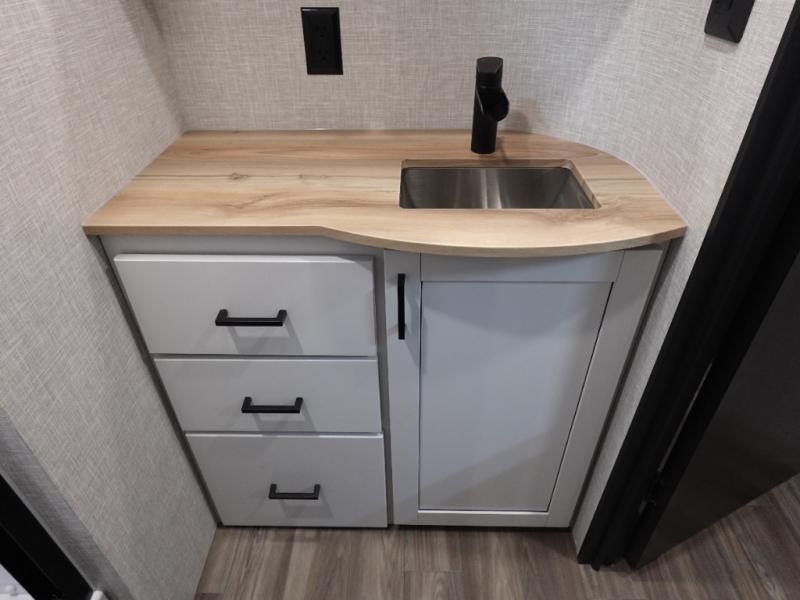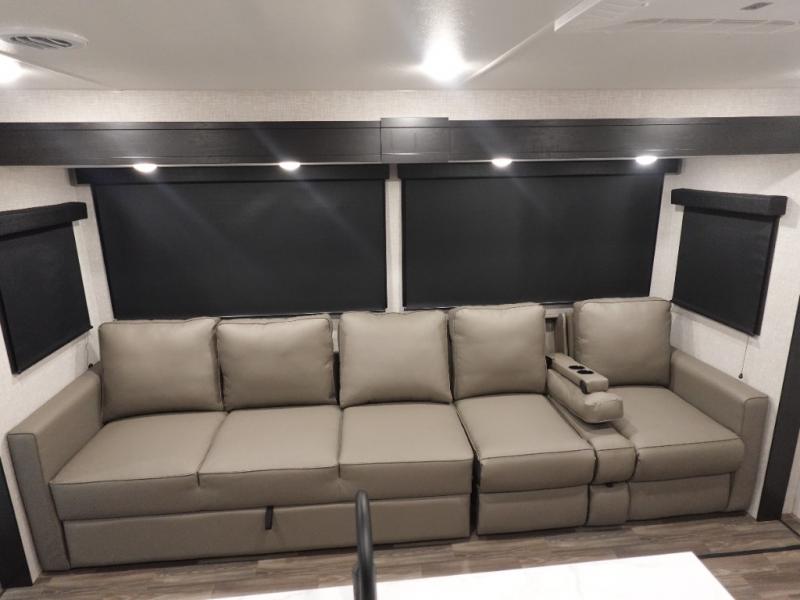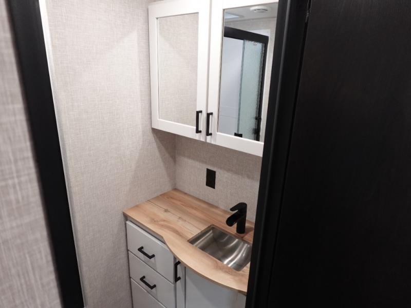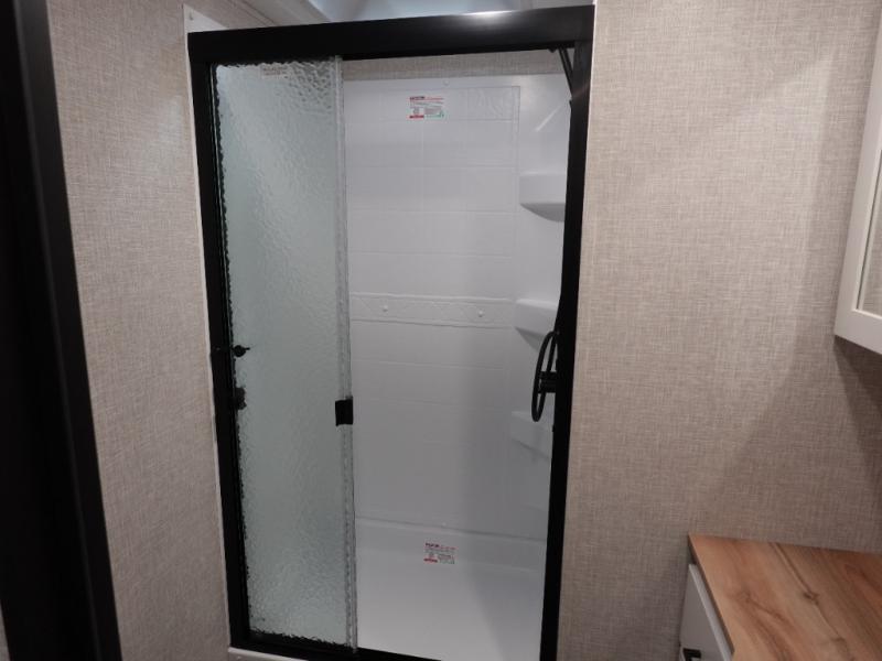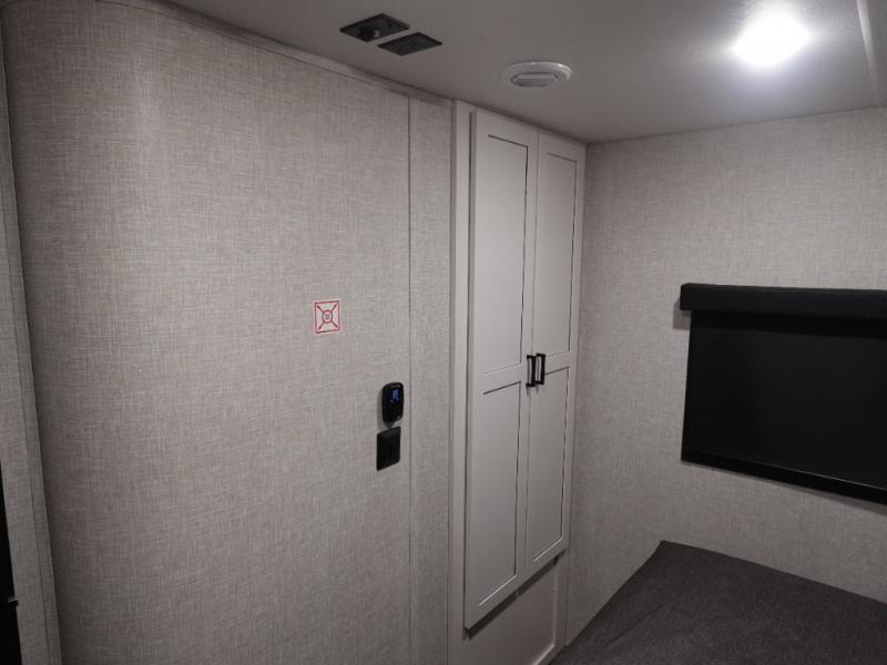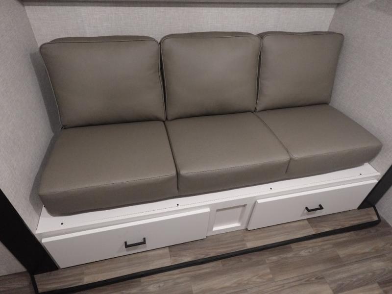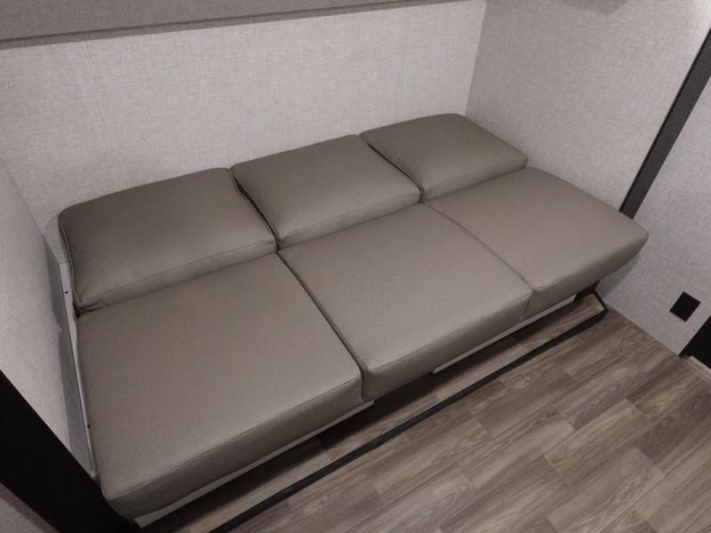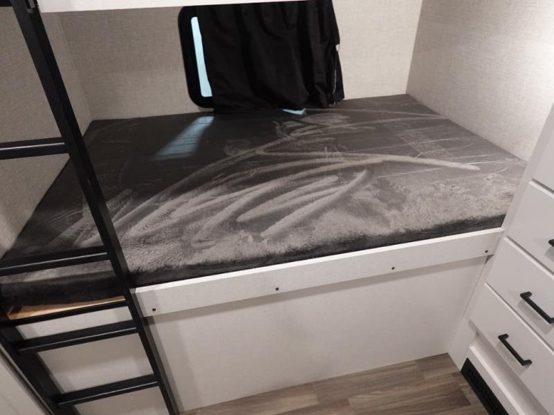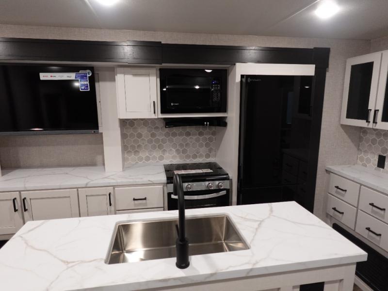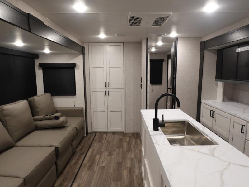 This travel trailer will have you feeling right at home! The rear private bunkhouse has plenty of space for the kiddos to move around, as well as a set of double-size bunks with a ladder, two wardrobes, and a slide with a flip-up bunk above a jackknife sofa. Everyone can gather together and relax on the super sofa. The kitchen island makes meal prepping easier and you can store your dishes in the hutch. You could even cook your meals while breathing in some fresh air with the outside kitchen which also has a refrigerator to keep your beverages cold. There's a full bathroom to stay clean and a closet in the front private bedroom with washer/dryer prep if you want to add those appliances.
