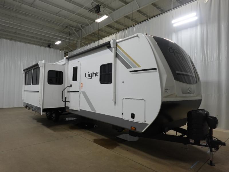 With every Open Range Light travel trailer by Highland Ridge there is a class leading l-beam chassis, and each includes TuffShell vacuumed bonded and laminated construction, reinforced with heavy duty fiberglass, and welded aluminum frames, plus Thermal Seal which includes an enclosed, insulated and heated underbelly and a fully insulated roof with PVC roofing membrane for four seasons of camping. Inside you will love the look of the hardwood cabinet doors, beautiful Coastal Linen decor, and residential vinyl flooring throughout making each RV pet and kid friendly. And don't forget about the TravelLink which is Bluetooth control of slides, lighting, awnings, cooling and more making setup easy. There are many more features included in each Light, start your lightweight adventure today!