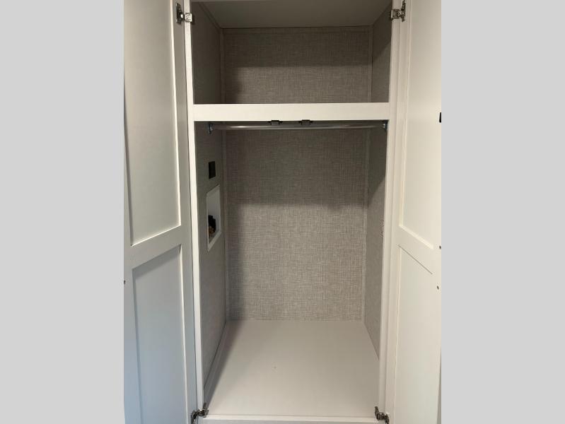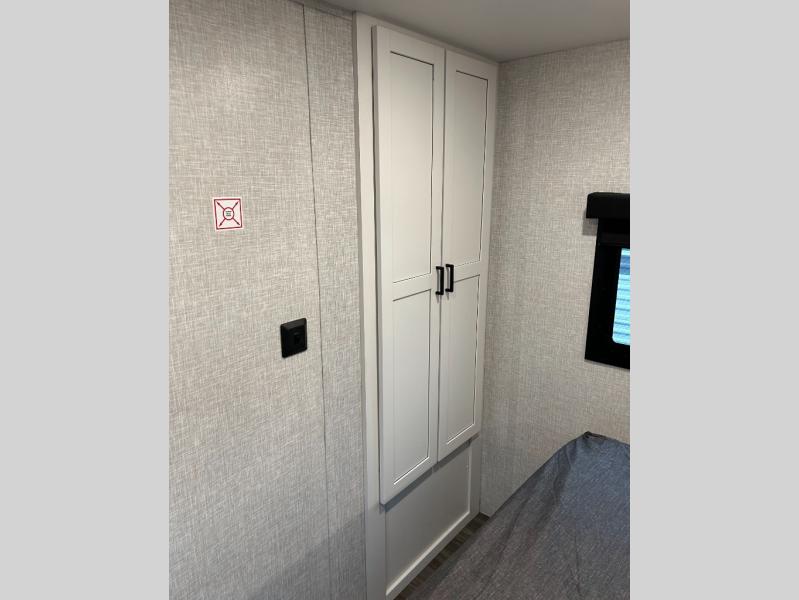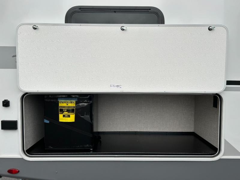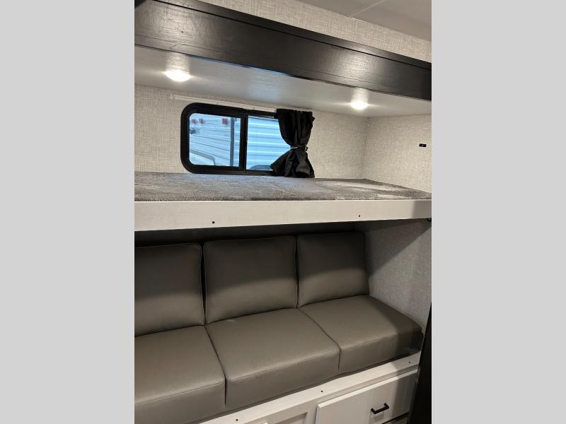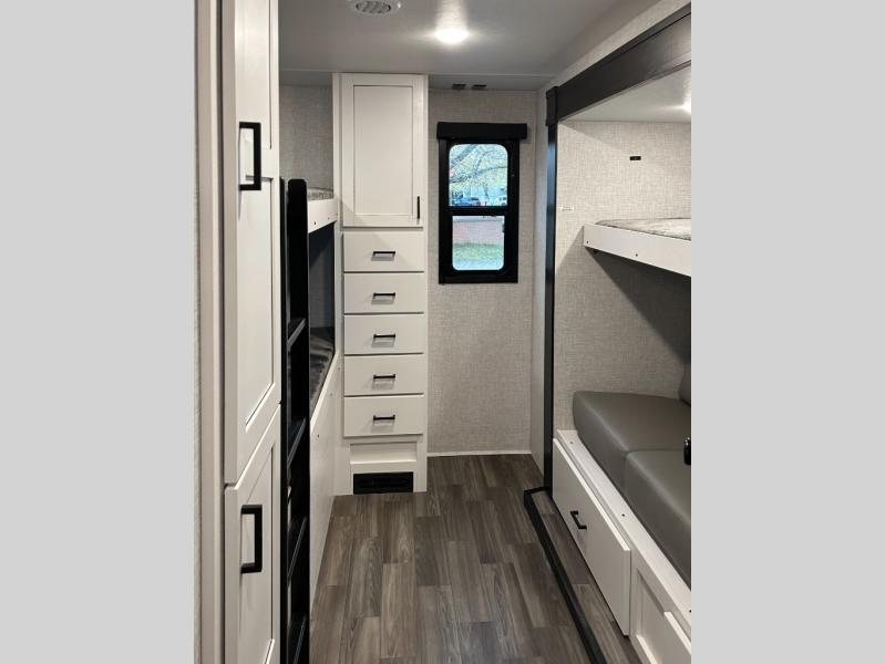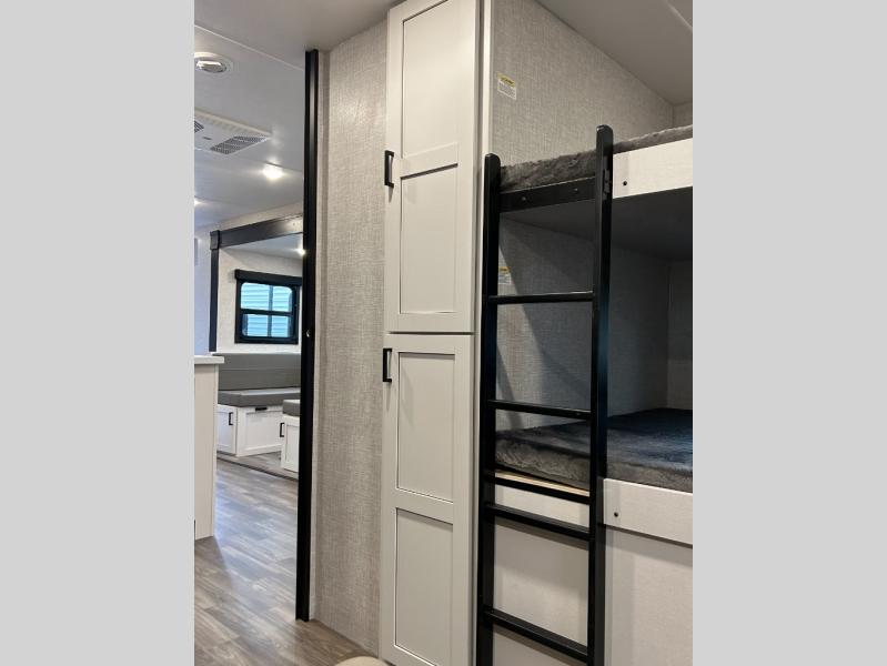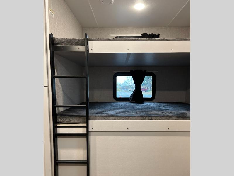 This travel trailer will have you feeling right at home! The rear private bunkhouse has plenty of space for the kiddos to move around, as well as a set of bunk beds with ladder, two wardrobes, and a slide with a flip-up bunk above a jackknife sofa. Everyone can gather together and either relax on the theater seating across from the entertainment center with a fireplace or play a game at the booth dinette. The kitchen island makes meal prepping easier and you can store your dishes in the hutch. Even has a outdoor refrigerator to keep your beverages cold. There's a full bathroom to stay clean and a closet in the front private bedroom that is prepped for a washer and dryer too!