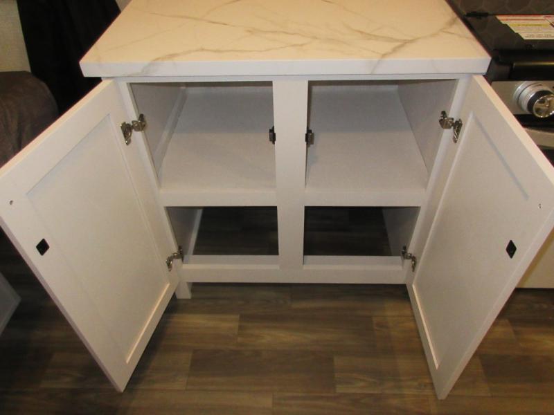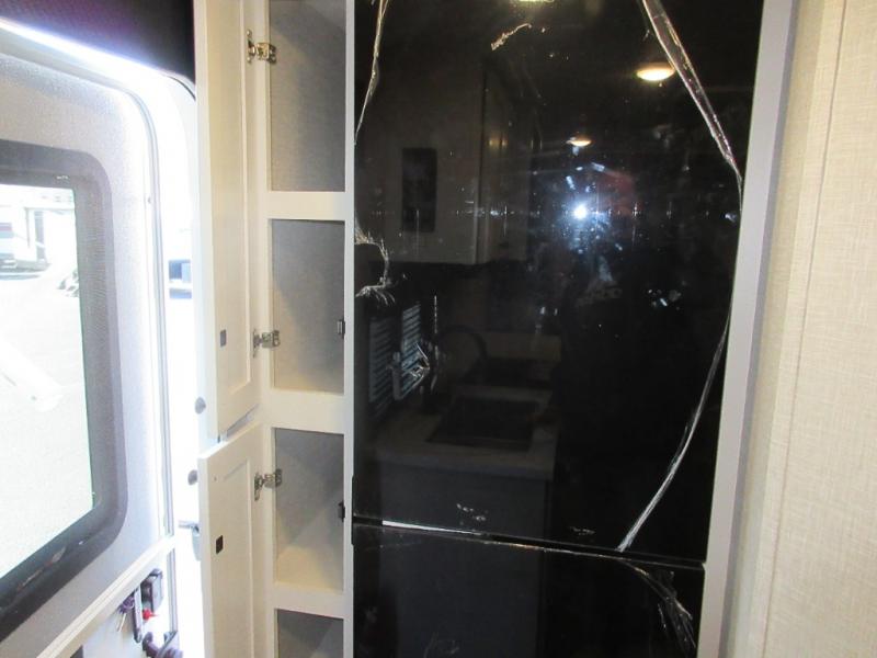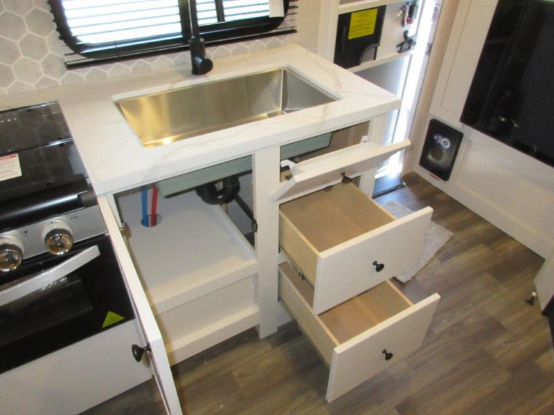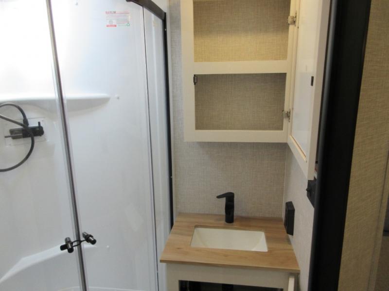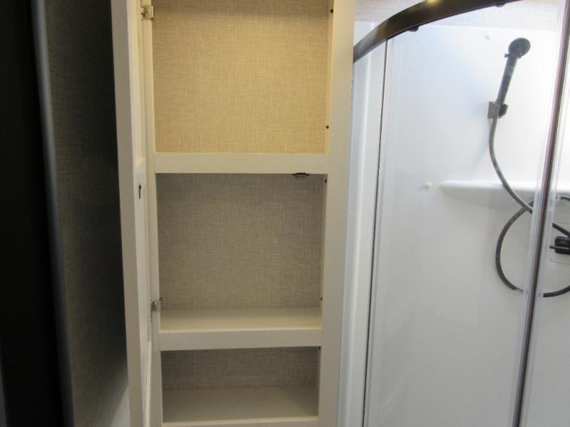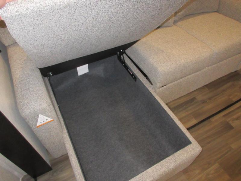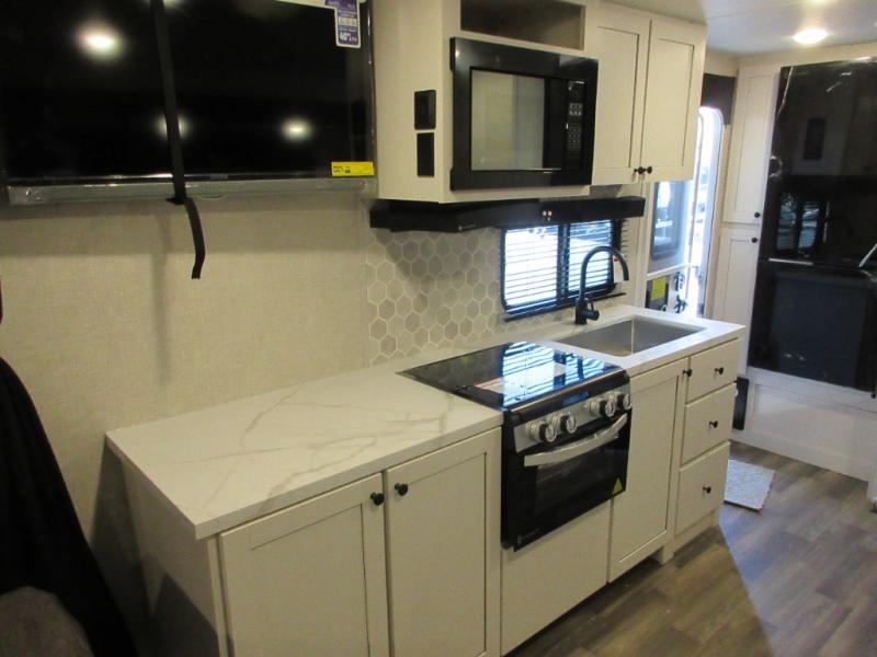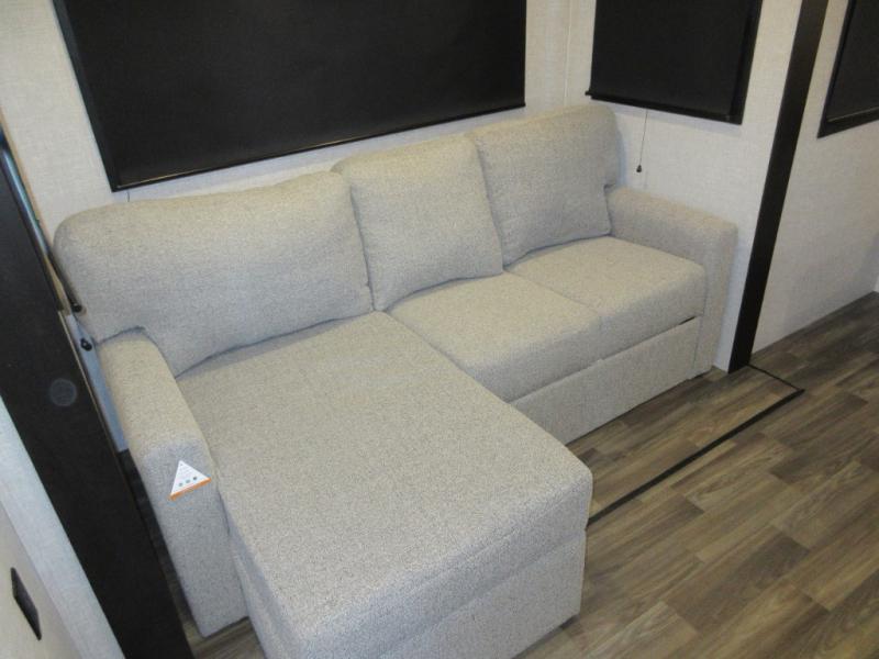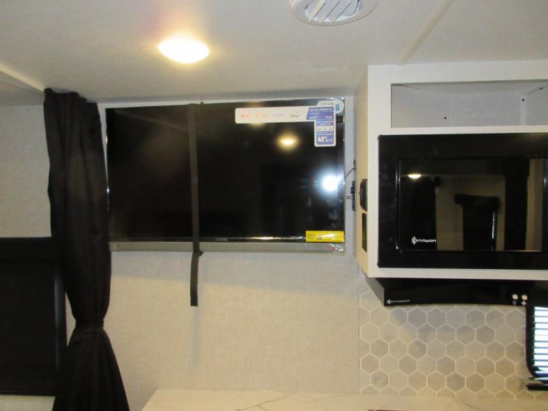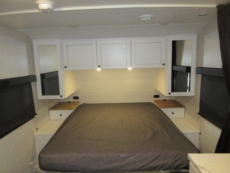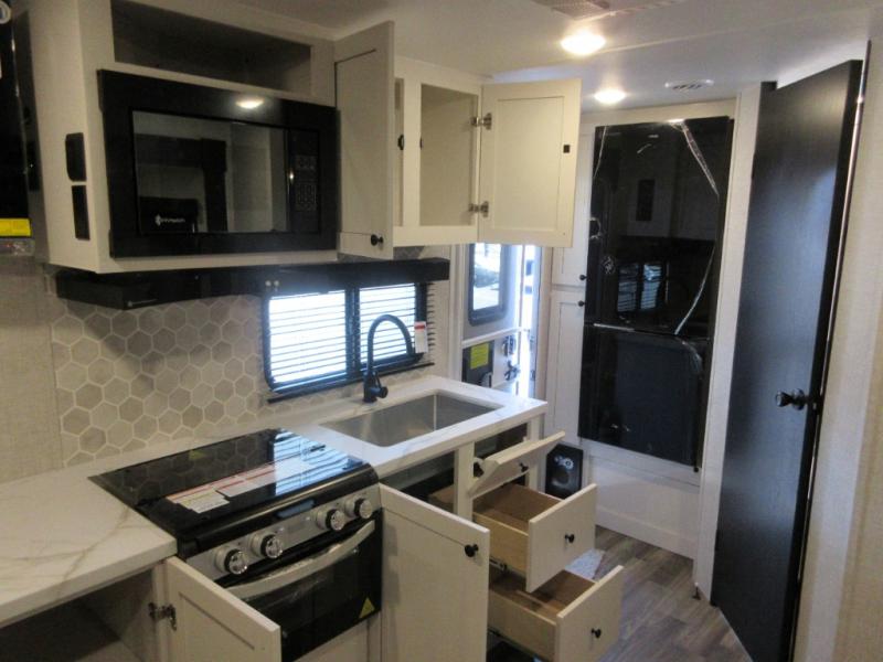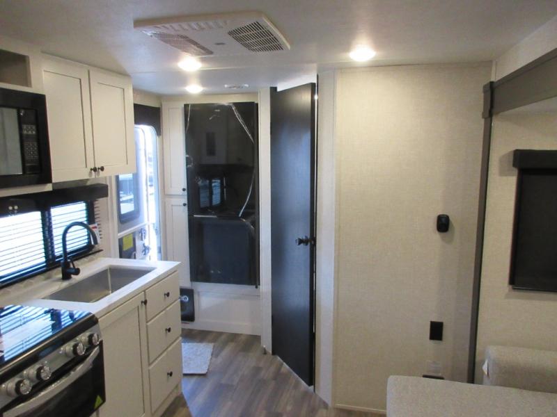 This travel trailer is the perfect couple's getaway! It features a front queen bed with wardrobes on either side for your clothes, overhead cabinets, and a privacy curtain to draw at night. You can prepare your best meals with the three burner cooktop with a 17" oven, enjoy them at the L-sofa with a table which is conveniently across from the entertainment center that has a smart HDTV, and store any leftovers in the 10 cu. ft. refrigerator. The rear corner bathroom has a radius shower to freshen up in each morning, a medicine cabinet to store your toiletries, and a linen closet to keep your towels close.