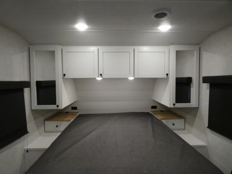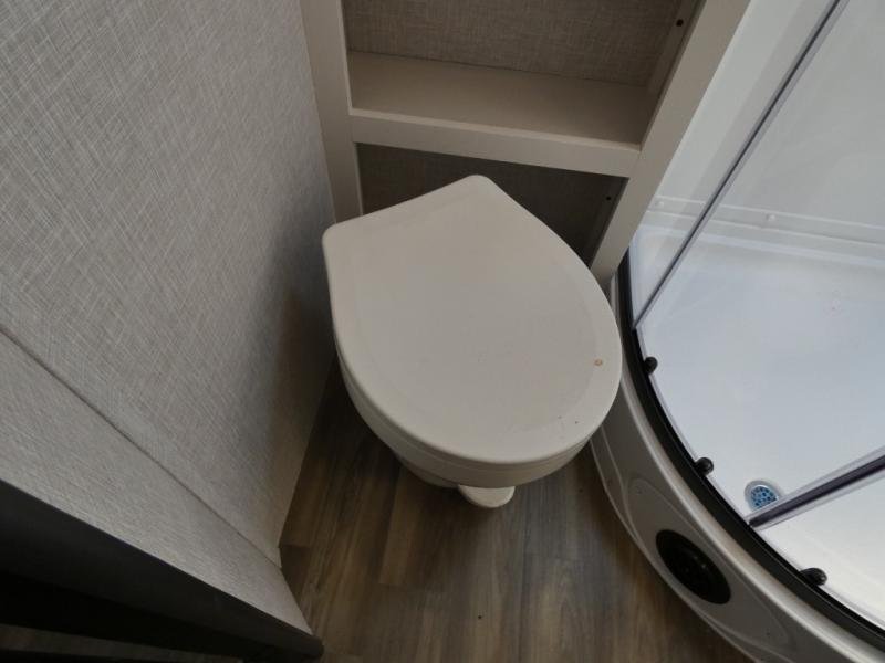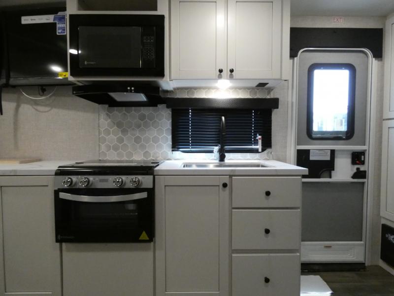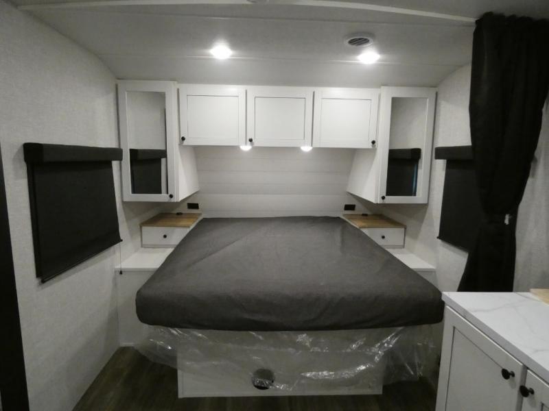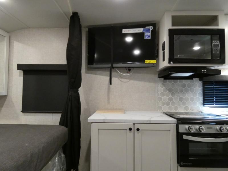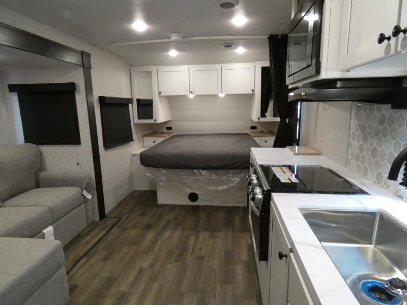 This travel trailer is the perfect couple's getaway! It features a front queen bed with wardrobes on either side for your clothes, overhead cabinets, and a privacy curtain to draw at night. You can prepare your best meals with the three burner cooktop with a 17" oven, enjoy them at the L-sofa with a table which is conveniently across from the entertainment center that has a smart HDTV, and store any leftovers in the 10 cu. ft. refrigerator. The rear corner bathroom has a radius shower to freshen up in each morning, a medicine cabinet to store your toiletries, and a linen closet to keep your towels close.