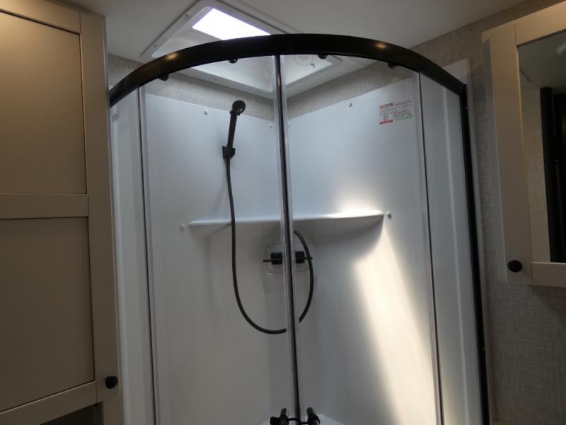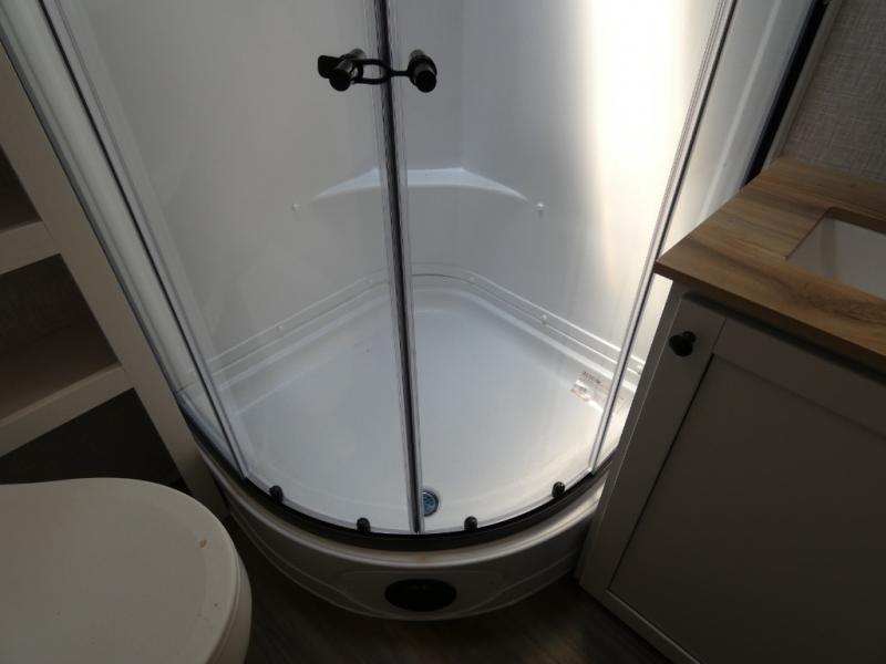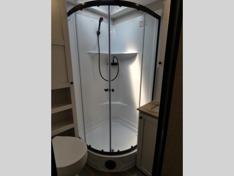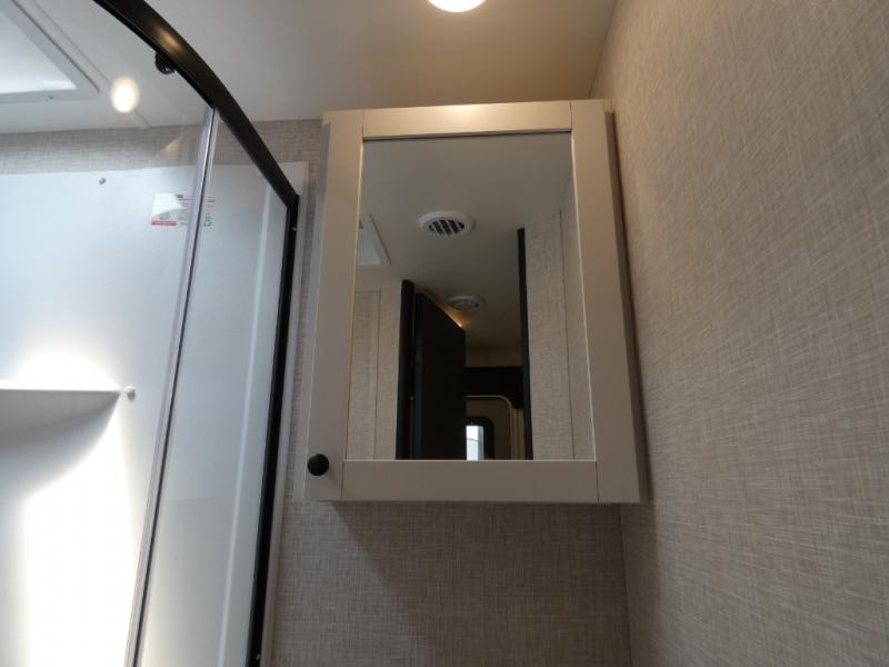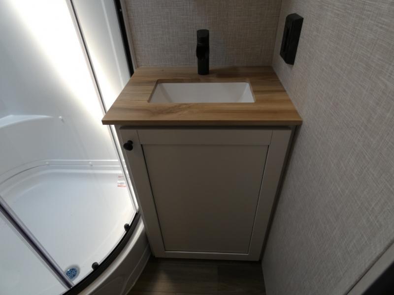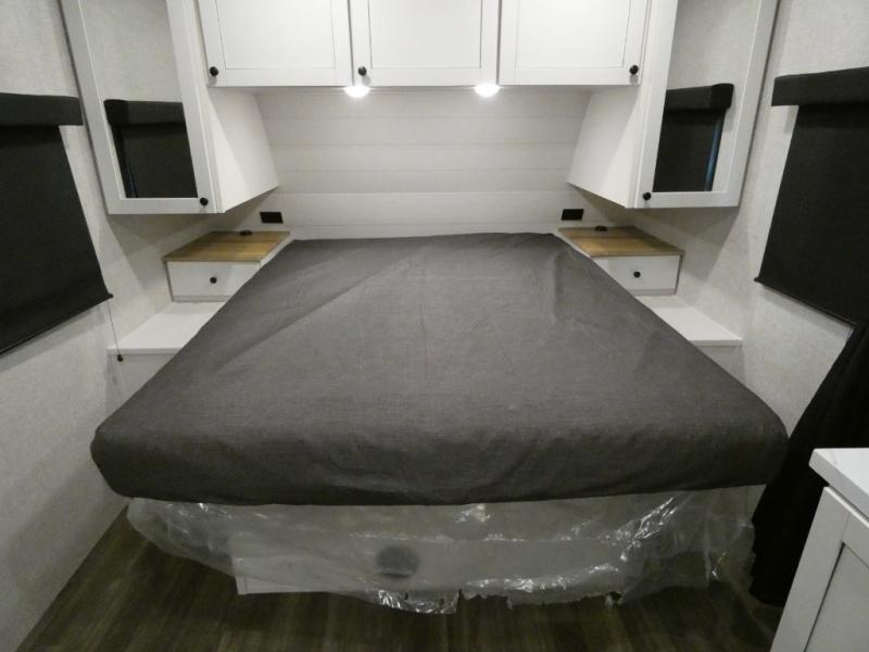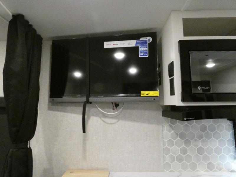 This travel trailer is the perfect couple's getaway! It features a front queen bed with wardrobes on either side for your clothes, overhead cabinets, and a privacy curtain to draw at night. You can prepare your best meals with the three burner cooktop with a 17" oven, enjoy them at the L-sofa with a table which is conveniently across from the entertainment center that has a smart HDTV, and store any leftovers in the 10 cu. ft. refrigerator. The rear corner bathroom has a radius shower to freshen up in each morning, a medicine cabinet to store your toiletries, and a linen closet to keep your towels close.