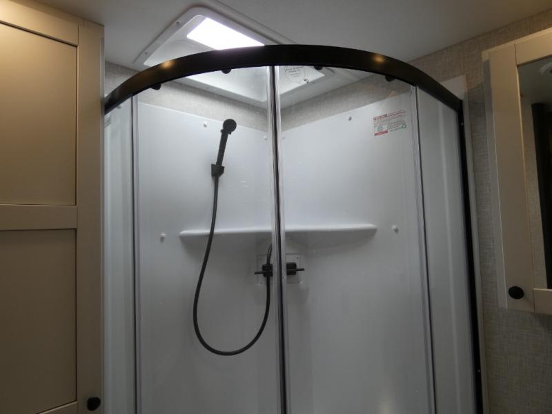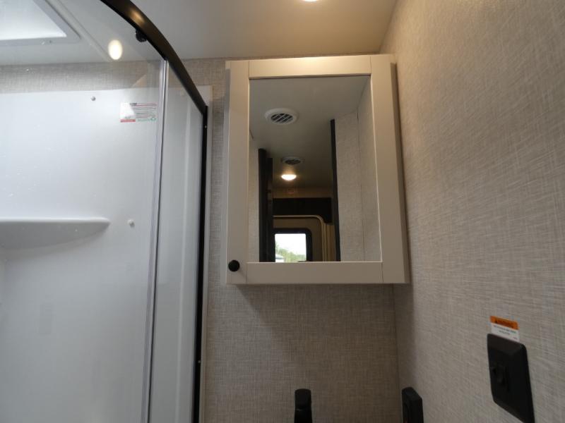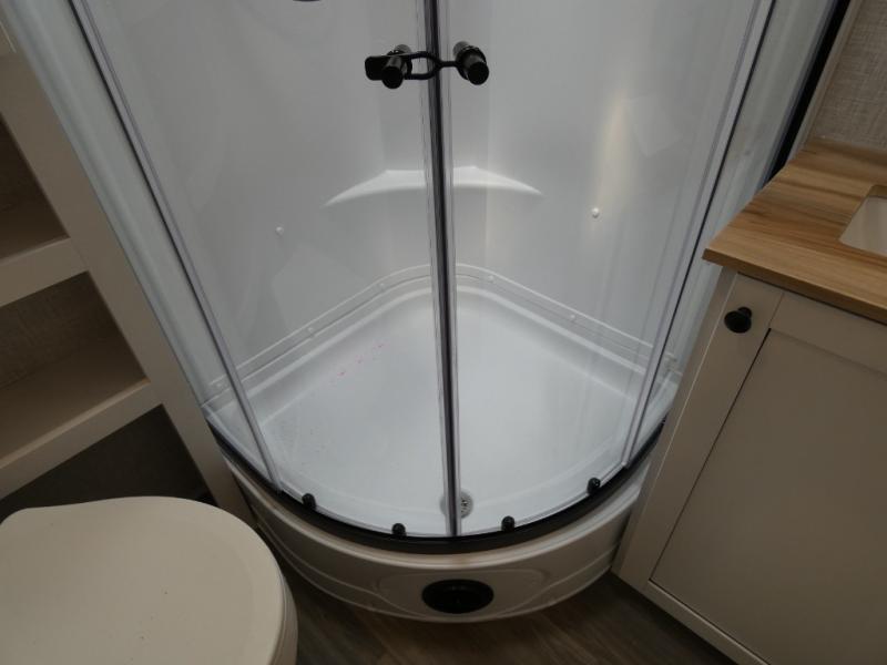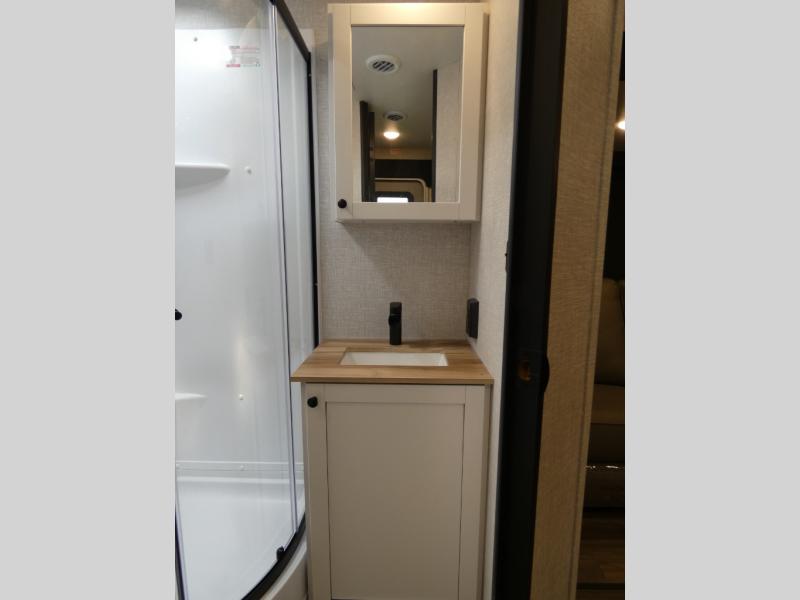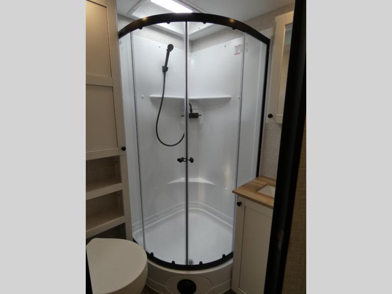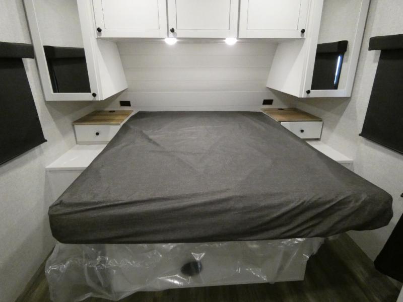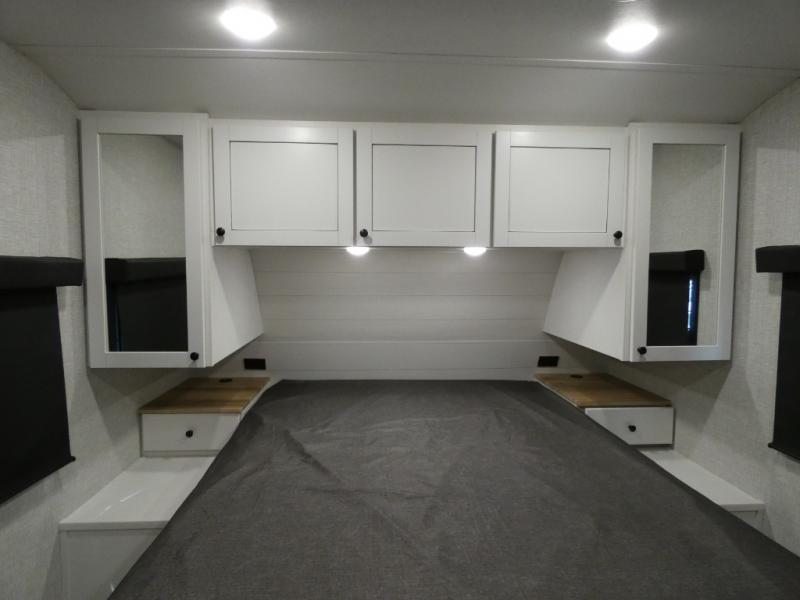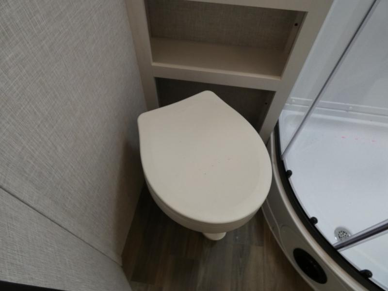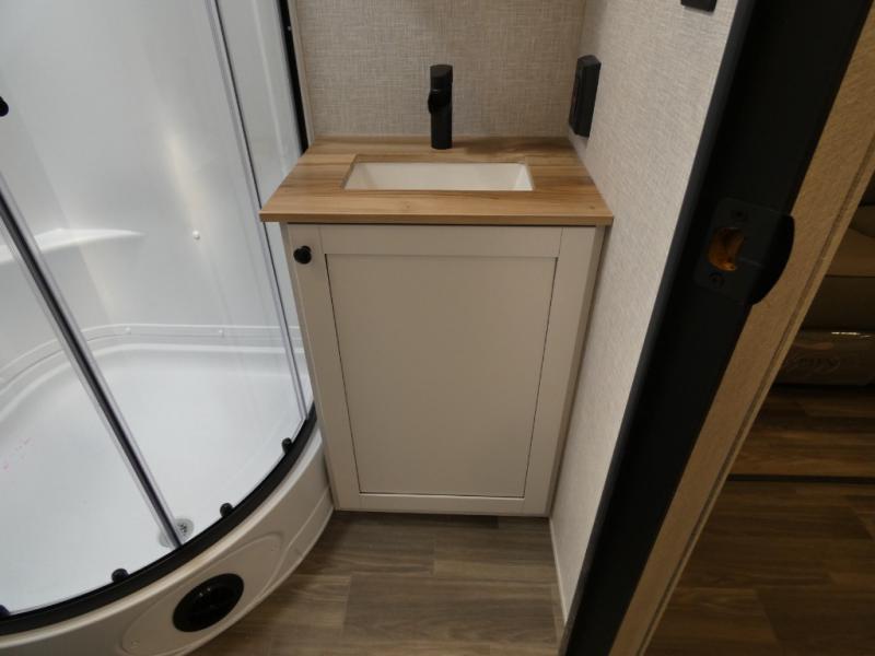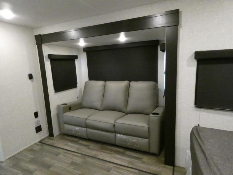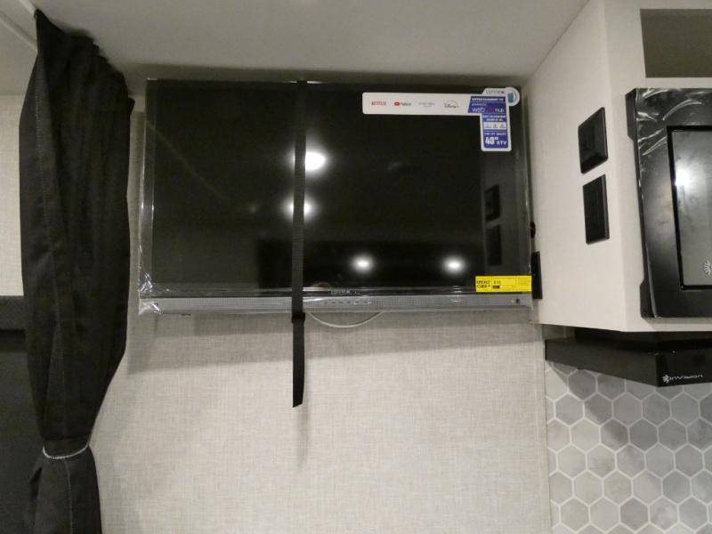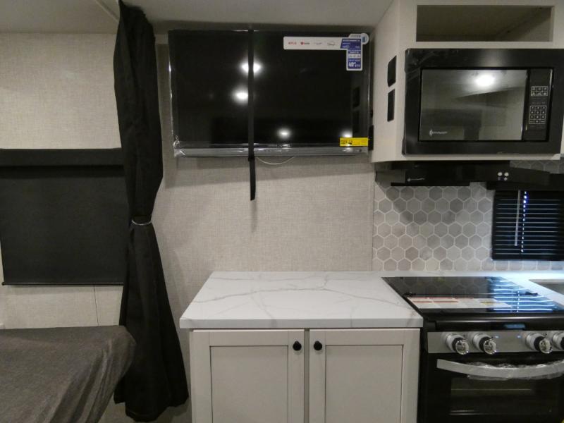 This travel trailer is the perfect couple's getaway! It features a front queen bed with wardrobes on either side for your clothes, overhead cabinets, and a privacy curtain to draw at night. You can prepare your best meals with the three burner cooktop with a 17" oven, enjoy them at the L-sofa with a table which is conveniently across from the entertainment center that has a smart HDTV, and store any leftovers in the 10 cu. ft. refrigerator. The rear corner bathroom has a radius shower to freshen up in each morning, a medicine cabinet to store your toiletries, and a linen closet to keep your towels close.