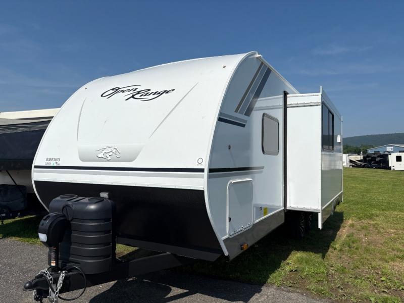 Each one of these Open Range RV Range Lite travel trailers maximize their interior space while staying lightweight thanks to the TuffShell fiberglass walls! The residential floor slides create more interior space, and the residential vinyl flooring throughout makes them kid and pet friendly. A few construction features you will appreciate include a fully-walkable roof, a thermal seal which means the underbelly is enclosed, heated, and insulated, and a fully insulated roof with a PVC roofing membrane. Plus, there is an exterior grill hookup quick connect port, self-adjusting electric brakes to help you safely arrive, and an oversized pass-through storage area with motion lighting. Each model also includes the Xtend Solar I Package with a 200 watt solar panel with a 30 amp solar controller so boondocking is easier than ever.