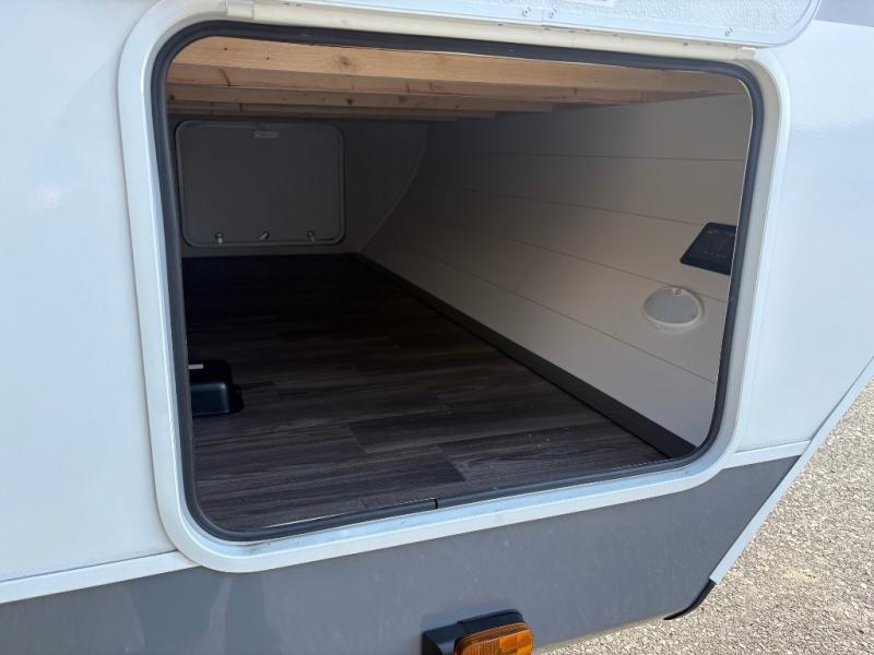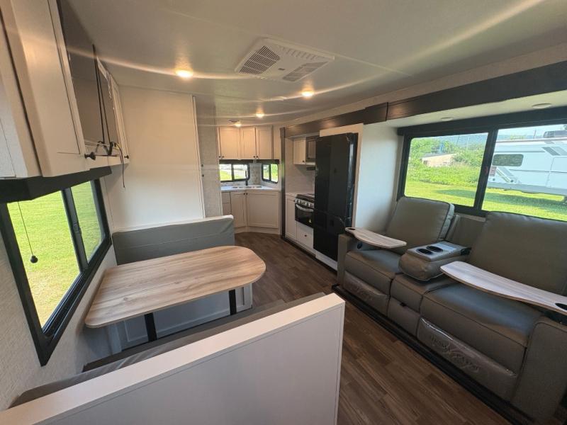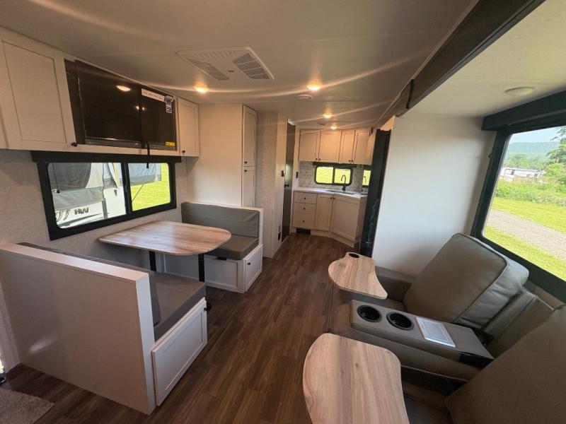 Enjoy a comfortable camping trip in this travel trailer! You will get a good night's rest each night on the front queen bed which has storage underneath it and wardrobes on either side of it. The tri-fold sofa and booth dinette can also transform into extra sleeping spaces if needed, plus the sofa has the perfect view of the entertainment center. Prepare delicious home cooked meals with the three burner cooktop and store any leftovers in the 10 cu. ft. refrigerator. After a fun day at the beach you can freshen up with the tub in the rear corner bathroom. The exterior not only has an oversized pass-through storage with motion lighting, but also a docking station and a 19' power awning!