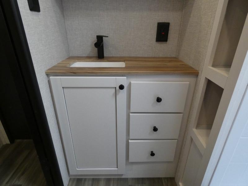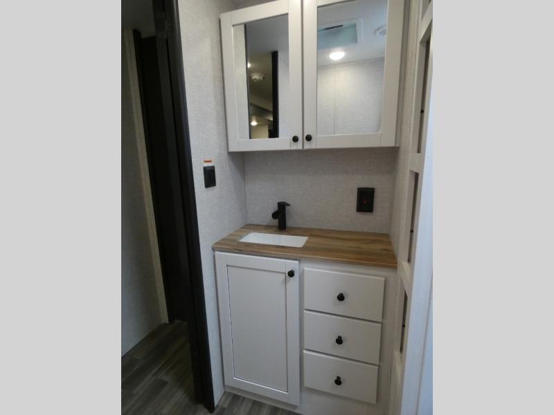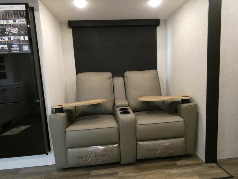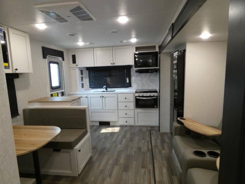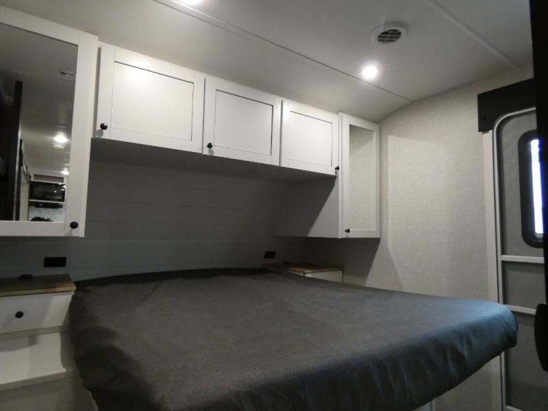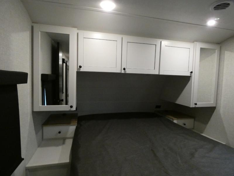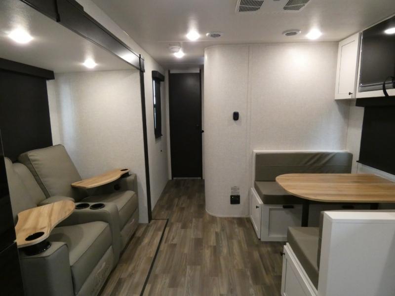 It is easy to enter and exit this travel trailer with the dual entry doors! One of the entrances leads directly into the front private bedroom which has a queen bed with wardrobes on either side, and the other entrance leads into the rear kitchen where you can prepare your best home cooked meals. Enjoy your meals at the booth dinette then play a card game or relax on the theater seats. Rinse the sand out of your hair with the shower in the full bathroom and keep your towel close by with the linen closet. Enjoy your beautiful scenery rain or shine as you relax in a chair underneath the 21' power awning!