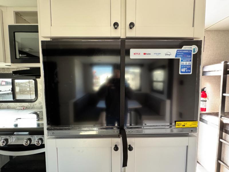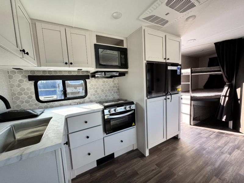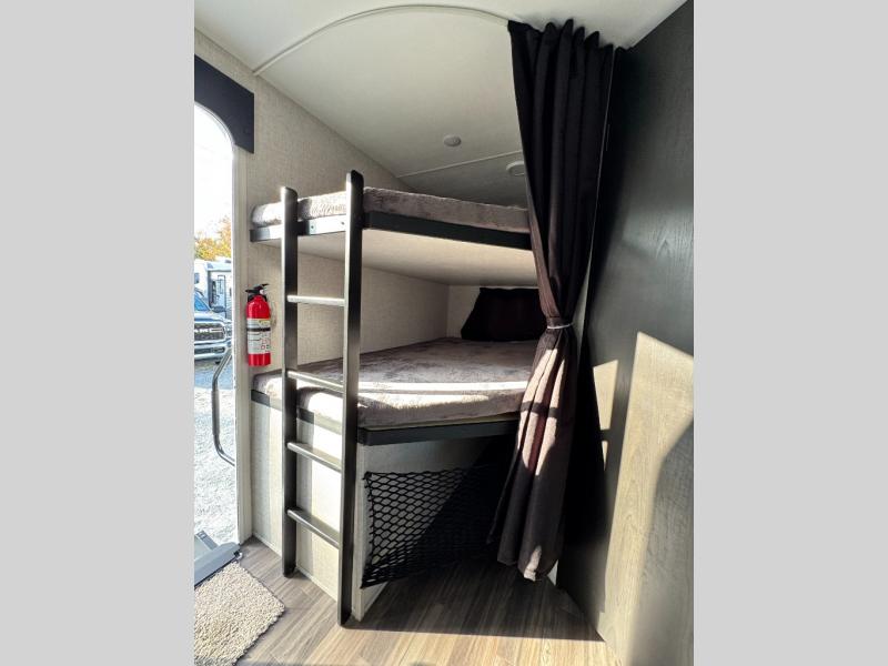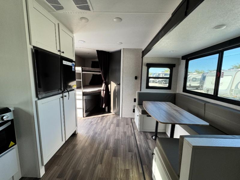 2025 JAYCO Highland Ridge RV Range Lite travel trailer 241BH: The whole gang can camp together in this travel trailer! Everyone will have a comfortable place to sleep between the rear corner set of double-size bunk beds, the queen bed inside the front private bedroom, and even the U-shaped dinette once converted. Behind the entertainment center there is a closet for your storage needs and the kitchen pantry is big enough to store everyone's favorite snacks. The chef will enjoy cooking with the three burner cooktop and 17" oven inside but enjoy cooking at the outside kitchen even more!