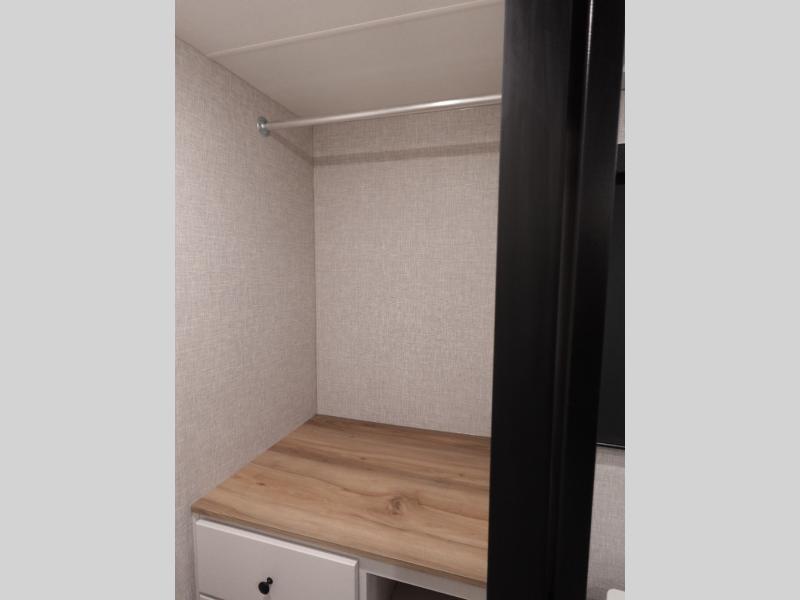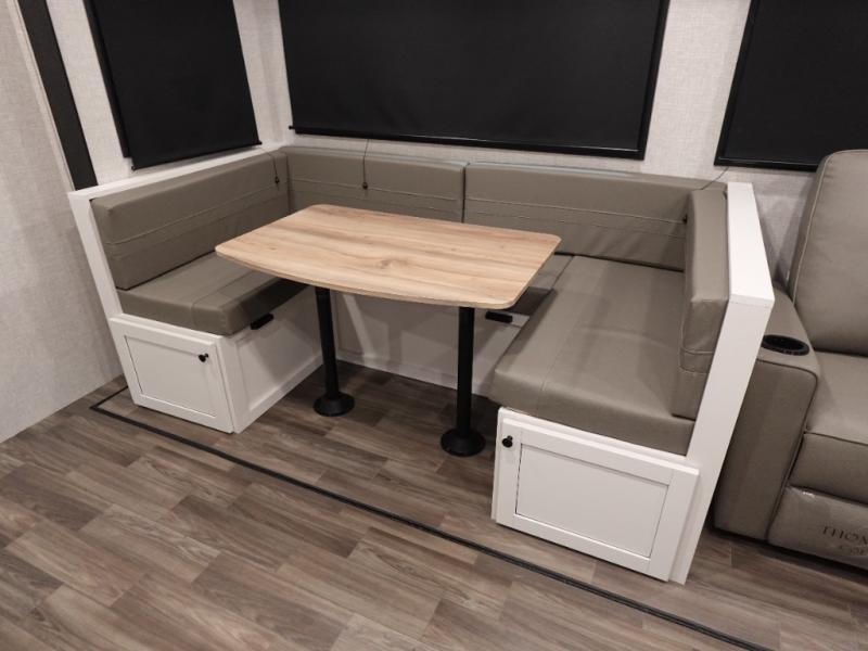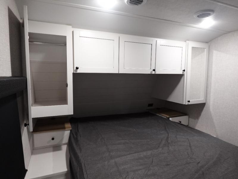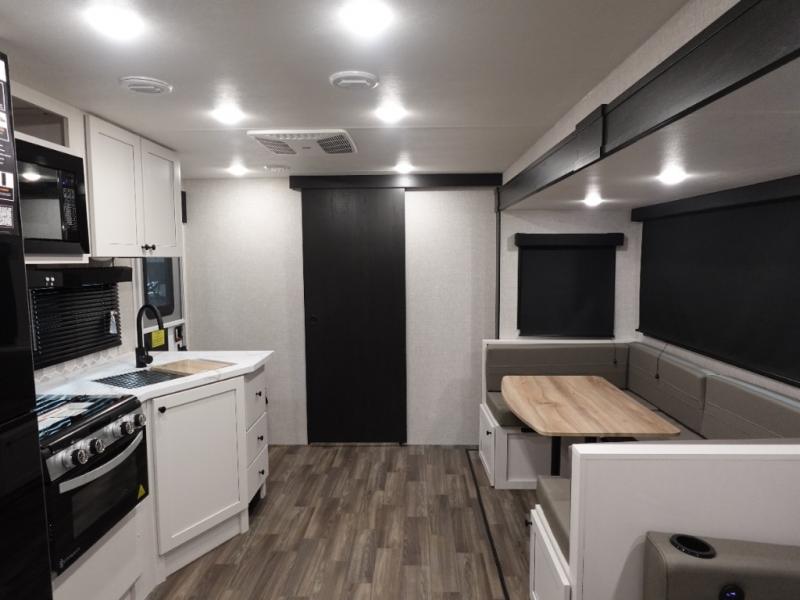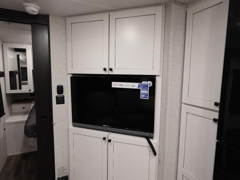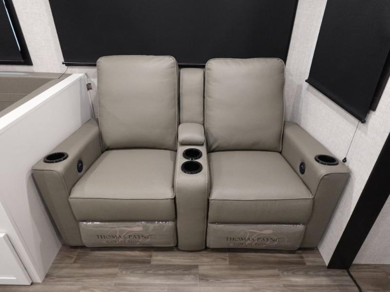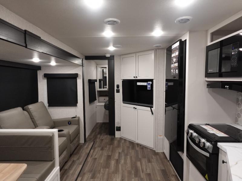 You will love all that this travel trailer has to offer! From the dual entry doors to the full rear bathroom with a radius shower and a large walk-in closet to keep your linens close. Prepare your best meals with the three burner cooktop and 17" oven then enjoy them at the U-shaped dinette and play a card game after dinner or you can relax on the theater seats and watch your favorite movie on the smart HDTV. The front private bedroom has a queen bed, wardrobes on either side for your hang up clothes, and even an entrance/exit door to quietly slip out for a quick fishing trip in the early mornings!