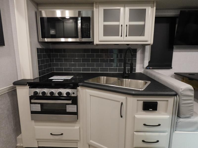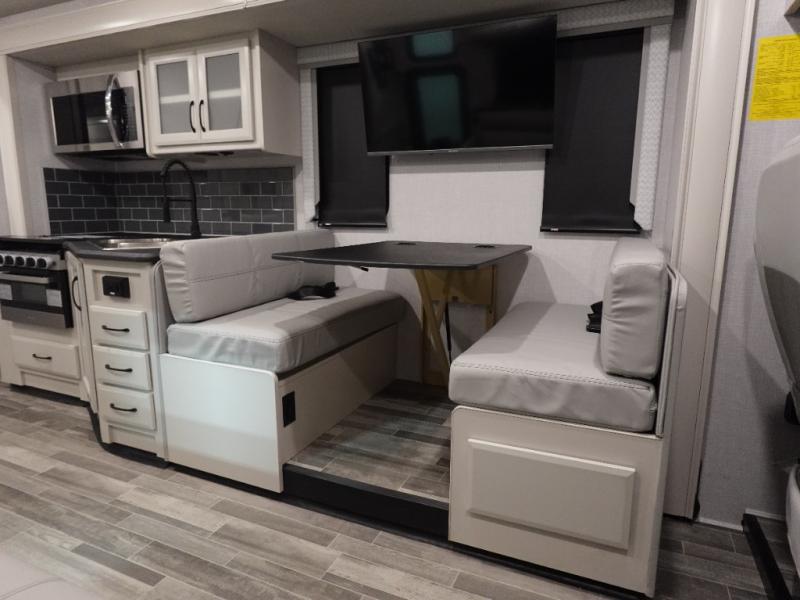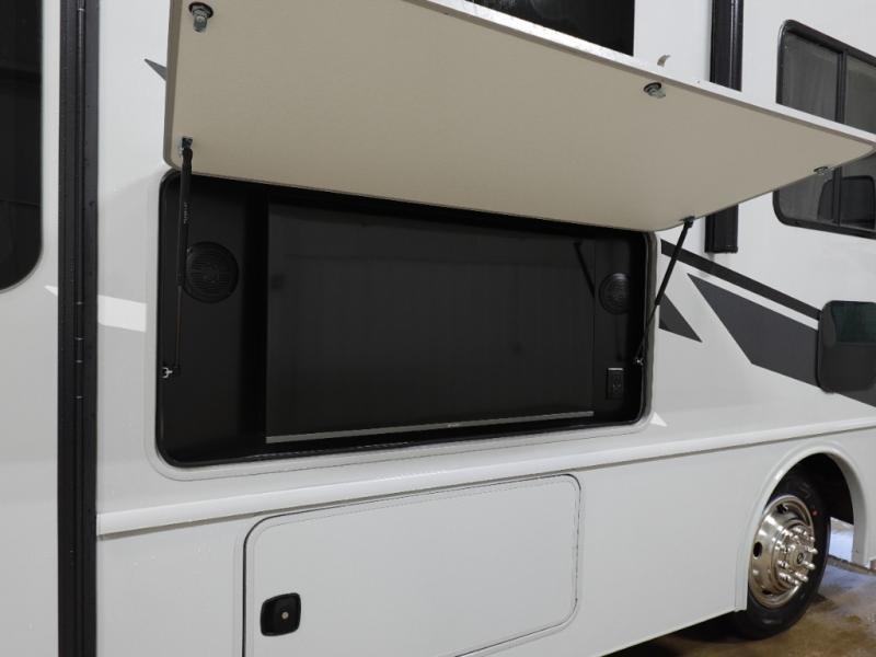 Enjoy a home on wheels with this motorhome! It features a rear corner private bedroom with a Serenity Series 72" x 74" king bed slide to lay your head at night and an LED TV for a comfortable movie night. The jackknife sofa offers a comfortable place to sleep once converted and the Hide-A-Loft drop down electric bed is another comfortable place to two others to sleep. You can even convert the Dream Dinette when you're not using it to enjoy a meal or play a card game. Everyone can freshen up in the rear corner bathroom with the 34" x 22" shower with a skylight above for natural lighting. A few cab conveniences that will make your traveling go smoother include an automotive style dash with work station, electronic cruise control, and a Sony stereo with AM/FM/Bluetooth and a backup camera screen!