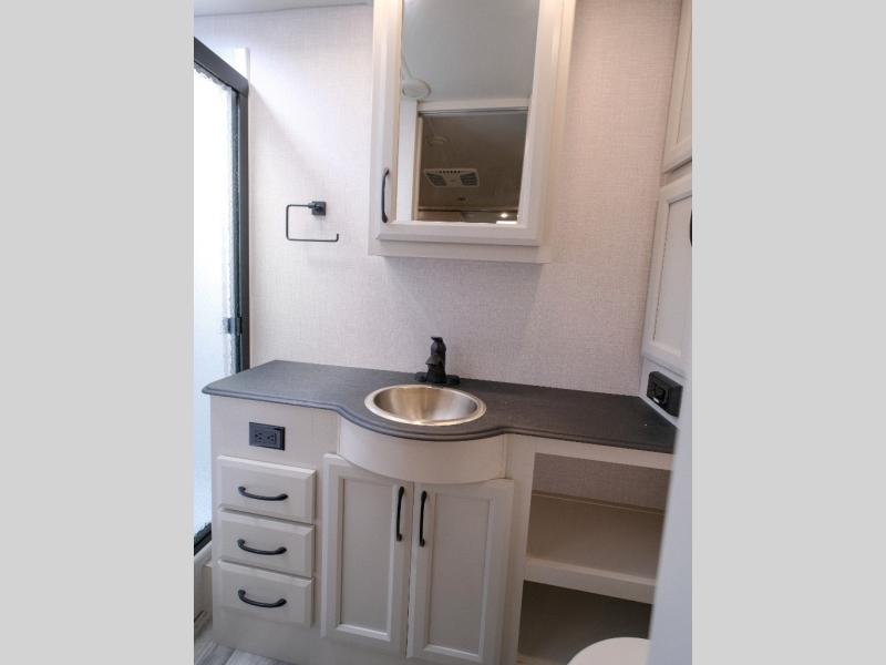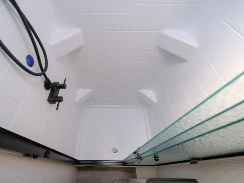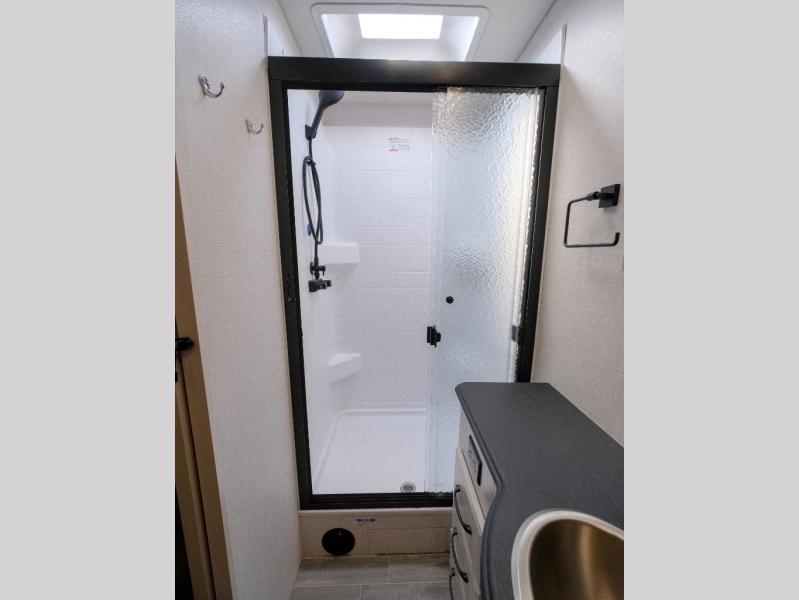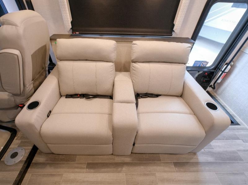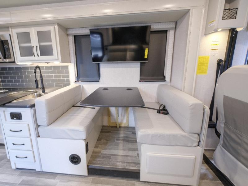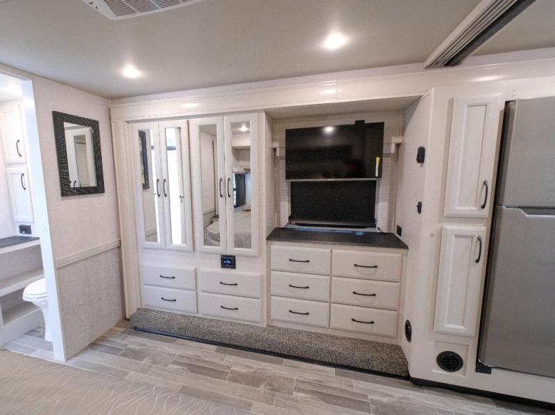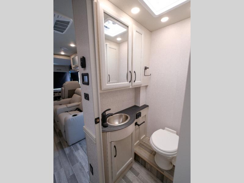 It's a clean decision to take this motorhome out on your adventures with a bath and a half! The full rear bathroom has a 30" x 36" shower to freshen up in each morning and creates a master suite by connecting to the private bedroom which has a Serenity Series king bed slide across from a wardrobe and dresser with an LED TV to watch movies in true comfort. The half bathroom is conveniently located by the fully equipped kitchen so you can take a bathroom break without worrying about your food cooking on the three burner cooktop. Enjoy your delicious meals on the Dream Dinette then relax on the theater seats or head outside to watch the big game at the exterior entertainment center with LED TV. You even have exterior storage space to bring along all of your essentials!