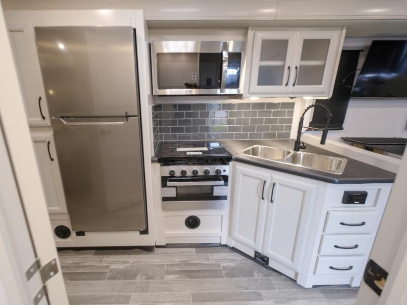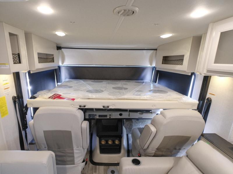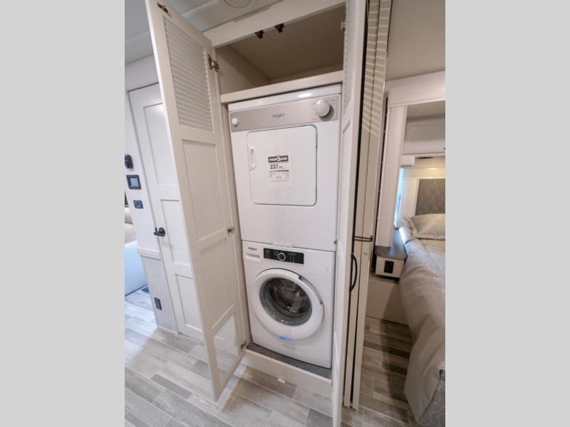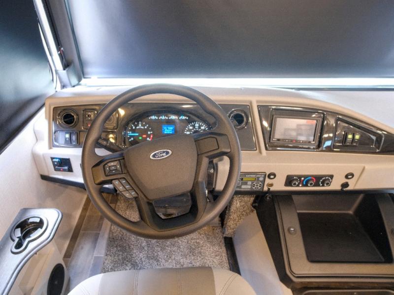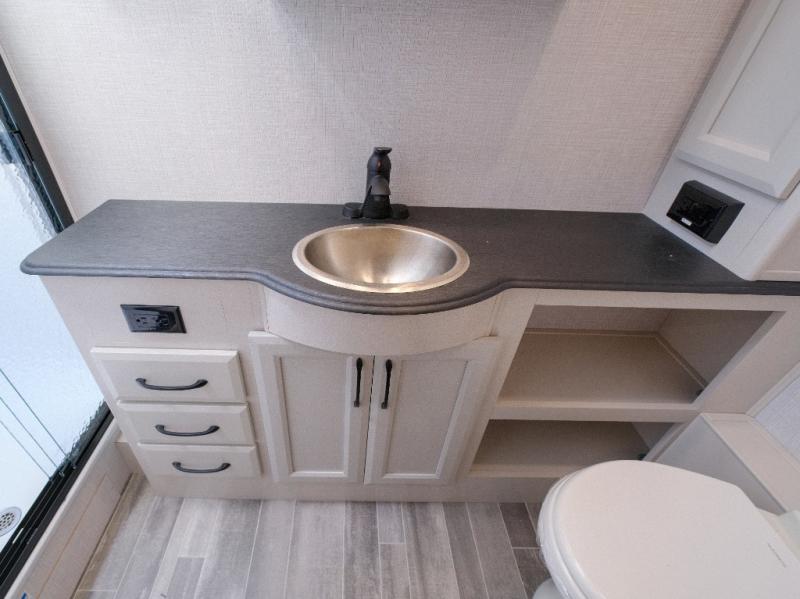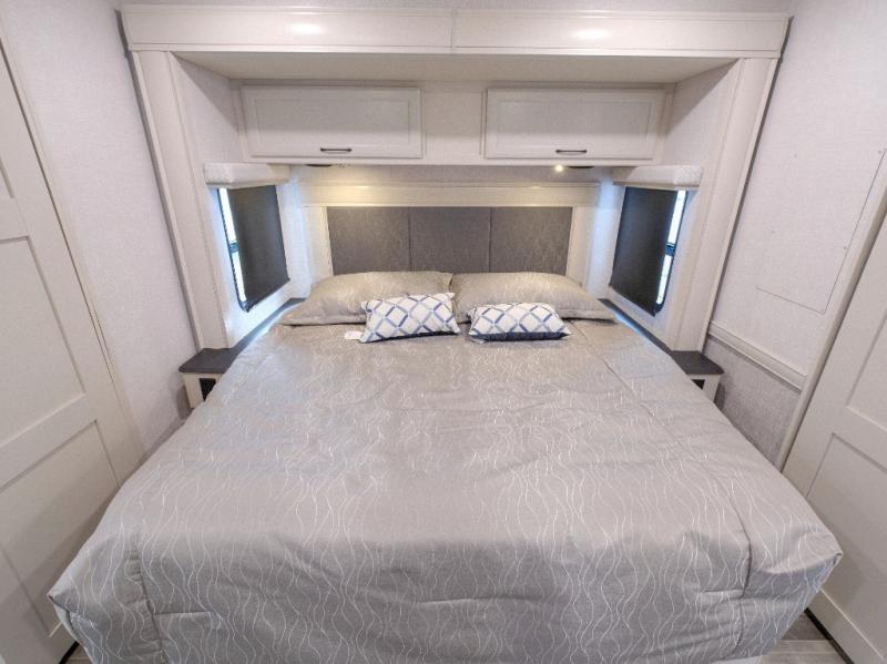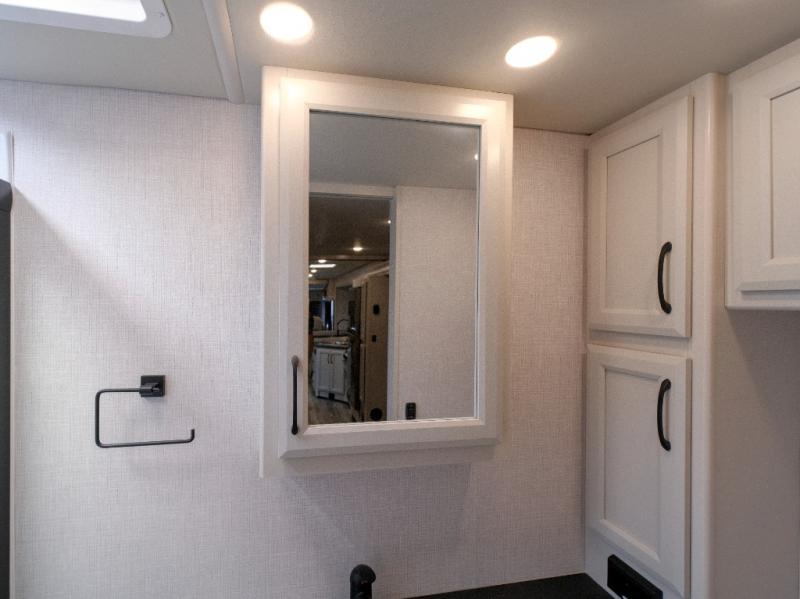 It's a clean decision to take this motorhome out on your adventures with a bath and a half! The full rear bathroom has a 30" x 36" shower to freshen up in each morning and creates a master suite by connecting to the private bedroom which has a Serenity Series king bed slide across from a wardrobe and dresser with an LED TV to watch movies in true comfort. The half bathroom is conveniently located by the fully equipped kitchen so you can take a bathroom break without worrying about your food cooking on the three burner cooktop. Enjoy your delicious meals on the Dream Dinette then relax on the theater seats or head outside to watch the big game at the exterior entertainment center with LED TV. You even have exterior storage space to bring along all of your essentials!