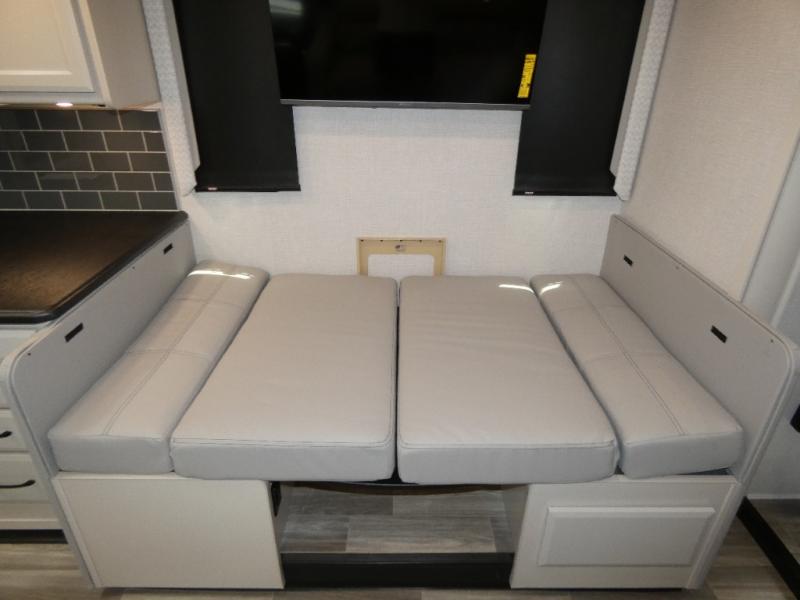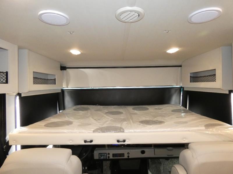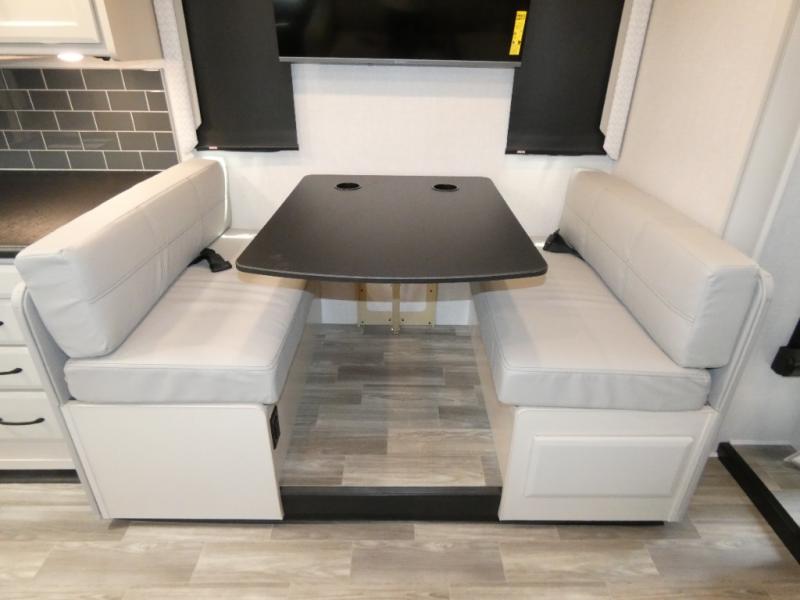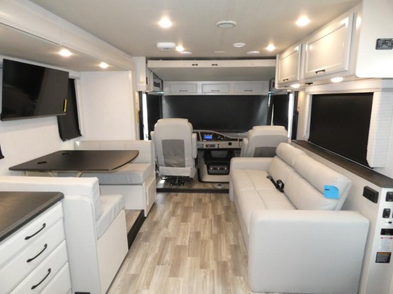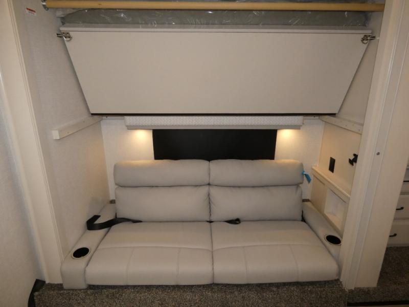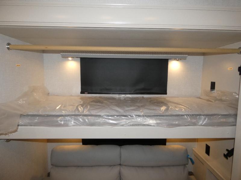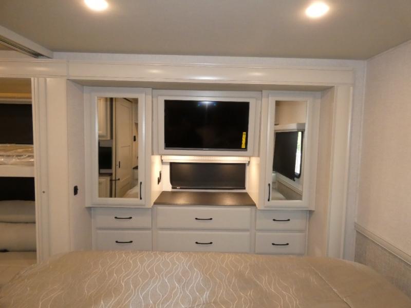 You can bring the whole family with you in this motorhome! The rear private bedroom has a Serenity Series RV king bed to lay your head on at night across from an LED TV with storage and wardrobes on either side of it. There are more sleeping spaces between the Hide-A-Loft electric drop down bunk over the cab, the living area jackknife sofa, and the flip-up top bunk above the jackknife sofa which has a LED TV and entertainment center. You could even transform the Dream Dinette into an extra sleeping space when you aren't using it to enjoy a meal prepared with the galley extension, the three burner cooktop, and the residential refrigerator. Everyone can freshen up in the full bathroom with the 34" x 22" shower and keep your towels close by with the linen closet inside too!