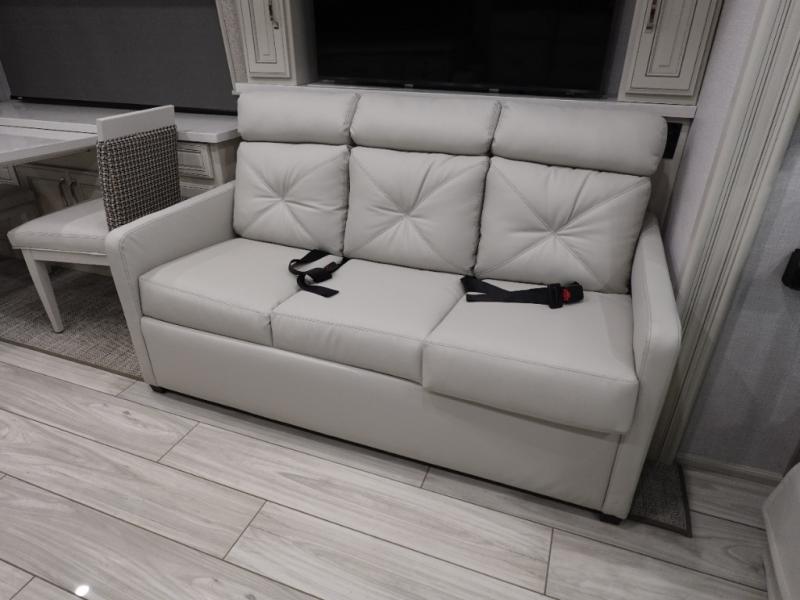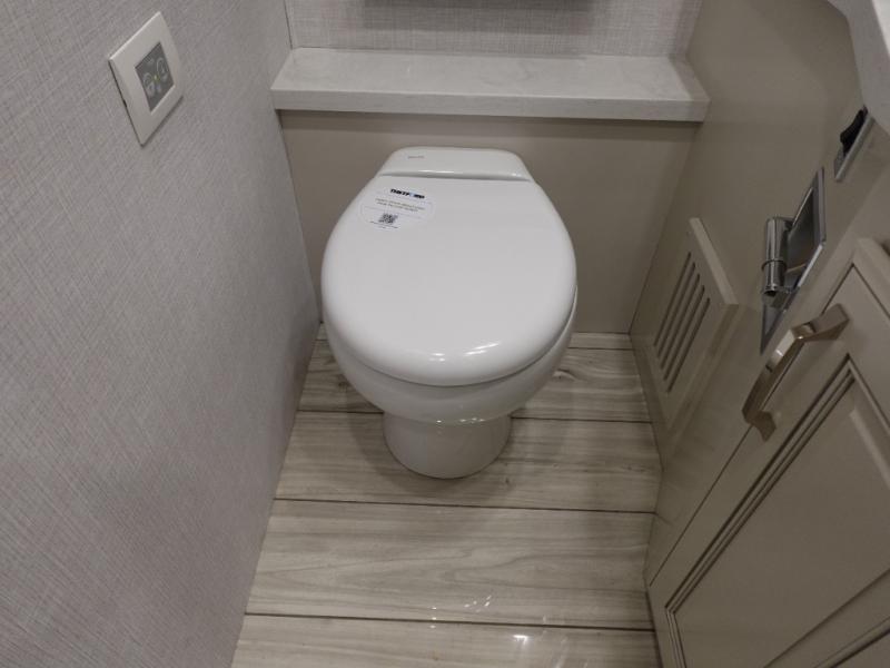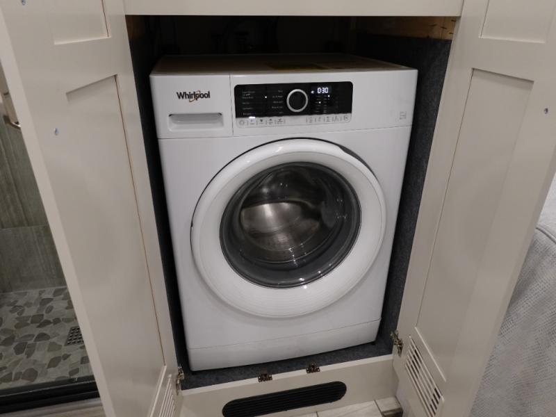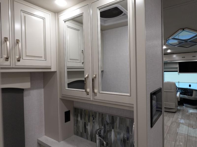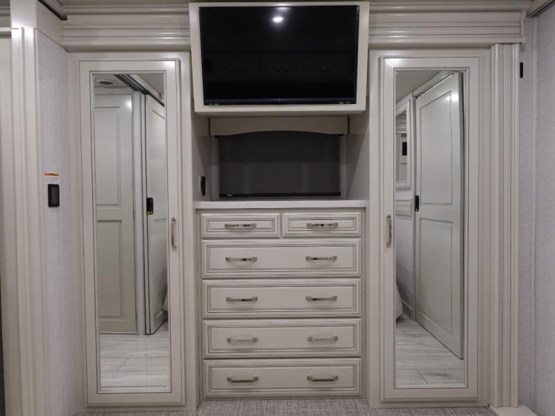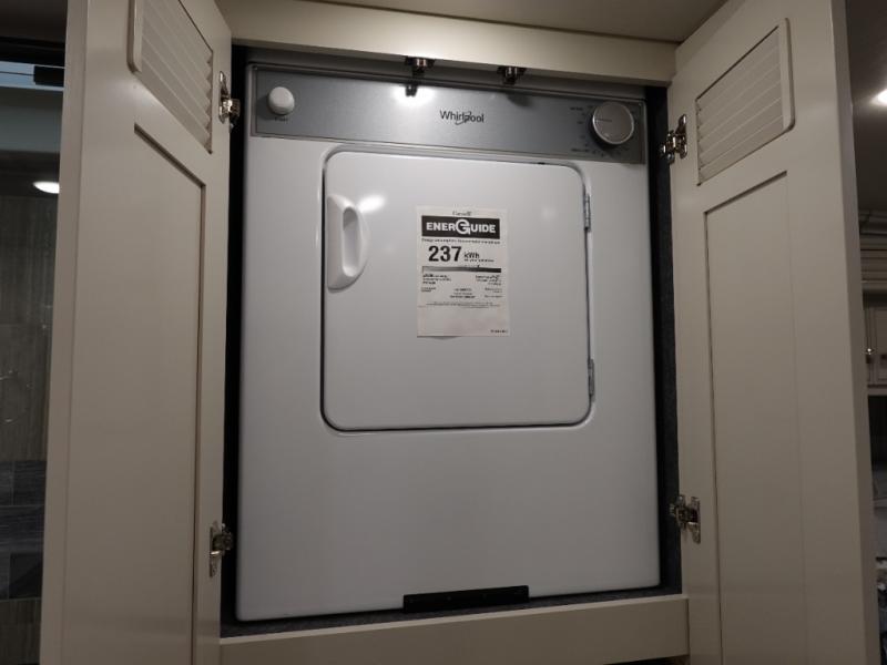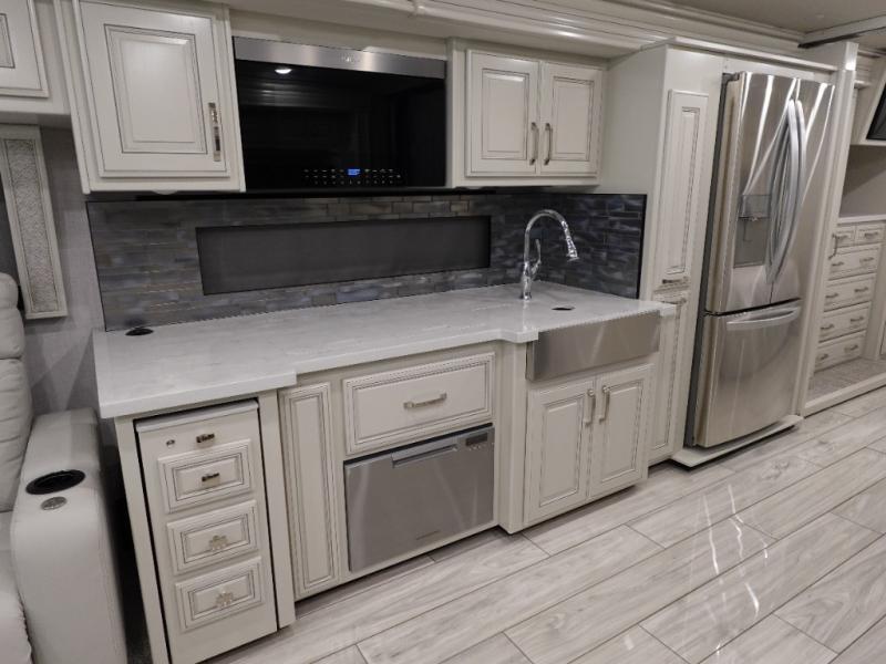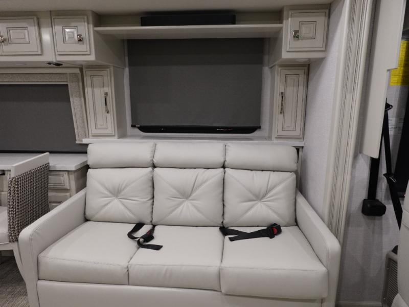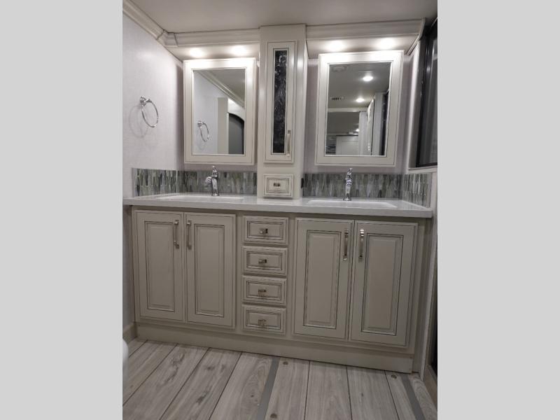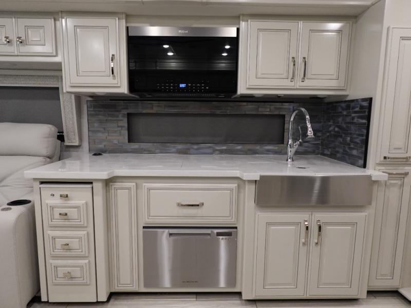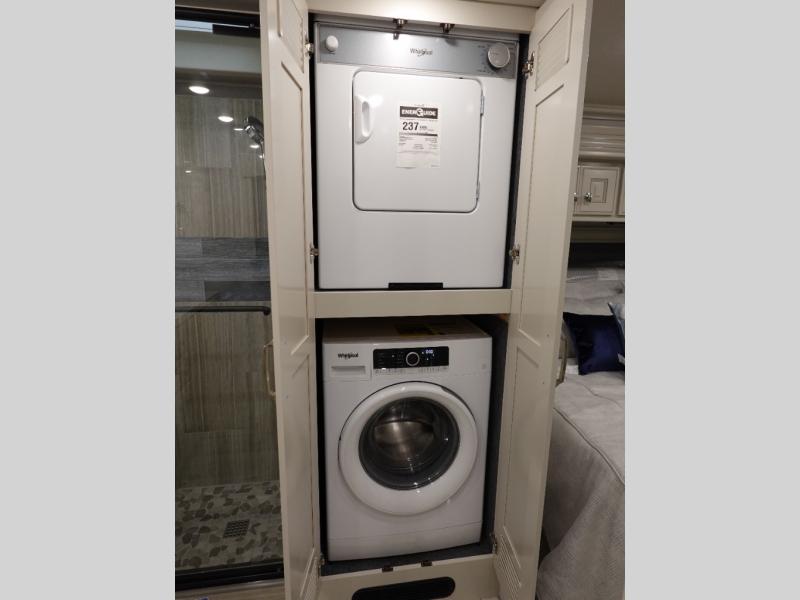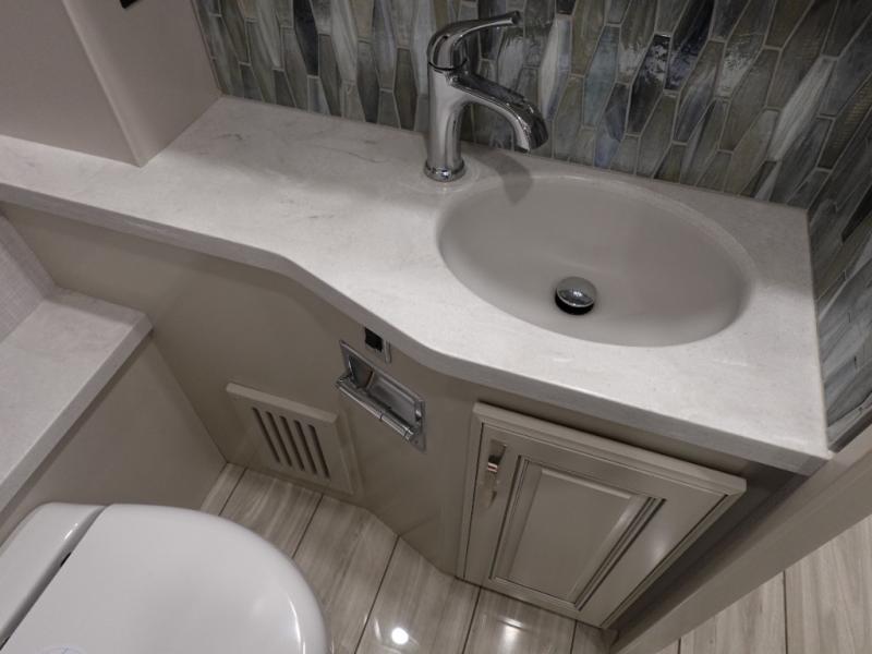 The luxury on this Armada Class A diesel motorhome will amaze you! The first luxurious details you'll notice are the full and half bathroom. The full bathroom sits back in the master suite, and it contains a dual-sink vanity so that you have your own place to get ready while your spouse does as well. This full bathroom also has a 50" x 28" shower with seat and a stackable washer/dryer, so you'll be living the high-class life. The kitchen is the next section that will catch your eye with its pull-out pantry, convection microwave, residential refrigerator with ice/water in the door, and a dishwasher. You won't even skip a beat going from home to coach when preparing meals. The living area is quite comfortable with its sofa sleeper with a pull-out full mattress, a loveseat with storage, and free-standing dinette with credenza.