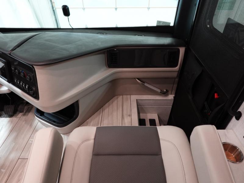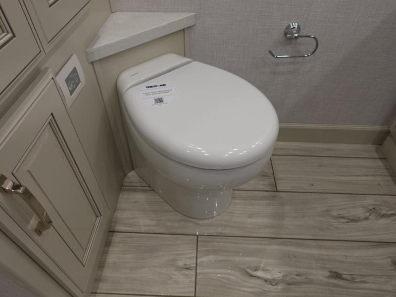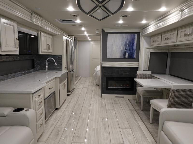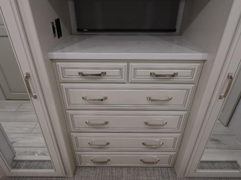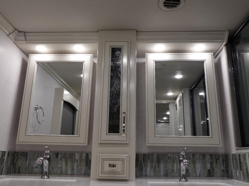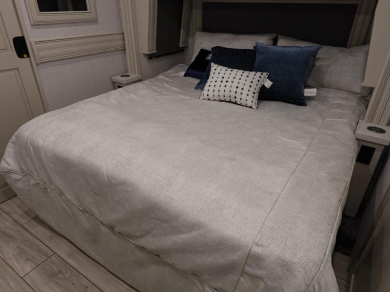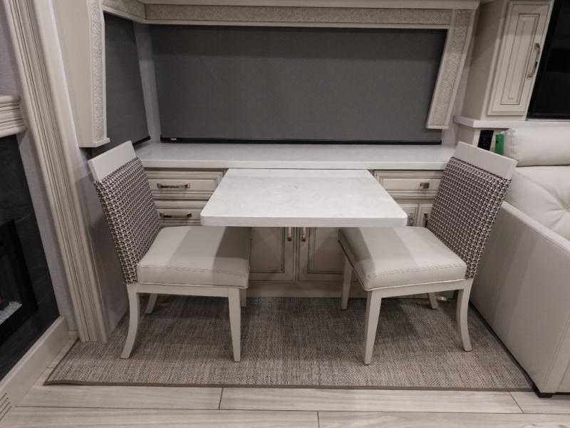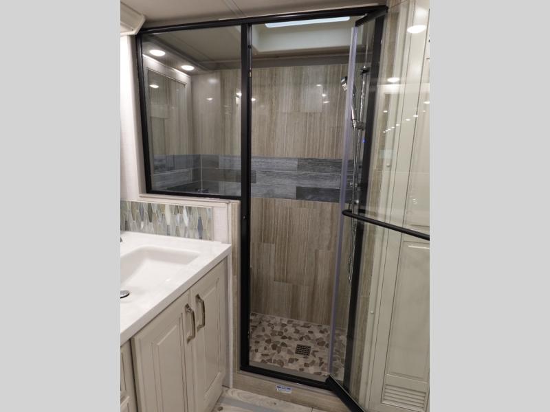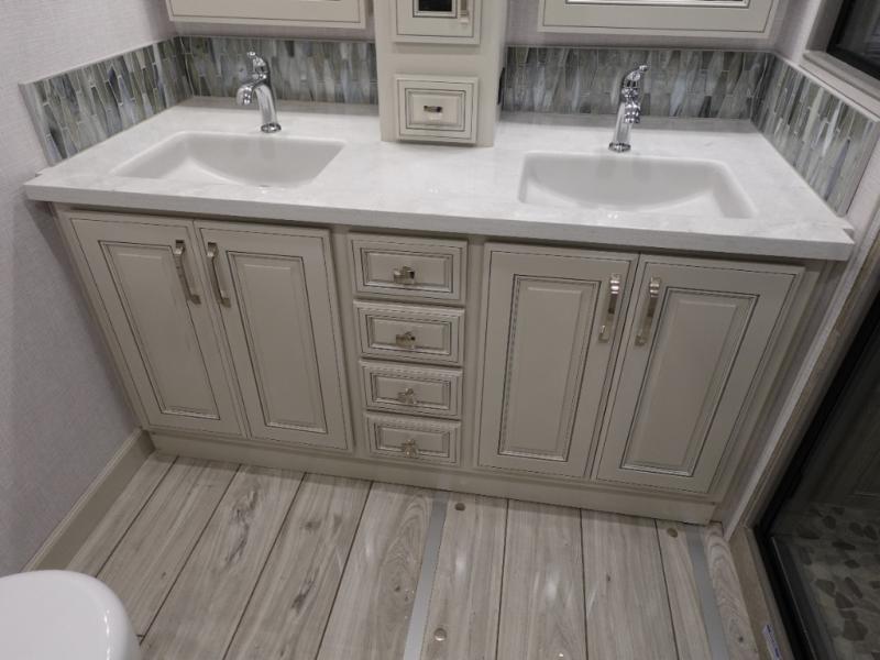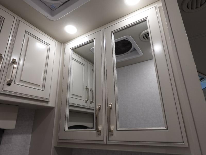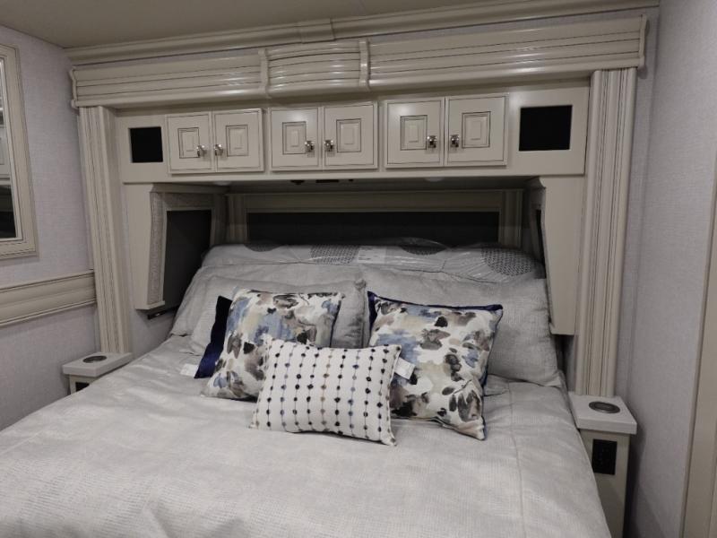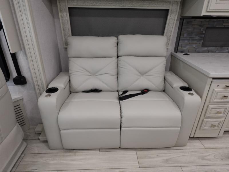 The luxury on this Armada Class A diesel motorhome will amaze you! The first luxurious details you'll notice are the full and half bathroom. The full bathroom sits back in the master suite, and it contains a dual-sink vanity so that you have your own place to get ready while your spouse does as well. This full bathroom also has a 50" x 28" shower with seat and a stackable washer/dryer, so you'll be living the high-class life. The kitchen is the next section that will catch your eye with its pull-out pantry, convection microwave, residential refrigerator with ice/water in the door, and a dishwasher. You won't even skip a beat going from home to coach when preparing meals. The living area is quite comfortable with its sofa sleeper with a pull-out full mattress, a loveseat with storage, and free-standing dinette with credenza.