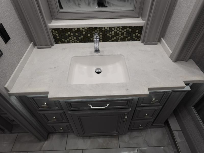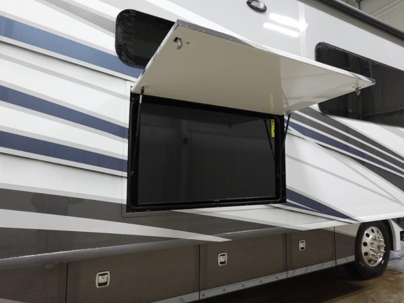 If you think glamping is the way to go, you're going to have to see what the Holiday Rambler Armada Class A diesel motorhome has in store for you! The Armada has been constructed with a Powerlock system, a Dryseal edge coating, a vacu-bond aluminum-framed constructed roof, sidewalls, and floor, as well as having a premium gel exterior Vetrosina fiberglass skin. The exterior service station includes a water pump switch, exterior shower, black tank flush, city water hookup, towel holder, and drainage valves. Each model includes hassle-free electrical features, such as a Safe-T-View camera system, a whole coach water filtration system, and an impressive three 15,000 BTU A/C's to keep you comfortable all summer long. You'll love the luxurious interior that includes porcelain tile flooring, polished solid surface countertops, a comfortable king bed, plus many more eye-catching features!