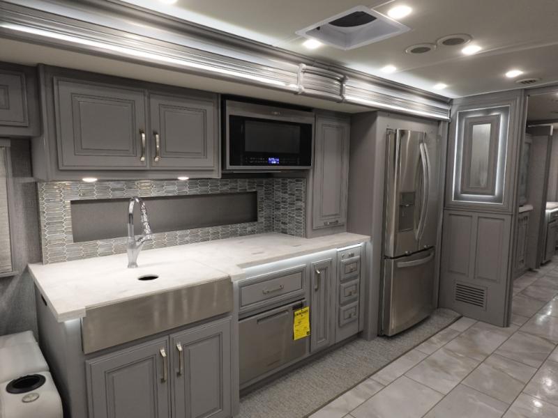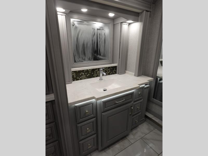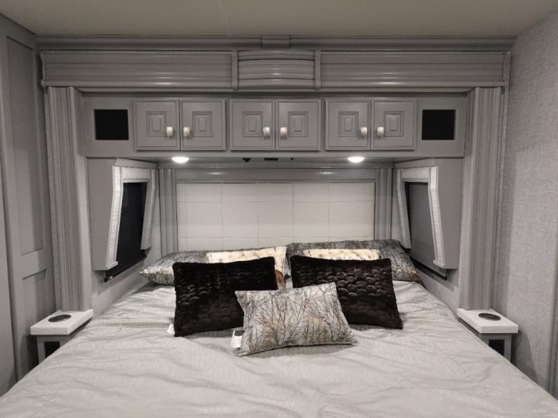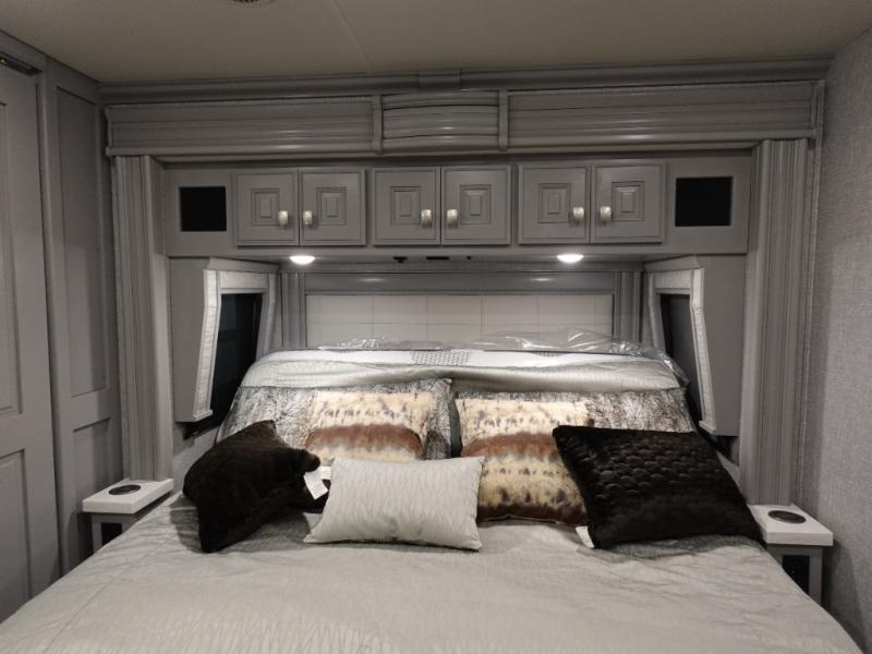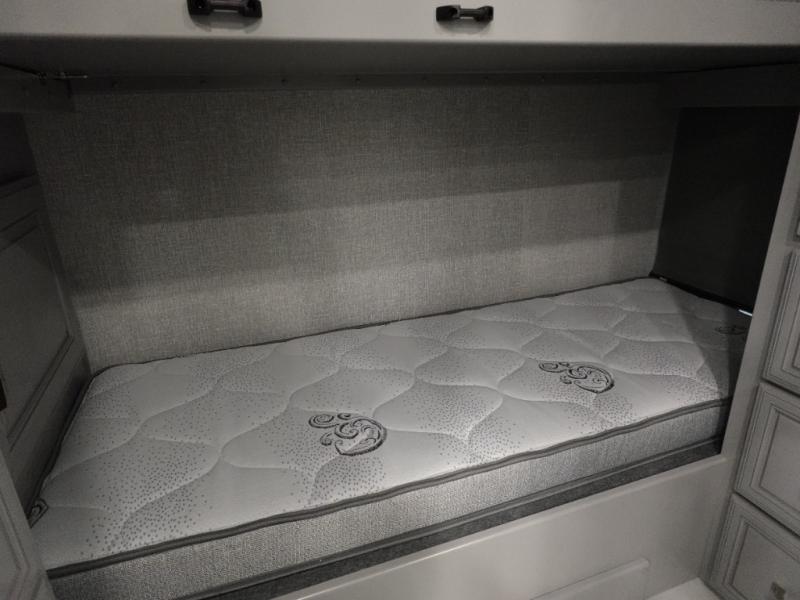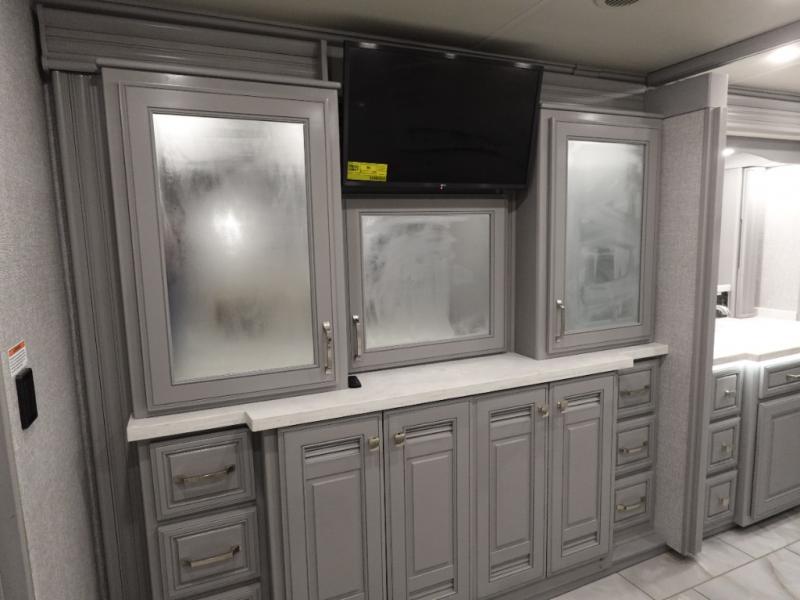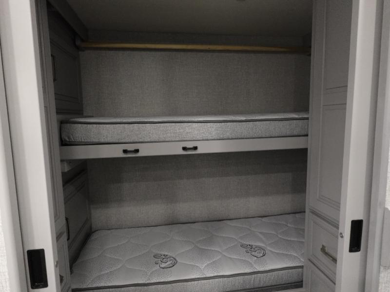 This Armada Class A diesel motorhome is filled with high-class amenities and luxurious furnishings! The back of this coach has a small private bunkhouse that is perfect for the kids or grandkids to spend the night in. Separating the bunkhouse from the master bedroom is a walk-through bathroom that allows campers from both bedrooms to have easy access at night. The master bedroom is undeniably comfortable with its Encore Series king bed, opposing slides, LED TV, dresser, and washer/dryer. Out in the main living area, you'll have more space once again with another set of opposing slides. These slides create lots of room for the theater seats, sofa sleeper with queen mattress, and U-shaped dinette. Spend some time getting a couple of meals together in the kitchen with the convection microwave and two-burner induction cooktop. You will also appreciate the residential refrigerator with ice and water in the door.