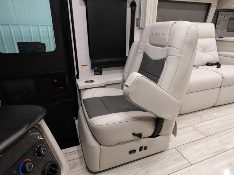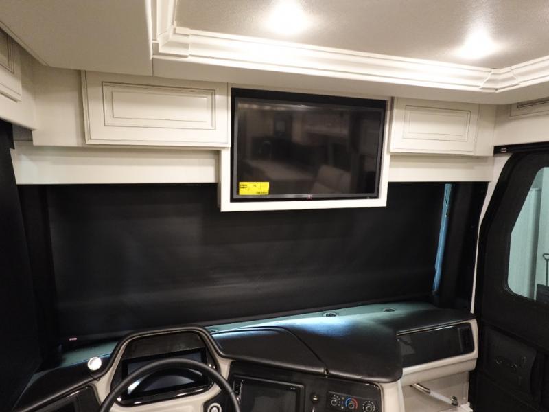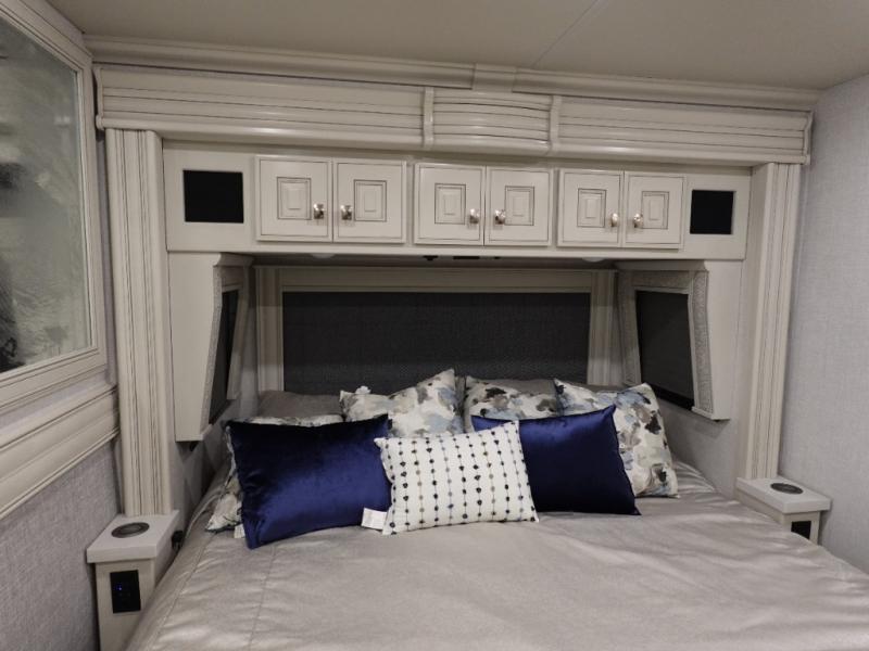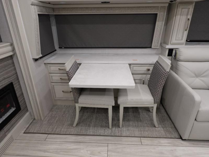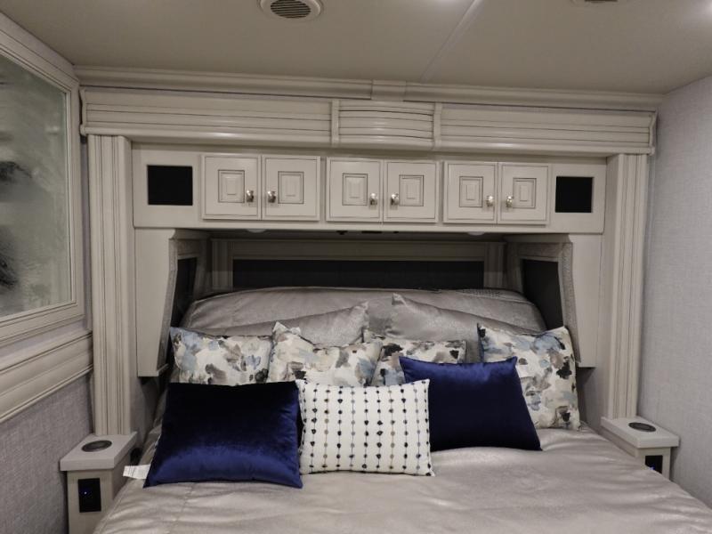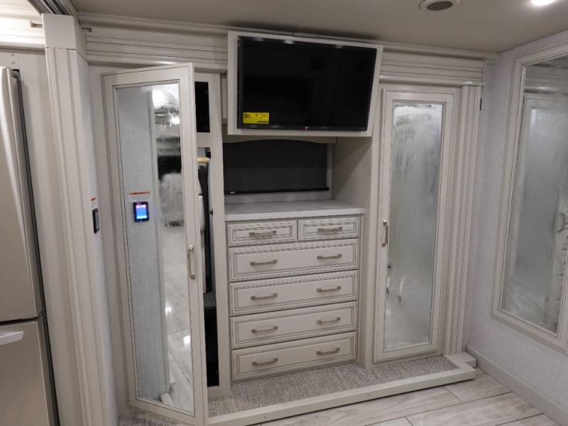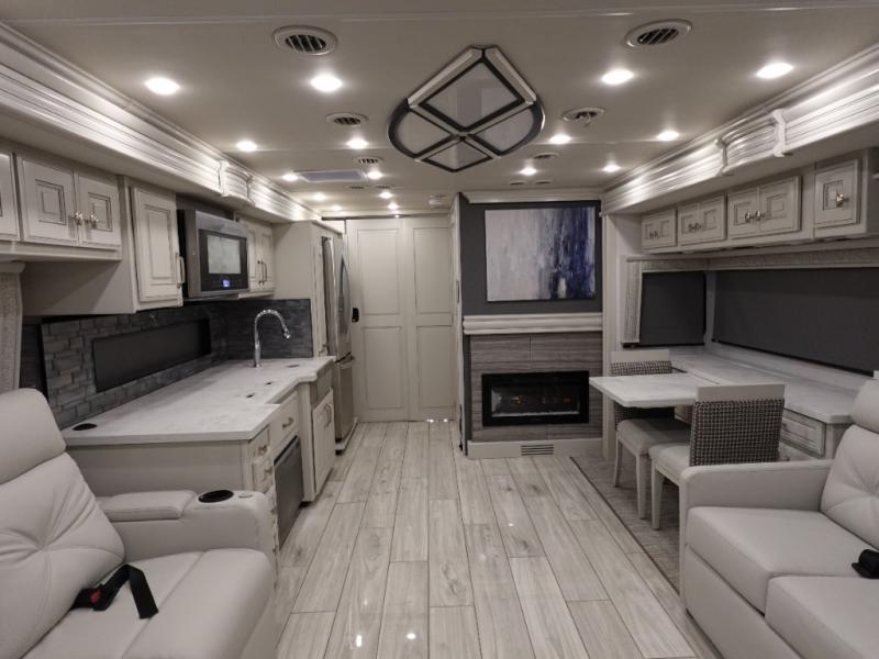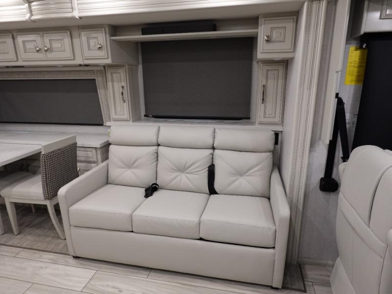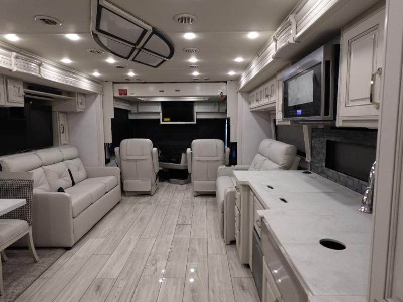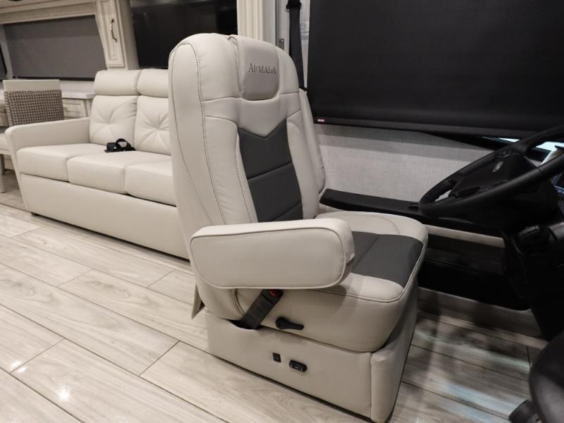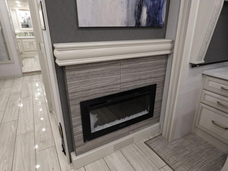 You are going to love this Armada Class A diesel motorhome! As the owners, you'll enjoy a magnificent oasis in the back of this coach with a high-class master suite. The bedroom is connected to a spacious master bathroom that has a dual-sink vanity, a private toilet within the bathroom, a 56" x 38" tile shower with seat, two linen closets, plenty of storage for toiletries, and a washer/dryer. Now isn't that amazing? The bedroom is also filled with comfort as it contains an Encore Series king bed, opposing slides, an LED TV, two wardrobes, and a dresser. Not only is there a full bathroom back in the master suite, but there is an additional half bath out in the main living area which will be useful for anyone else traveling with you. The living area is ultra comfortable with its sofa sleeper with a pull-out full mattress, second sofa, free-standing dinette with credenza, fireplace, and pop-up LED TV. There is even an additional TV above the cab for your viewing pleasure.