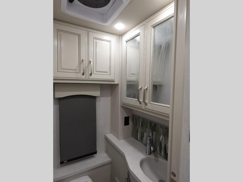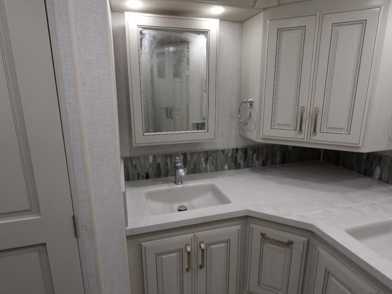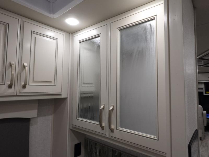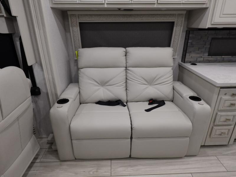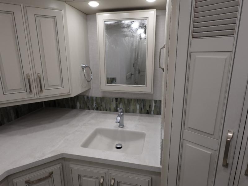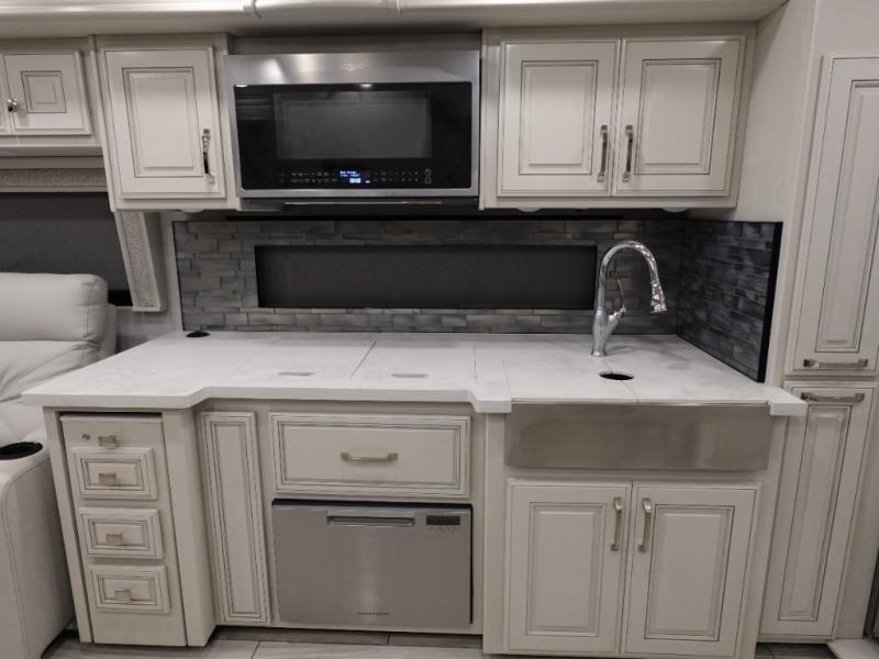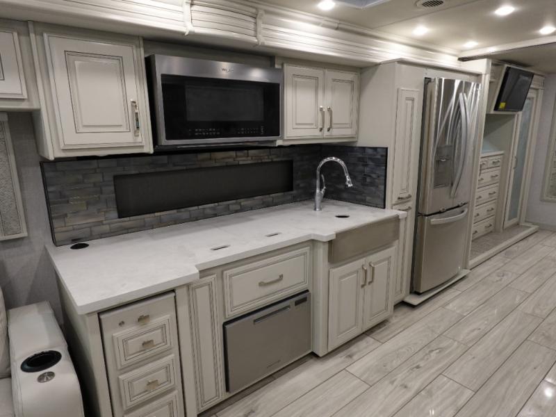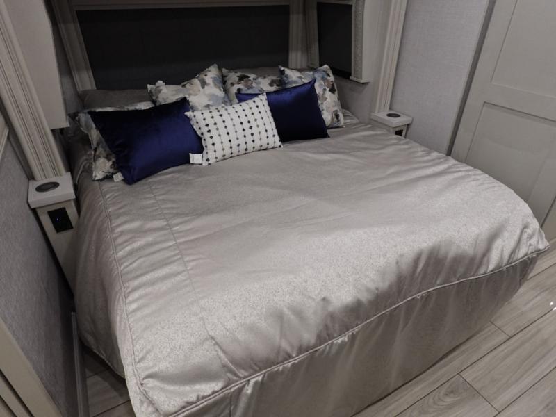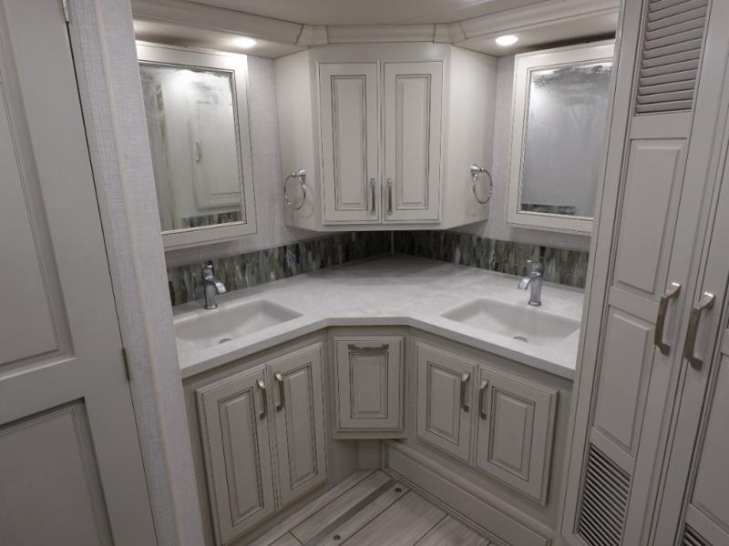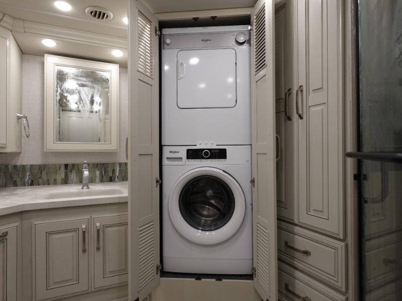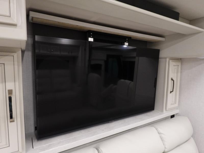 You are going to love this Armada Class A diesel motorhome! As the owners, you'll enjoy a magnificent oasis in the back of this coach with a high-class master suite. The bedroom is connected to a spacious master bathroom that has a dual-sink vanity, a private toilet within the bathroom, a 56" x 38" tile shower with seat, two linen closets, plenty of storage for toiletries, and a washer/dryer. Now isn't that amazing? The bedroom is also filled with comfort as it contains an Encore Series king bed, opposing slides, an LED TV, two wardrobes, and a dresser. Not only is there a full bathroom back in the master suite, but there is an additional half bath out in the main living area which will be useful for anyone else traveling with you. The living area is ultra comfortable with its sofa sleeper with a pull-out full mattress, second sofa, free-standing dinette with credenza, fireplace, and pop-up LED TV. There is even an additional TV above the cab for your viewing pleasure.