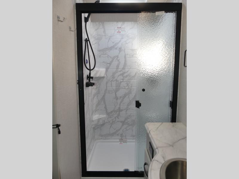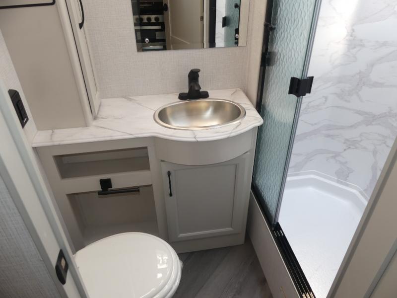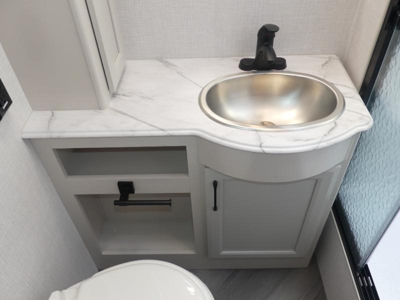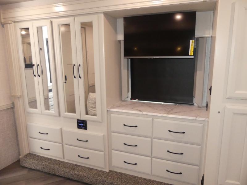 Traveling with friends and family has never been easier than in this spacious coach! You will find two slide outs plus two full baths for maximum convenience. The Serenity Series king bed will provide a great night's rest, while your guests take the Hide-A-Loft electric drop-down bed, the theater seats, and the Dream Dinette. Once everyone is ready for the day, head to the kitchen to prepare eggs and bacon on the three burner cooktop, or use the stainless steel over-the-range microwave oven if you're on the go. You'll also appreciate the pantry and stainless steel residential refrigerator for food storage, plus the double bowl stainless steel sink for easy clean up.