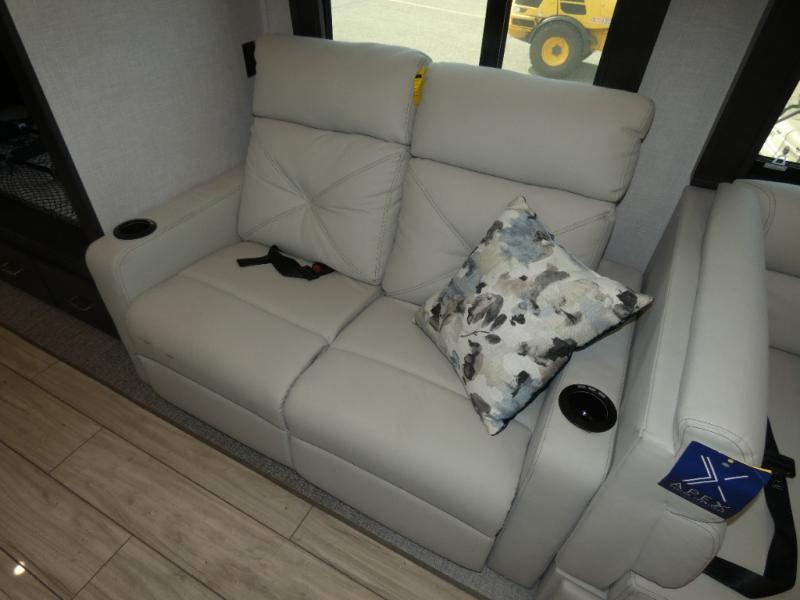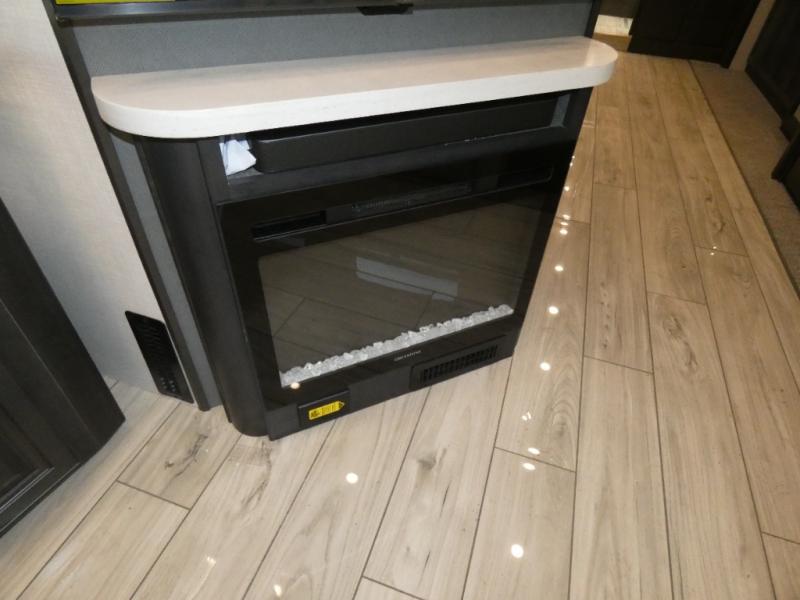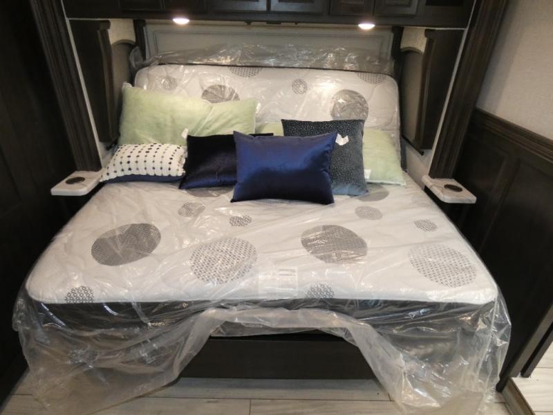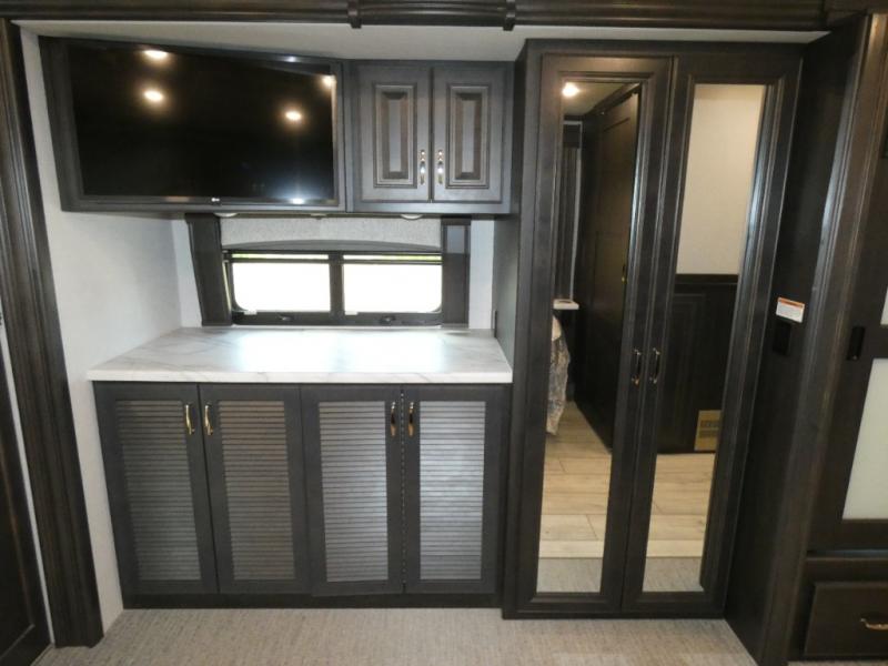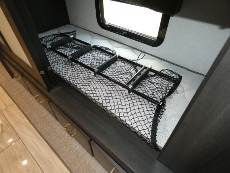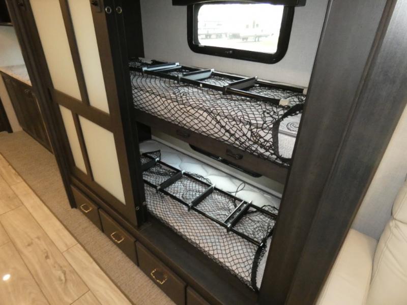 Looking to travel with friends and family in luxury? This coach provides space-saving convertible bunk beds with barn doors right across from the mid-coach full bathroom. The sofa sleeper with a twin mattress and the booth dinette allow you to relax and visit, plus the driver and passenger seats swivel for more seating in the main living and kitchen area. Everyone can watch the LED TV with a fireplace below and/or the LED TV over the cab, and there is another LED TV in the bedroom, plus an entertainment center with LED TV outside. The rear bathroom that is attached to the master bedroom has a wardrobe for your things, and the master bedroom allows you to sleep like a king on the slide out giving you more floor space. There is also a side-by-side washer/dryer that will keep everything clean while you're away. The kitchen offers stainless steel appliances, a convection microwave, a two burner induction cooktop and so much more. Start planning your trip today!