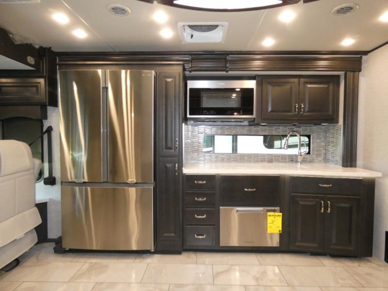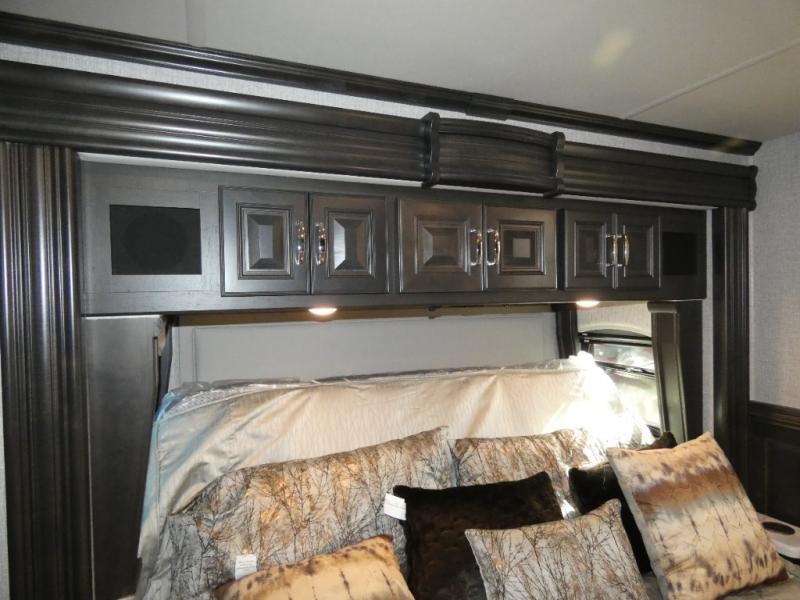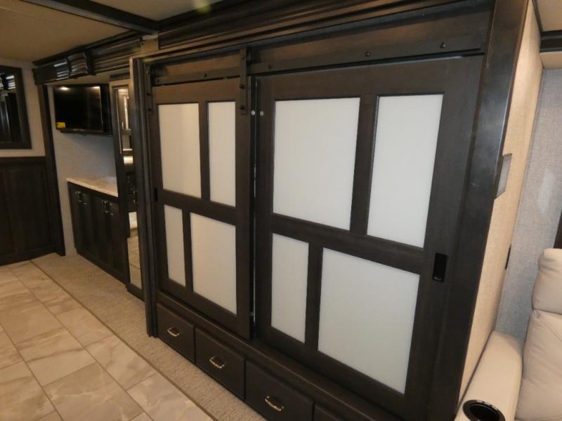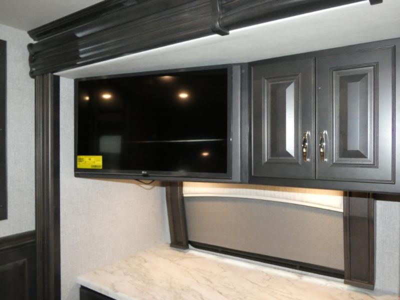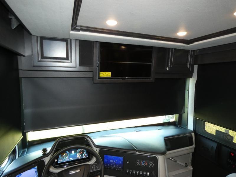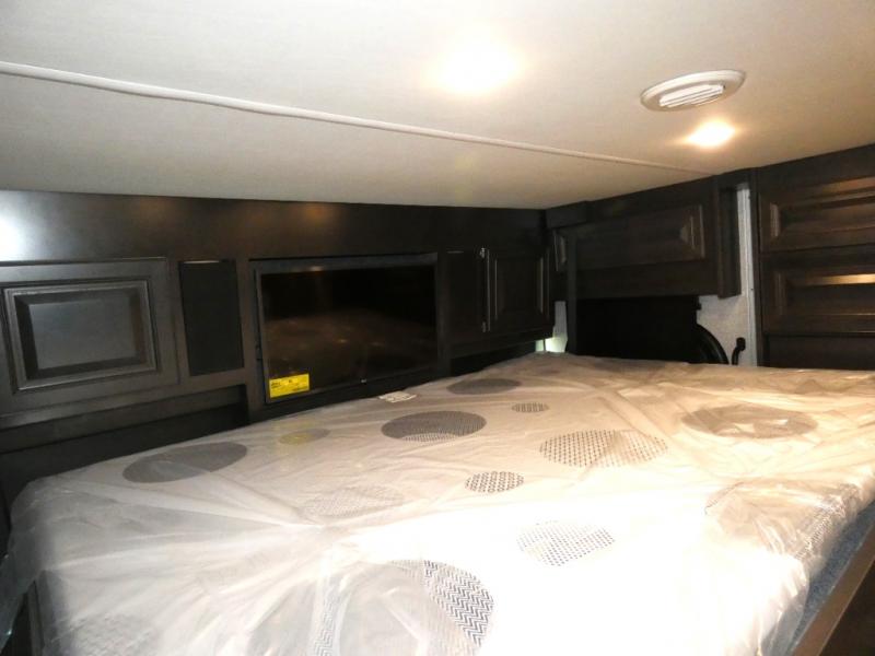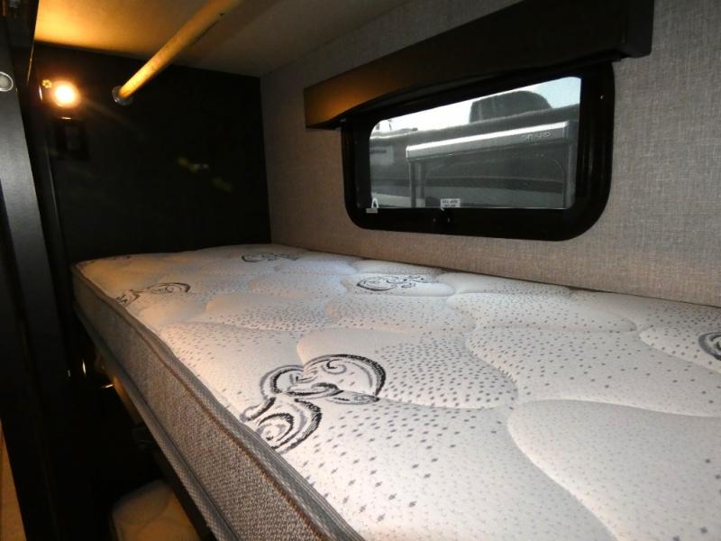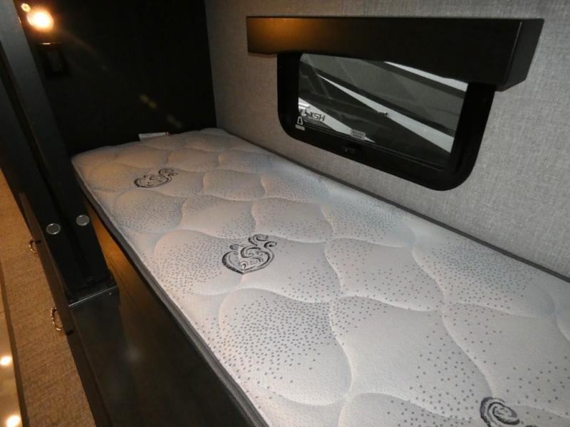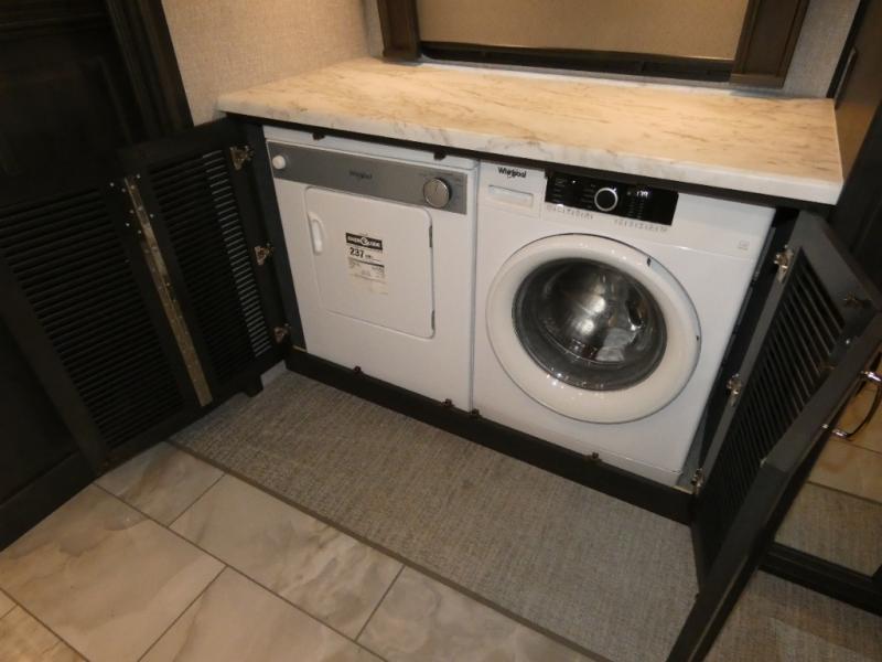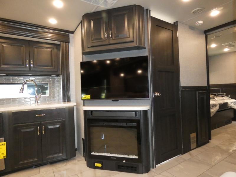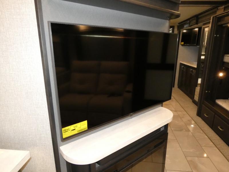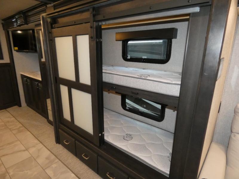 Looking to travel with friends and family in luxury? This coach provides space-saving convertible bunk beds with barn doors right across from the mid-coach full bathroom. You might even like to add the Hide-A-Bed power drop-down overhead bunk option to provide added sleeping space when the bunks and furniture aren't enough. The sofa sleeper with a twin mattress and the booth dinette allow you to relax and visit, plus the driver and passenger seats swivel for more seating in the main living and kitchen area. Everyone can watch the LED TV with a fireplace below and/or the LED TV over the cab, and there is another LED TV in the bedroom, plus an entertainment center with LED TV outside. The rear bathroom that is attached to the master bedroom has a wardrobe for your things, and the master bedroom allows you to sleep like a king on the slide out giving you more floor space. There is also a side-by-side washer/dryer that will keep everything clean while you're away. The kitchen offers stainless steel appliances, a convection microwave, a two burner induction cooktop and so much more. Start planning your trip today!
