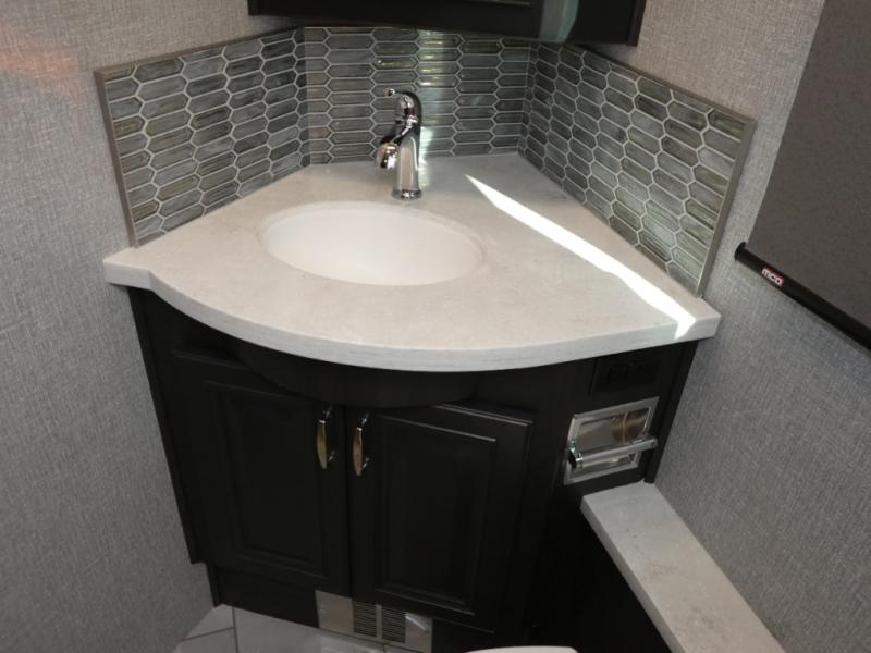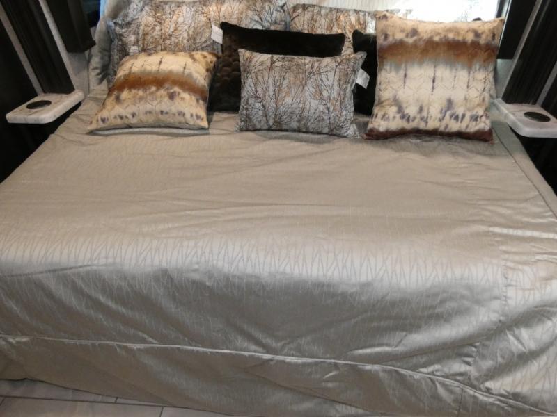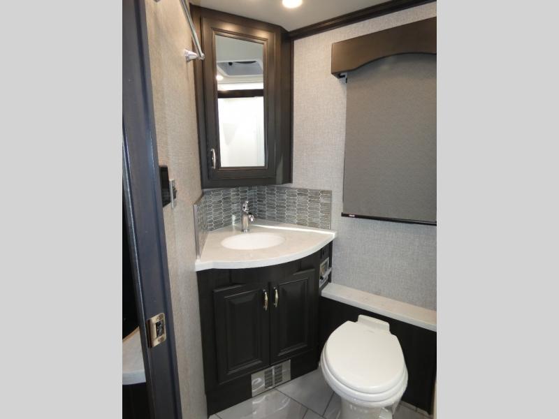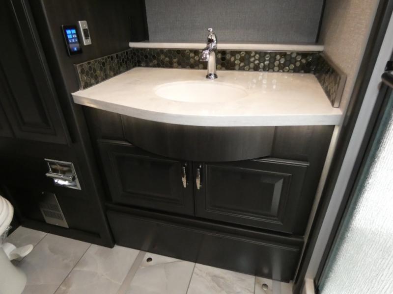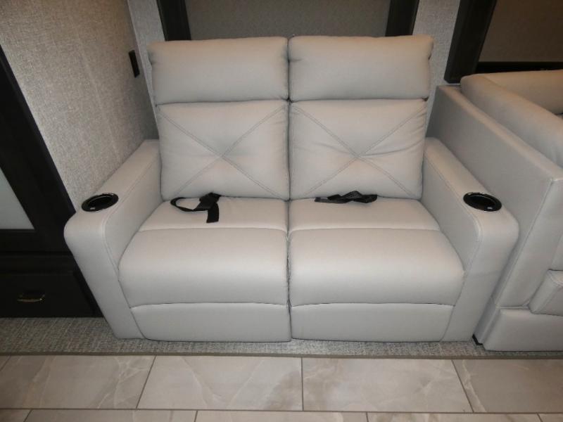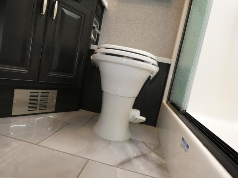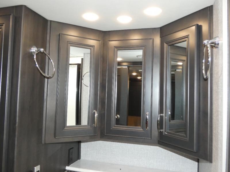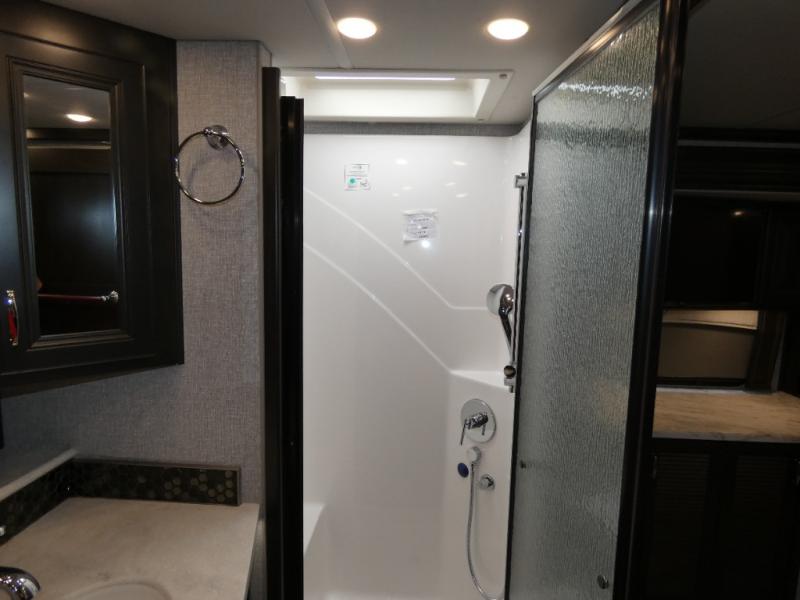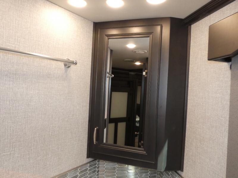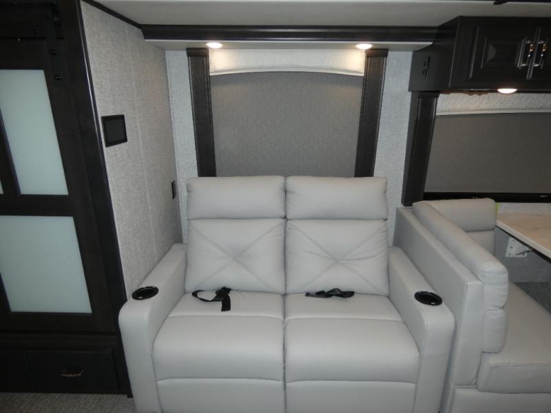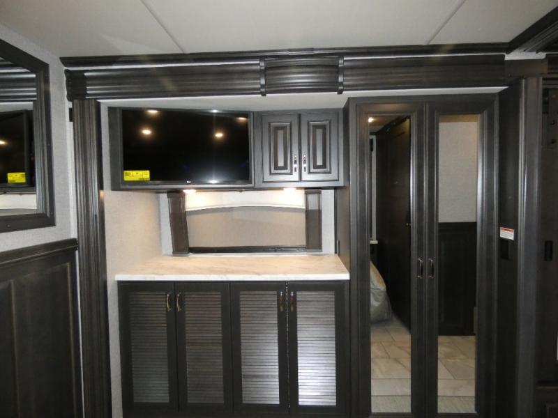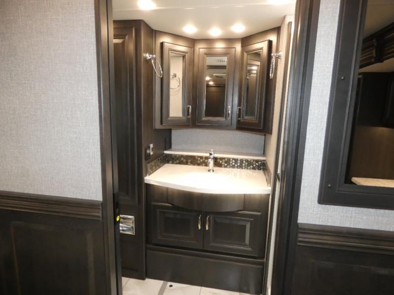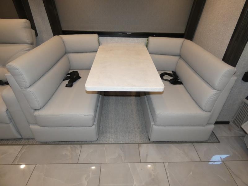Looking to travel with friends and family in luxury? This coach provides space-saving convertible bunk beds with barn doors right across from the mid-coach full bathroom. You might even like to add the Hide-A-Bed power drop-down overhead bunk option to provide added sleeping space when the bunks and furniture aren't enough. The sofa sleeper with a twin mattress and the booth dinette allow you to relax and visit, plus the driver and passenger seats swivel for more seating in the main living and kitchen area. Everyone can watch the LED TV with a fireplace below and/or the LED TV over the cab, and there is another LED TV in the bedroom, plus an entertainment center with LED TV outside. The rear bathroom that is attached to the master bedroom has a wardrobe for your things, and the master bedroom allows you to sleep like a king on the slide out giving you more floor space. There is also a side-by-side washer/dryer that will keep everything clean while you're away. The kitchen offers stainless steel appliances, a convection microwave, a two burner induction cooktop and so much more. Start planning your trip today!