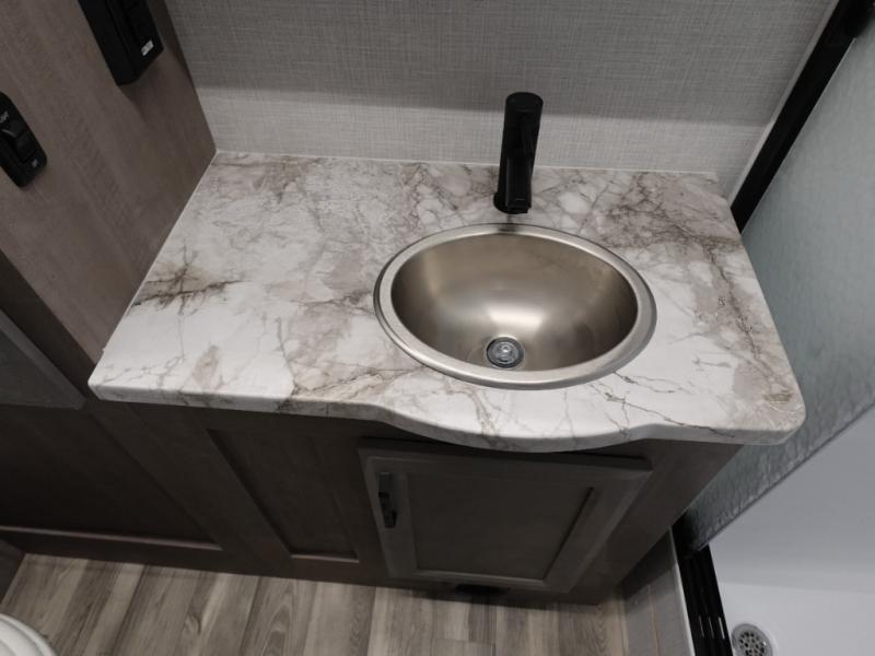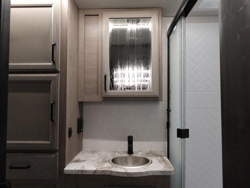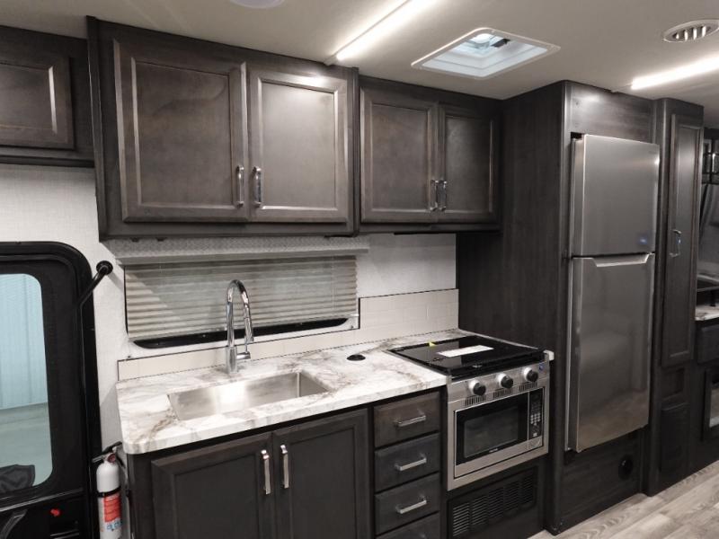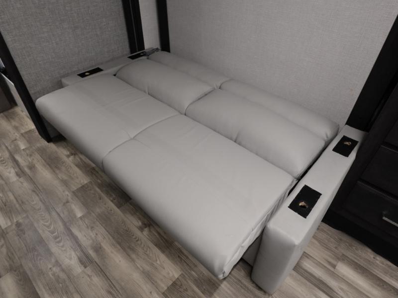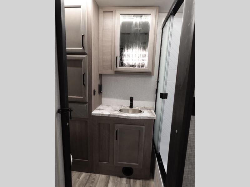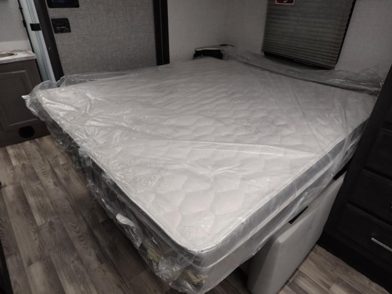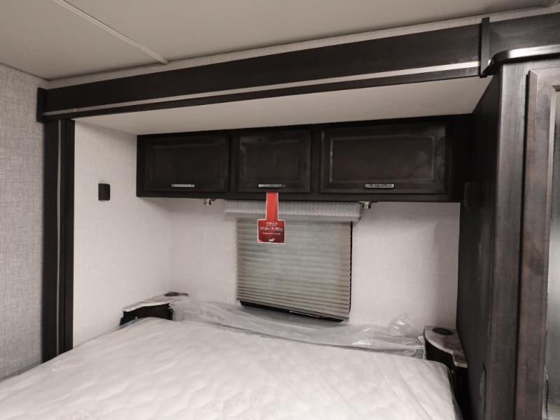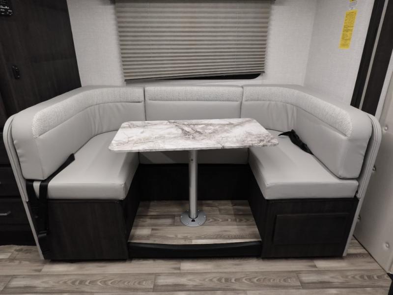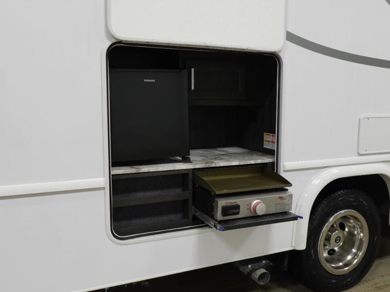 Pack your bags and head off on new adventures in this spacious coach! You will love gathering around the U-shaped dinette for a game or a meal, and the full-wall slide provides ample space to move around. An overhead bunk provides sleeping space for little ones or to be used as extra storage space. Since there is a queen Murphy bed, you will enjoy versatile seating and sleeping space, and the full rear bath will allow you to freshen up each day without having to use the camp's facilities. This model also includes a three burner range/convection microwave combo to cook meals on plus an exterior kitchen with a mini fridge, pull-out griddle, and storage when the weather is nice!