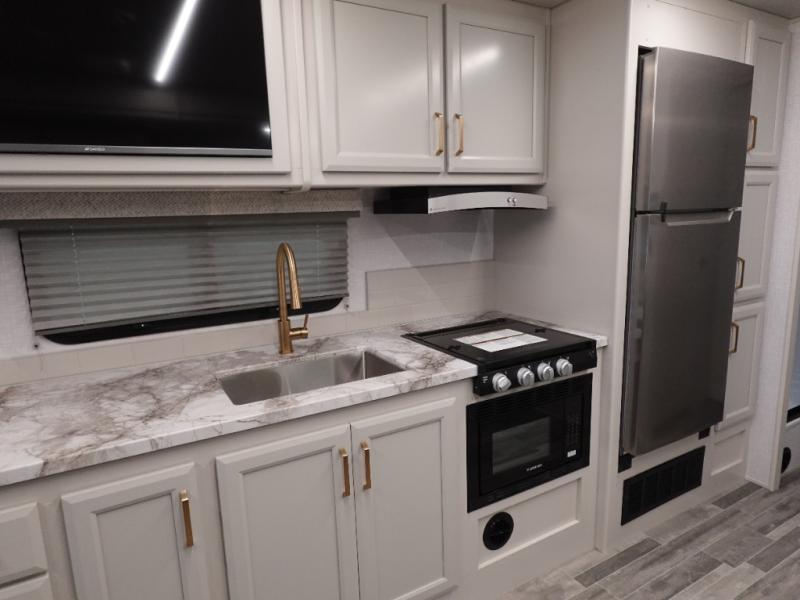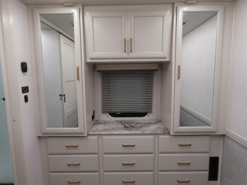 This double slide out coach is perfect for weekend excursions or extended stays! You will love having your own private bedroom in the back with a queen bed slide out and a wardrobe to keep your things organized. The private toilet and sink is right across the hall from the shower, so two people can freshen up at once. While the chef of your group is making lunch on the three burner range/convection microwave combo, the others can visit around the U-shaped dinette or relax on the sofa. These pieces of furniture will also double as additional sleeping space for guests, along with the overhead bunk!