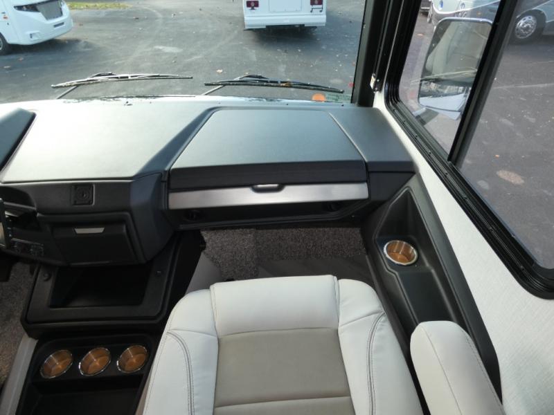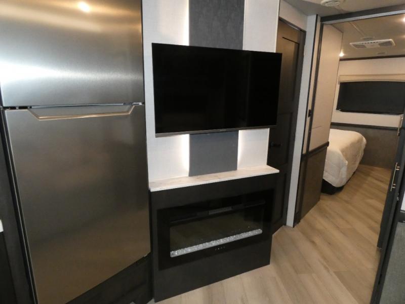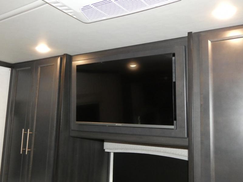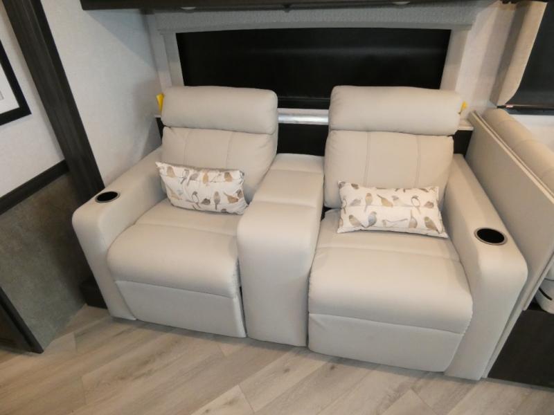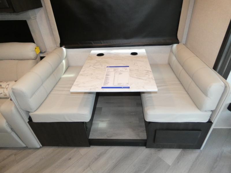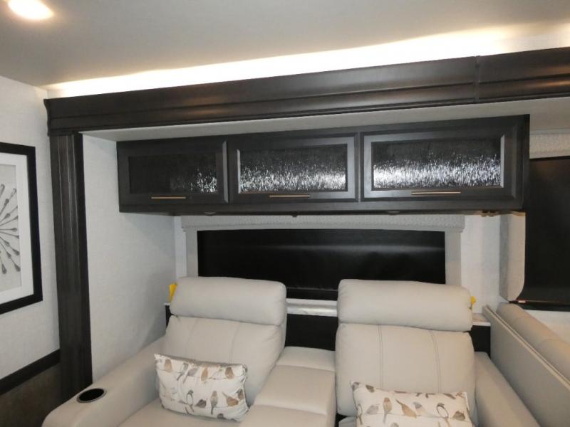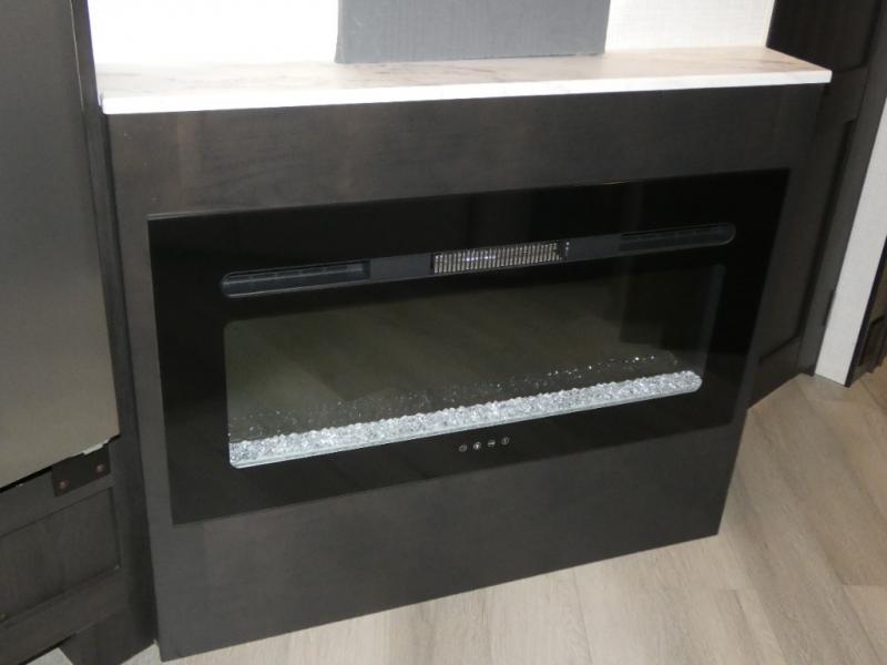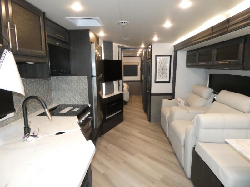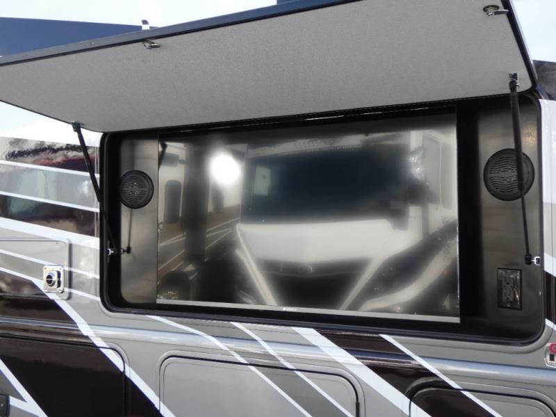 Start taking your best road trips in this motorhome! You will feel right at home sleeping in the rear private bedroom on the Serenity Series king bed slide with CPAP storage above it and a LED TV to watch movies in comfort, plus you have three wardrobes and a dresser for all of your clothes. Prepare your best home cooked meals with the three burner cooktop, store any leftovers in the stainless steel residential refrigerator, and pop a bag of popcorn in the stainless steel over- the-range convection microwave. Enjoy your meals in comfort at the Dream Dinette then play a card game, but if you're not one for games then you can relax on the theater seats across from the fireplace with a LED smart TV above it!