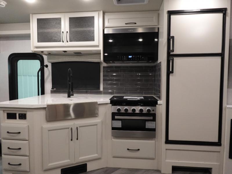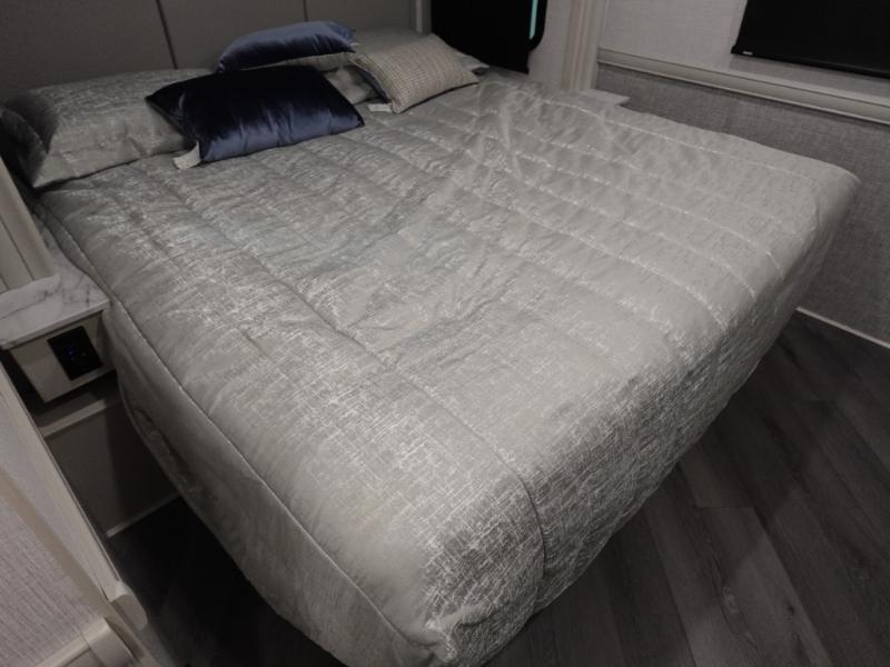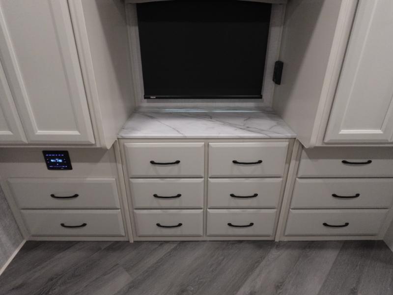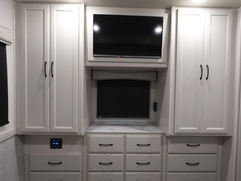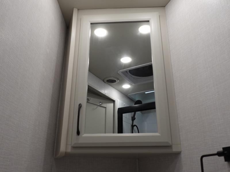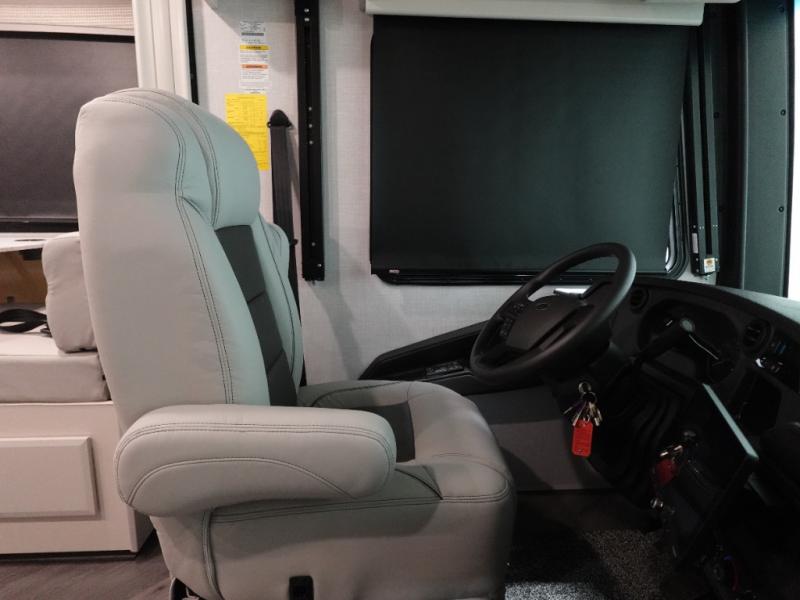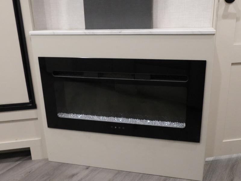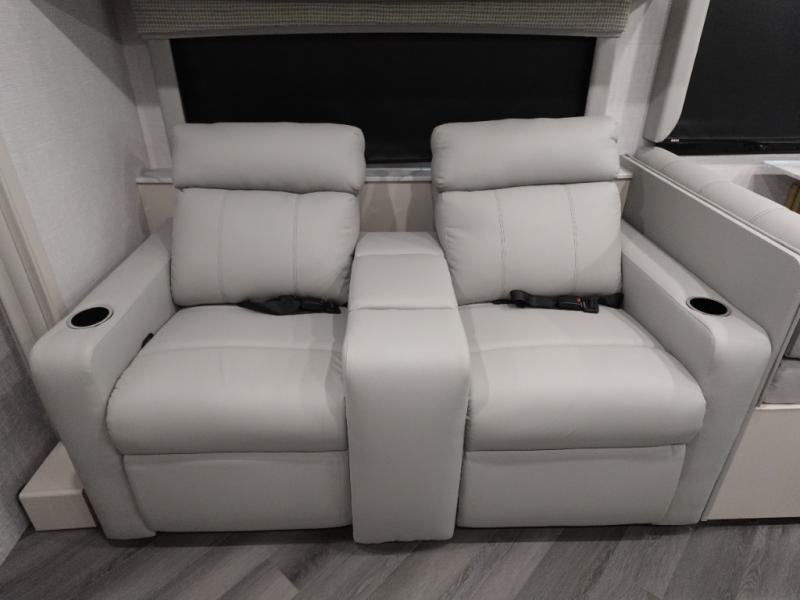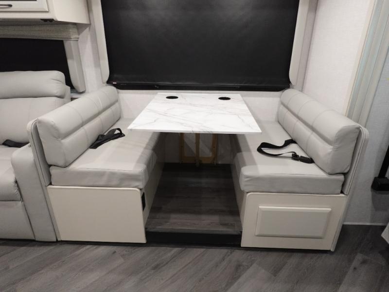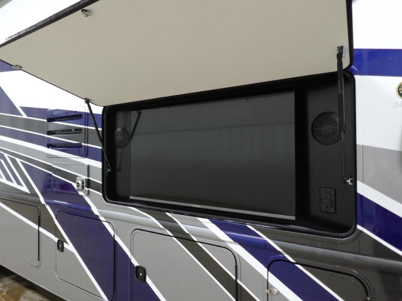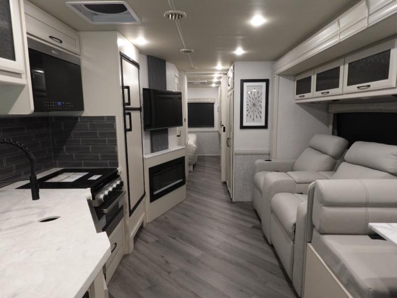 Start taking your best road trips in this motorhome! You will feel right at home sleeping in the rear private bedroom on the Serenity Series king bed slide with CPAP storage above it and a LED TV to watch movies in comfort, plus you have three wardrobes and a dresser for all of your clothes. Prepare your best home cooked meals with the three burner cooktop, store any leftovers in the stainless steel residential refrigerator, and pop a bag of popcorn in the stainless steel over- the-range convection microwave. Enjoy your meals in comfort at the Dream Dinette then play a card game, but if you're not one for games then you can relax on the theater seats across from the fireplace with a LED smart TV above it!