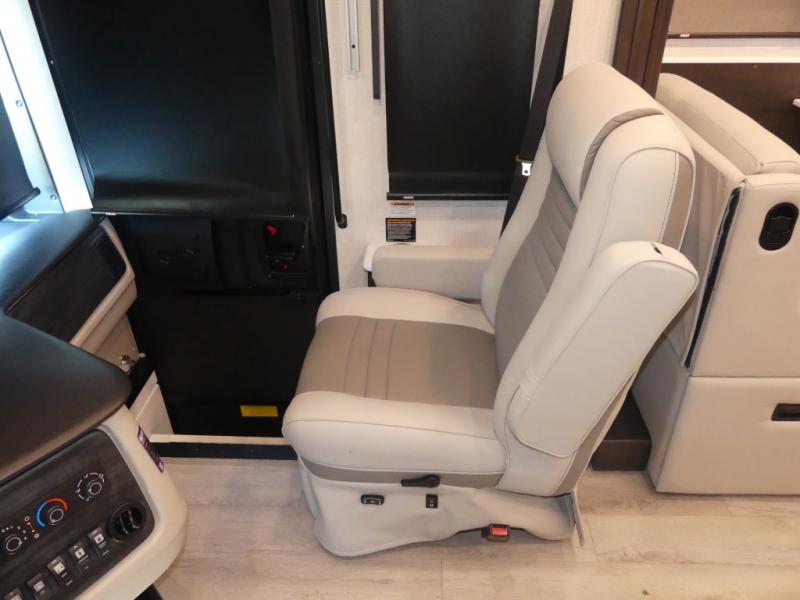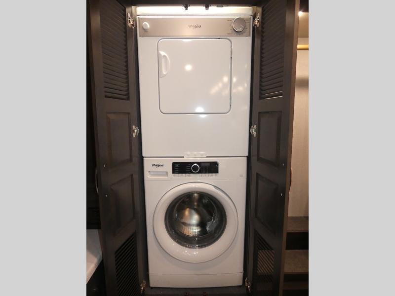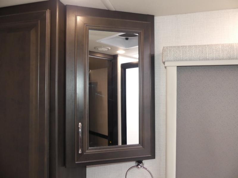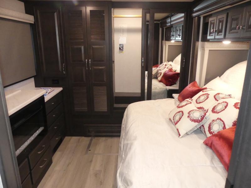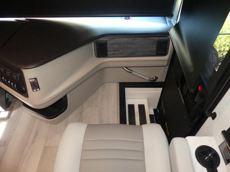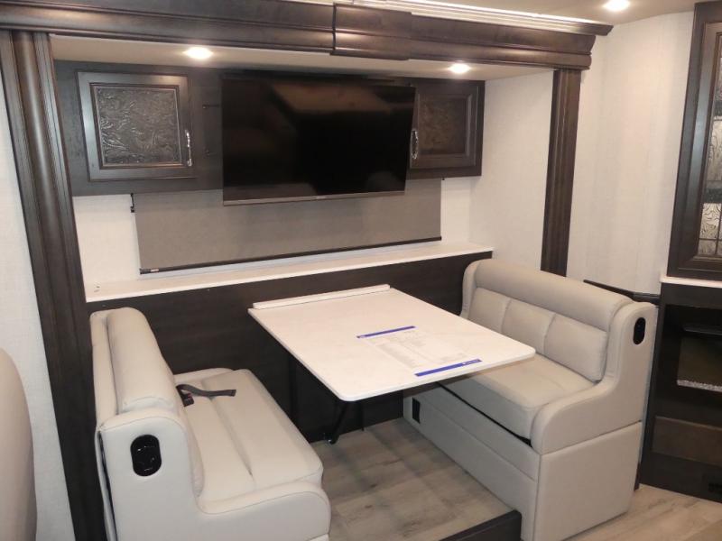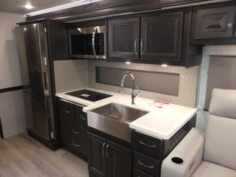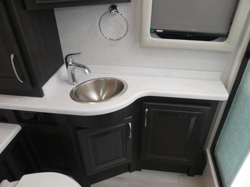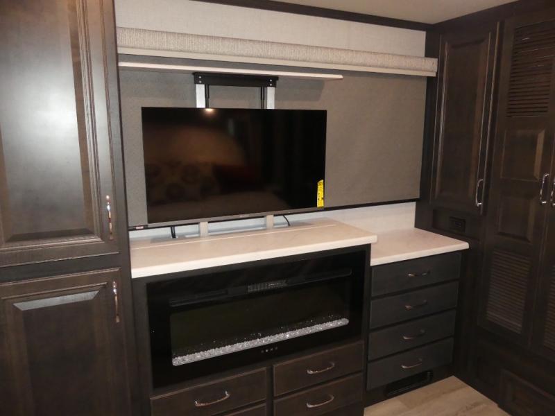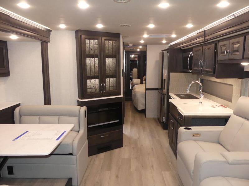 All hands on deck for the voyage of a lifetime in this Nautica Class A diesel motorhome! You will love the residential features found on this coach, like the Encore Series king-size bed in the rear private bedroom, the stainless steel residential refrigerator and convection microwave in the kitchen, the two fireplaces, and the three TVs. There is additional living space all throughout this coach because of the three slides, and there is also plenty of high-class style with the glass tile backsplash and stainless steel farmhouse sink, the composite tile flooring, the LED accent lighting, and the designer bedspread. Plus, the bathroom is phenomenal with its fiberglass shower, glass shower door, shower skylight, residential faucet, and medicine cabinet with a mirror. You will be so impressed!