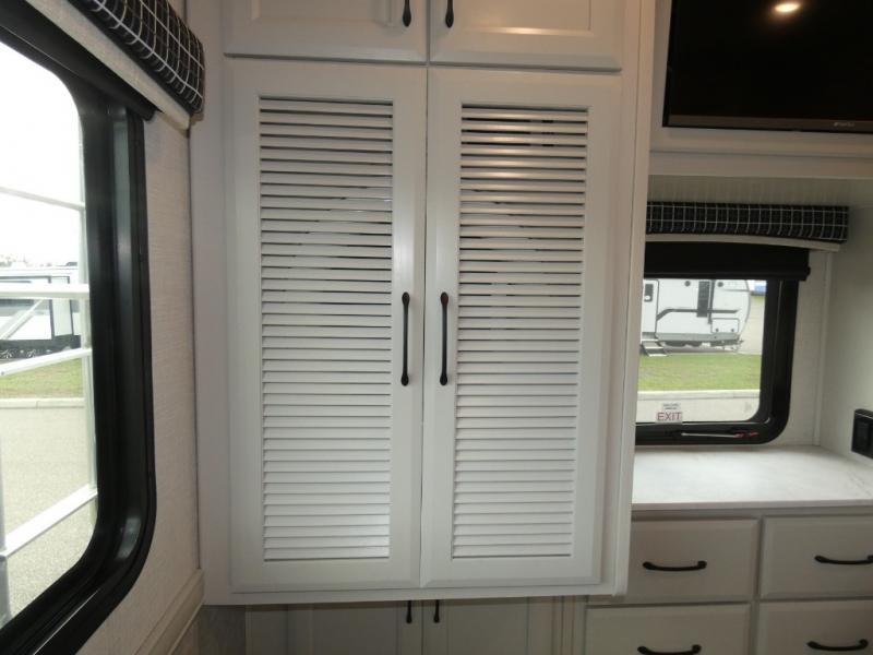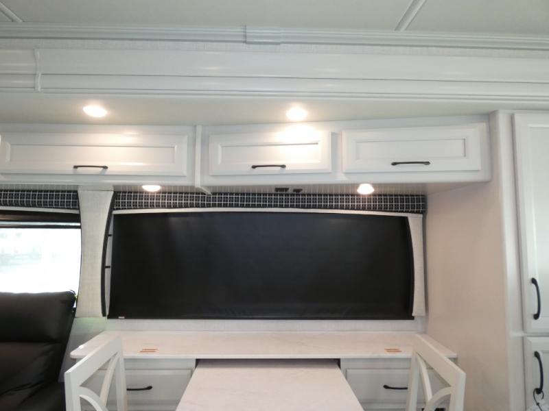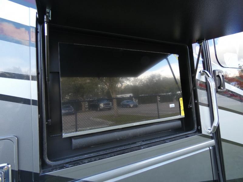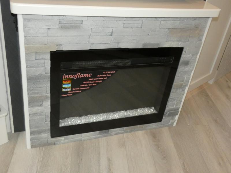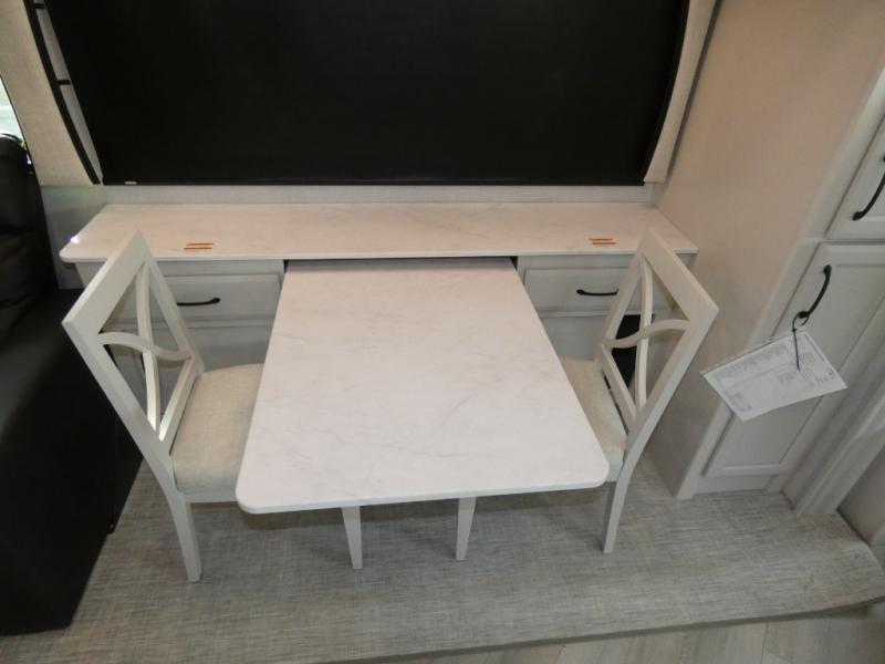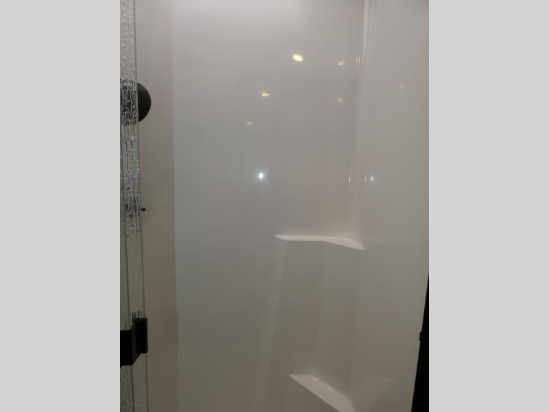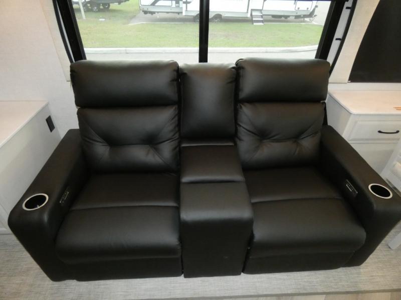 This double slide out coach will meet your needs perfectly on every family vacation. There is a dinette and theater seating in the main living area, plus a fireplace with an LED TV to make it feel a little more like home. You can prepare meals on the three burner cooktop, and leftovers can go in the stainless steel residential refrigerator. You're going to love the spacious full bath that includes a shower with a seat, a skylight, plus a medicine cabinet with a mirror.