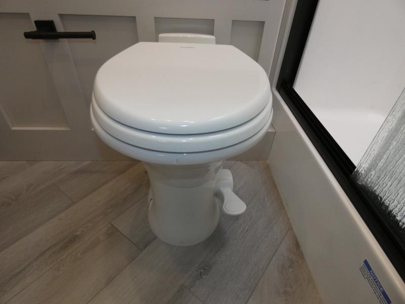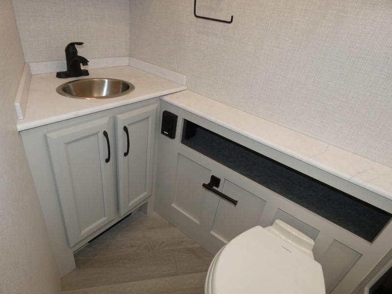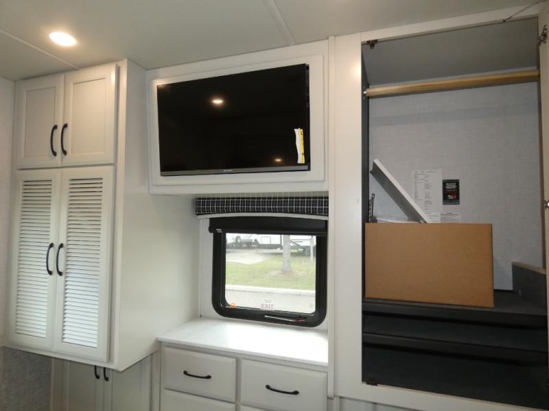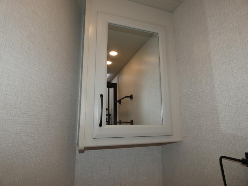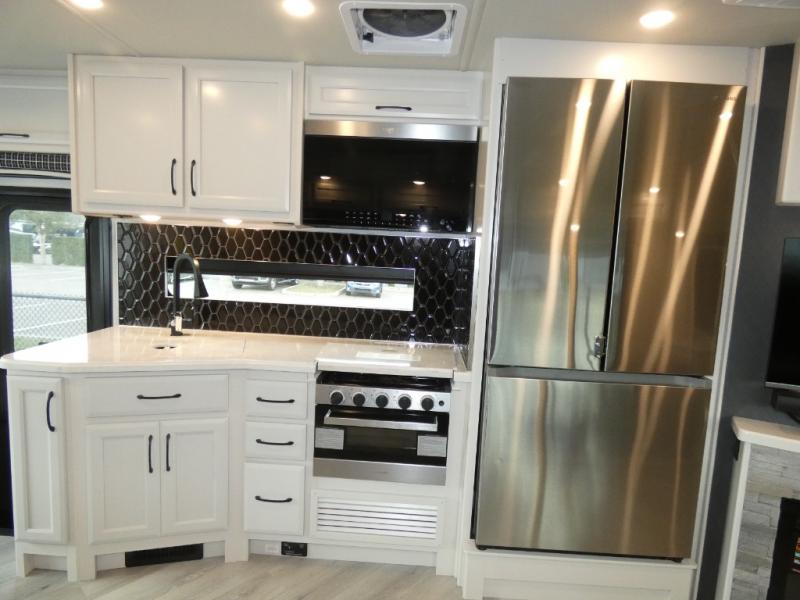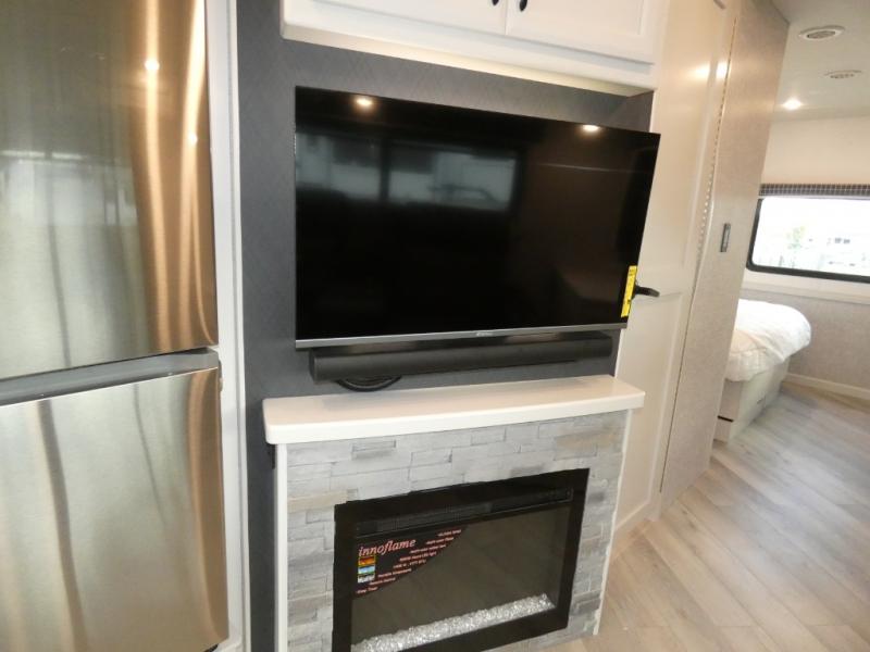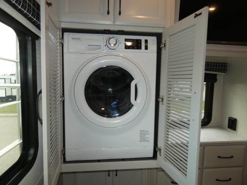 This double slide out coach will meet your needs perfectly on every family vacation. There is a dinette and theater seating in the main living area, plus a fireplace with an LED TV to make it feel a little more like home. You can prepare meals on the three burner cooktop, and leftovers can go in the stainless steel residential refrigerator. You're going to love the spacious full bath that includes a shower with a seat, a skylight, plus a medicine cabinet with a mirror.