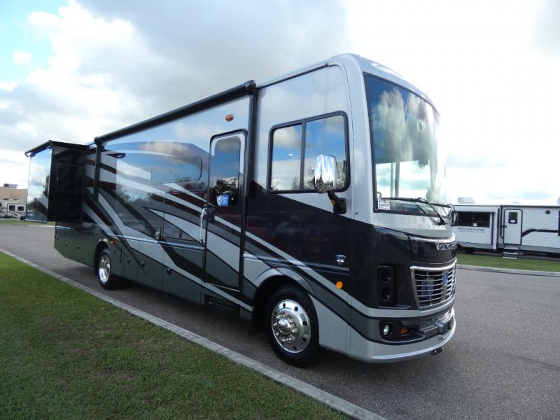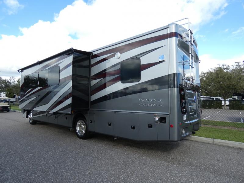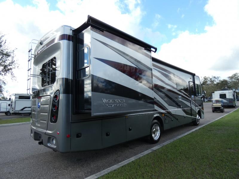 Escape the boring for fun trips in a Vacationer Class A gas motorhome by Holiday Rambler. You can easily make this coach your home-away-from home with features such as dual A/C units, vinyl tile flooring, and stainless steel appliances. The bus-style luggage doors will make for easy unloading, and the automatic hydraulic leveling jacks make setting up camp easier than ever. The Vacationer is constructed with a Powerlock System with interlocking floor, walls, and roof, plus premium gel exterior Vetrosina fiberglass skin with no wood substrate for added durability. Each model includes an automotive style dash with dual monitors, and MultiPlex house controls that can easily be controlled by your smart phone or tablet. The list of standard features doesn't stop there. You'll have an environmentally friendly 100W solar panel, an exterior entertainment center, large holding tank capacities, and so much more!