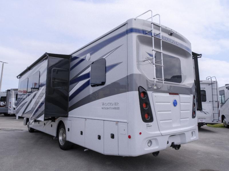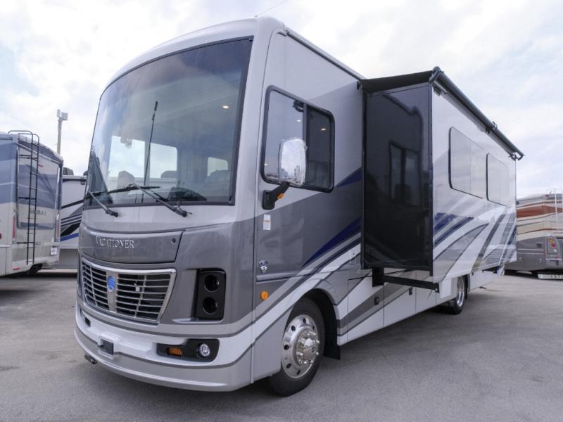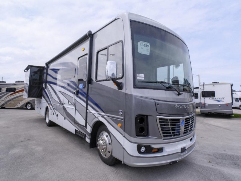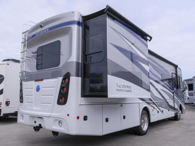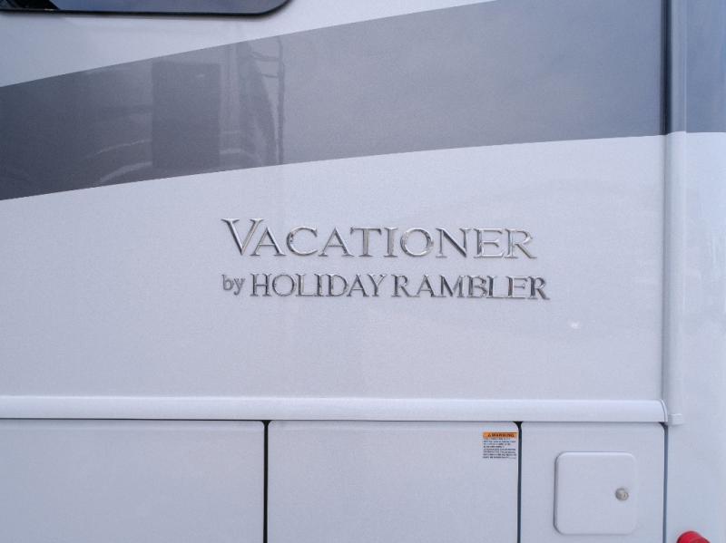Escape the boring for fun trips in a Vacationer Class A gas motorhome by Holiday Rambler. You can easily make this coach your home-away-from home with features such as dual A/C units, vinyl tile flooring, and stainless steel appliances. The bus-style luggage doors will make for easy unloading, and the automatic hydraulic leveling jacks make setting up camp easier than ever. The Vacationer is constructed with a Powerlock System with interlocking floor, walls, and roof, plus premium gel exterior Vetrosina fiberglass skin with no wood substrate for added durability. Each model includes an automotive style dash with dual monitors, and MultiPlex house controls that can easily be controlled by your smart phone or tablet. The list of standard features doesn't stop there. You'll have an environmentally friendly 100W solar panel, an exterior entertainment center, large holding tank capacities, and so much more!