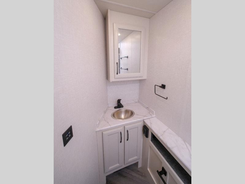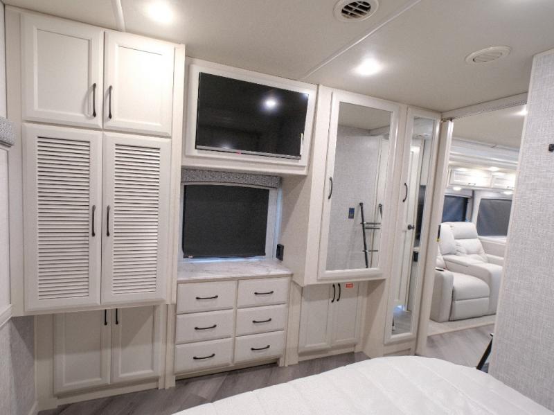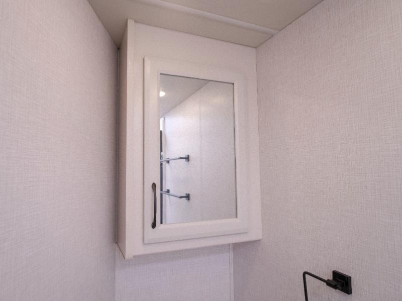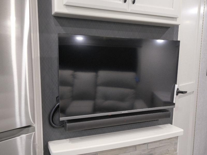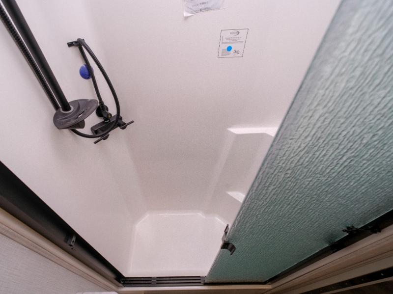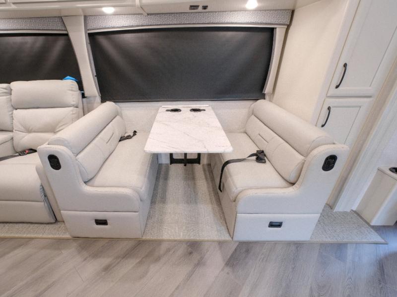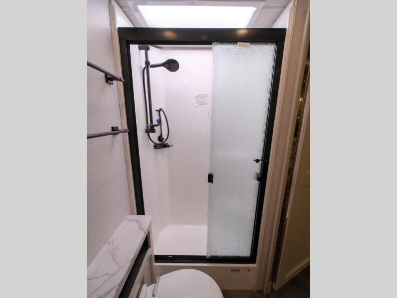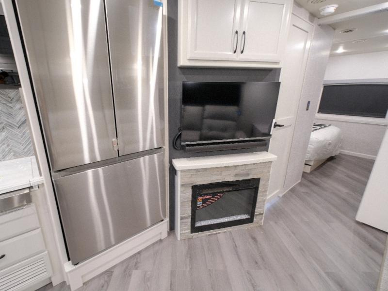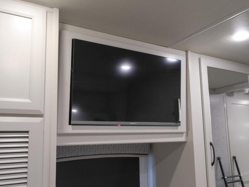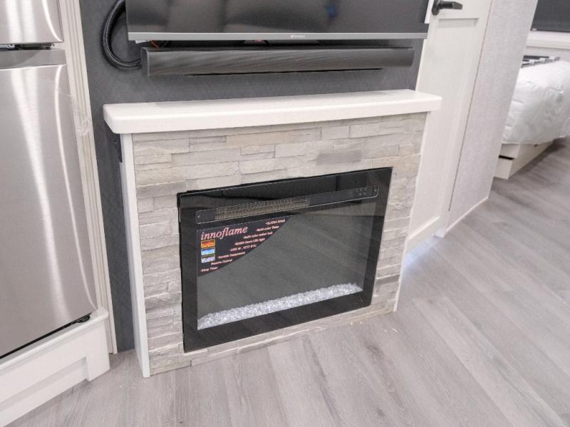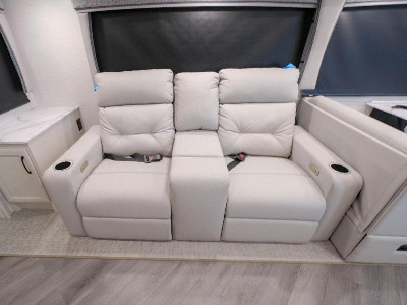 This double slide out coach will meet your needs perfectly on every family vacation. There is a Rest EZ booth dinette and theater seats in the main living area, plus a fireplace with an LED TV to make it feel a little more like home. You can prepare meals on the three burner cooktop, and leftovers can go in the stainless steel residential refrigerator. You're going to love the spacious full bath that includes a shower with a seat, a skylight, plus a medicine cabinet with a mirror. The Hide-A-Loft drop-down over bunk can be used if you need a space for guests, and you'll enjoy the Serenity Series king bed slide out and your own LED TV!