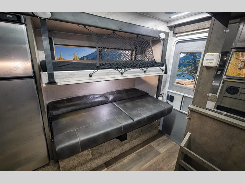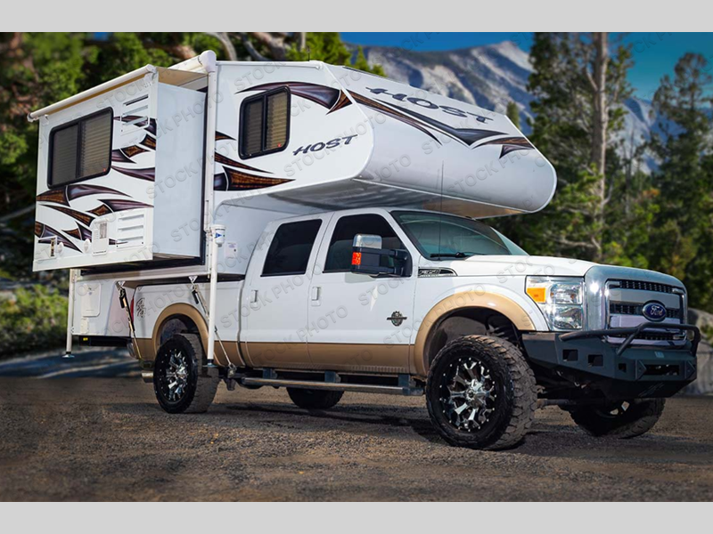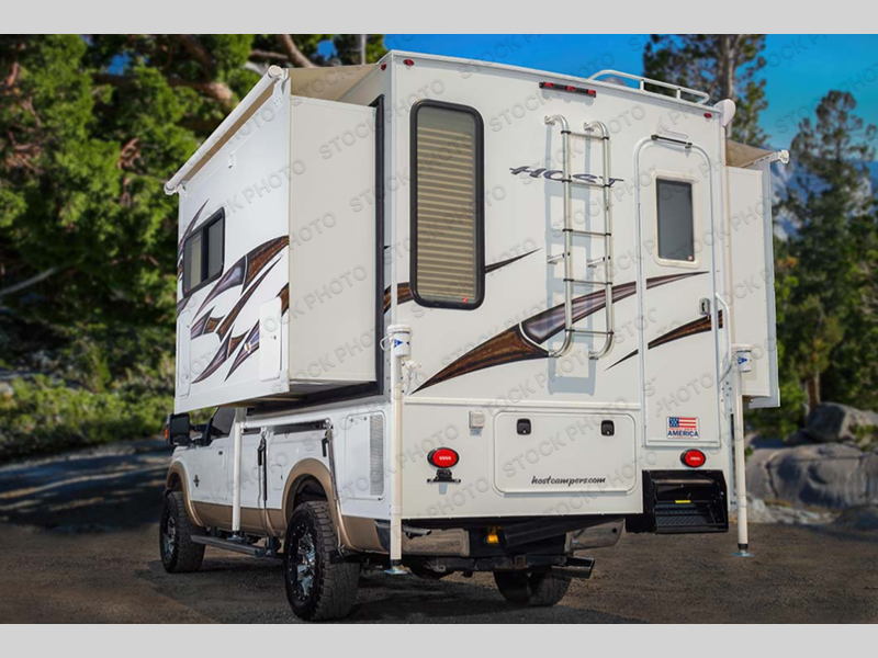 With any Host Industries Host Campers truck camper, there is ease of setting up with electric jacks with a wireless remote, and security when traveling thanks to the heavy duty camper tie down brackets. Each is constructed with two or three slide outs giving you more interior space on an Ultralite 100% aluminum structure with vacuum bonded foam insulated walls, a floor and a ceiling, plus there is a one-piece TPO roof. Some conveniences include an enclosed service center, enclosed and heated holding tanks, large J-rail rain gutters, and access panels for the slide out motors, water tank and holding tanks to mention a few. And the interior is just as impressive from the style, decor choices, the 12 volt LED lighting system, the Grani-coat solid surface countertops, and the many options you can add to customize your Host Camper!