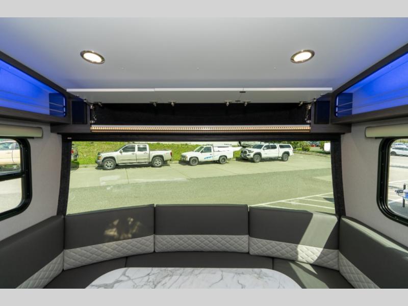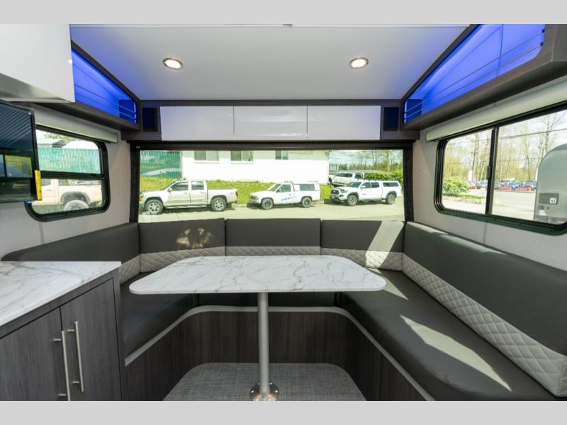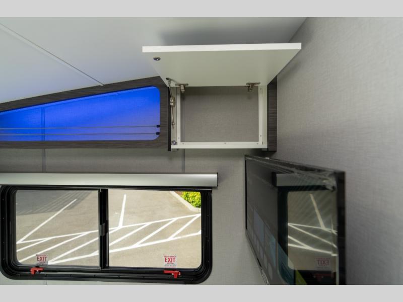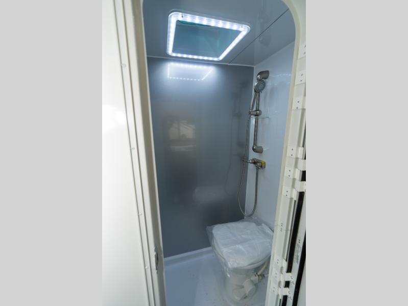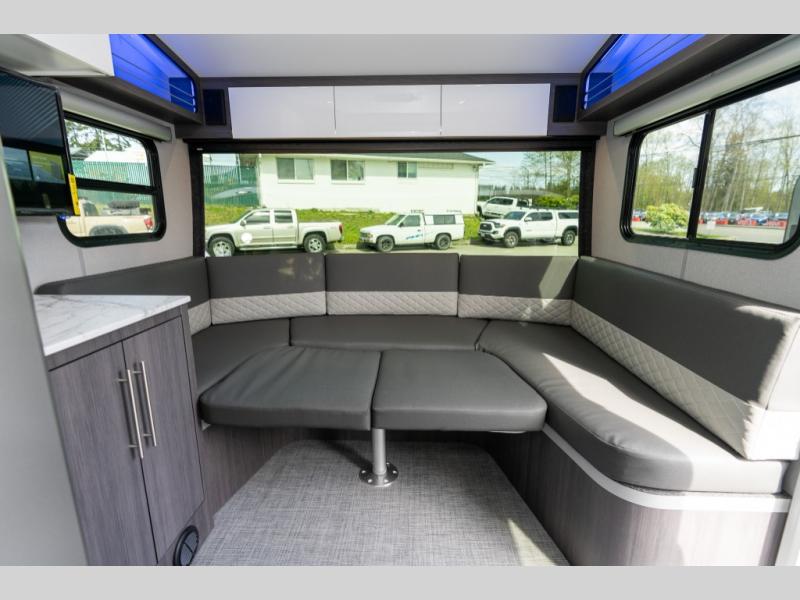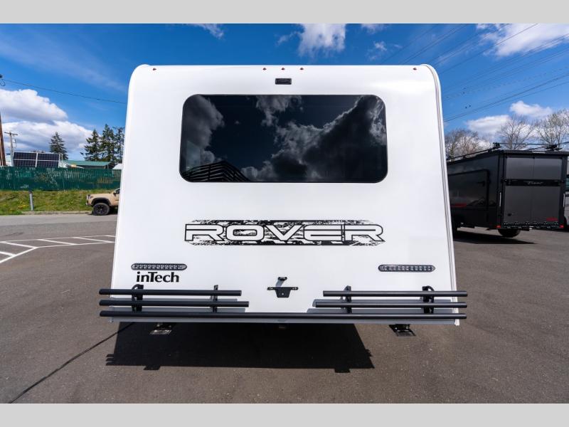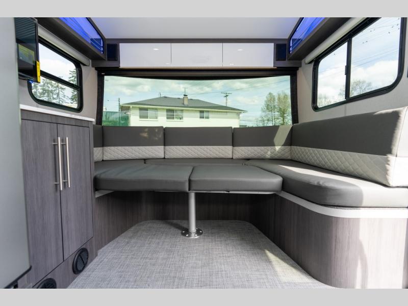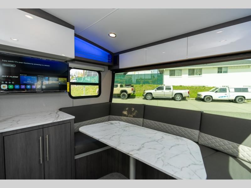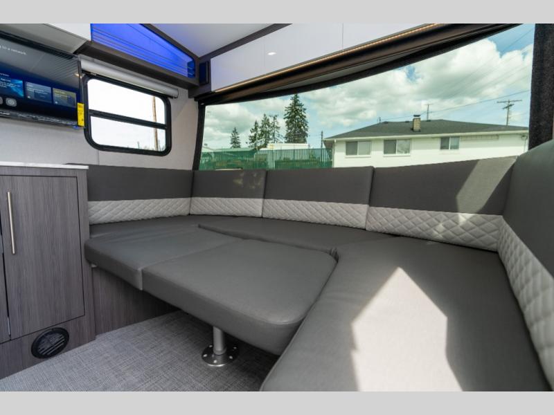 Step inside this travel trailer for fun trips to your state park! There is a front U-shaped dinette that will double as dining and sleeping space for guests, while you enjoy the queen-size bed in the back. You'll find the wet bath to be convenient, especially with its roof vent, mesh shower storage net and porcelain toilet. Each morning you can prepare breakfast on the two burner stainless steel cooktop or in the convection microwave, and there is a 10 cu. ft. 12V refrigerator for your perishables. There are plenty of storage spaces, including overhead cabinets, a nightstand with a drawer, plus a pantry with slide out drawers. This model has a dry weight that ranges from 4,764 lbs. - 5,200 lbs., a tongue weight from 475 lbs. - 500 lbs., and a net carrying capacity from 1,650 lbs. - 1,850 lbs. You may also like to choose the optional Rover Package that includes a 3" lift, an aluminum tube rear bumper, rugged decals, and more!