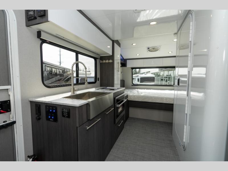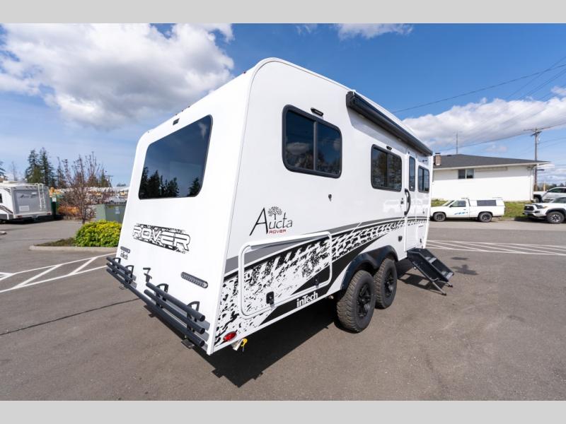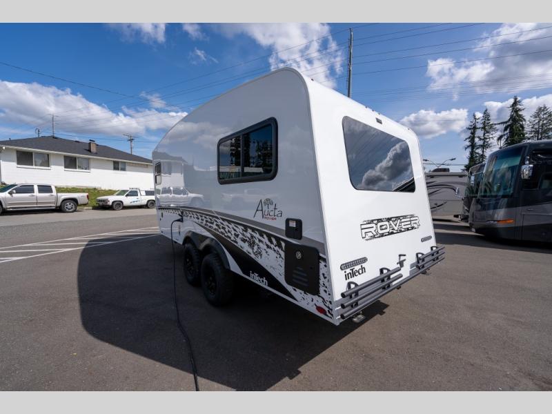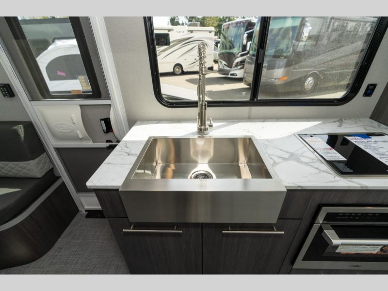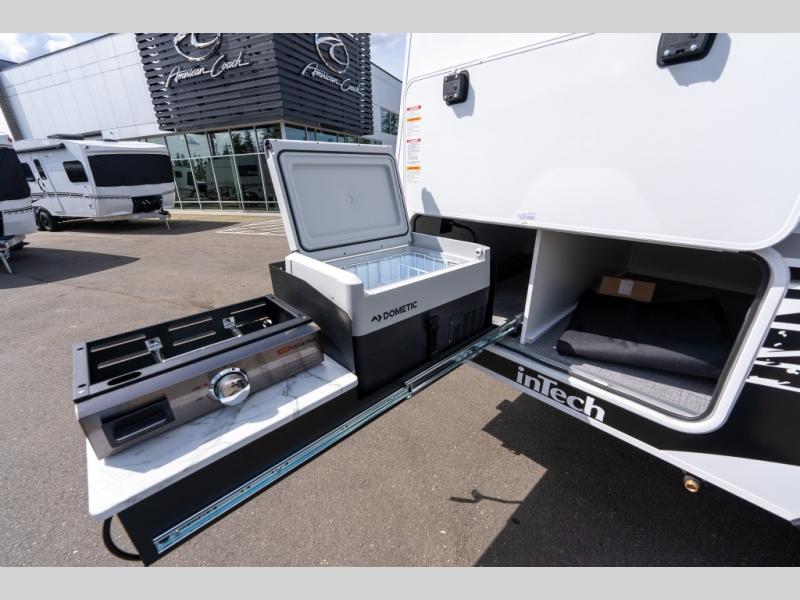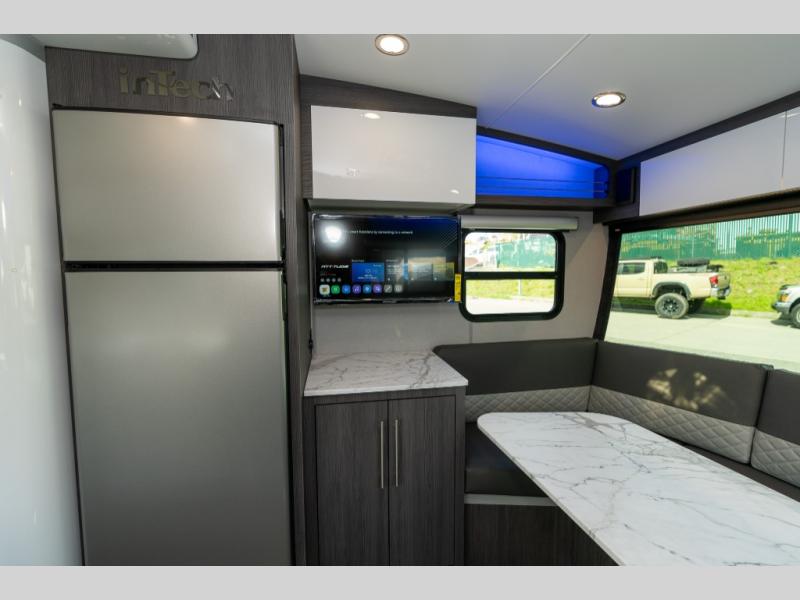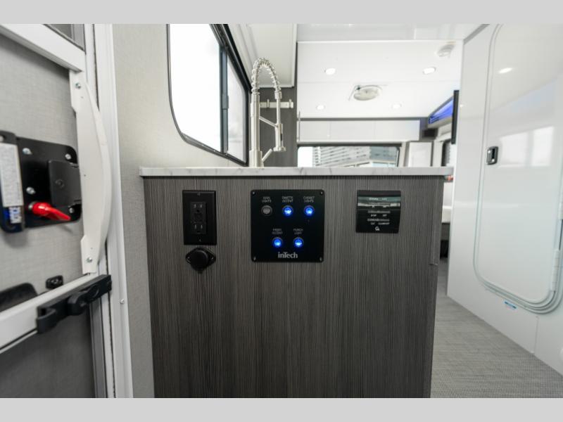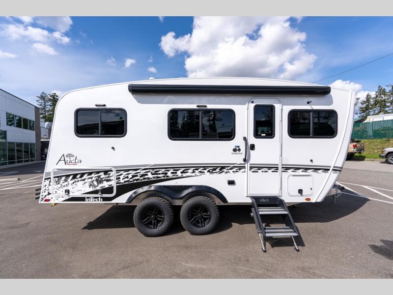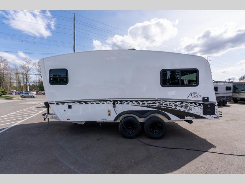 With any Aucta travel trailer by inTech RV you will enjoy creative interior spaces, luxury features, and smart storage spaces for a one-of-a-kind trailer. The one-piece fiberglass roof, all-aluminum cage frame, and Dexter torsion axle provide durable construction and smooth towing, and the fold-away double entry steps and power tongue jack will make set-up easier than ever. Inside, you'll find Infinity woven flooring, a large farmhouse sink, USB ports and 120V outlets, plenty of storage compartments, and MaxxAir vent fans to keep everything fresh. These models also include bubble foil insulation in the walls and ceiling, along with a 25K BTU furnace and a 15K BTU A/C so you can make memories year around!