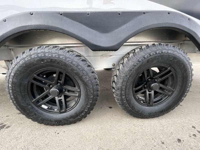 Step inside this travel trailer for fun trips to your state park! There is a front U-shaped dinette that will double as dining and sleeping space for guests, while you enjoy the queen-size bed in the back. You'll find the wet bath to be convenient, especially with its roof vent, mesh shower storage net and porcelain toilet. Each morning you can prepare breakfast on the two burner stainless steel cooktop or in the convection microwave, and there is a 10 cu. ft. 12V refrigerator for your perishables. There are plenty of storage spaces, including overhead cabinets, a nightstand with a drawer, plus a pantry with slide out drawers. This model has a dry weight that ranges from 4,764 lbs. - 5,200 lbs., a tongue weight from 475 lbs. - 500 lbs., and a net carrying capacity from 1,650 lbs. - 1,850 lbs. You may also like to choose the optional Rover Package that includes a 3" lift, an aluminum tube rear bumper, rugged decals, and more!
