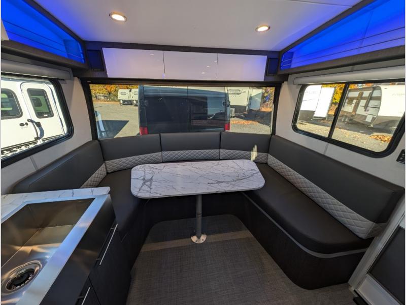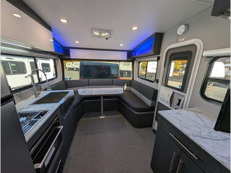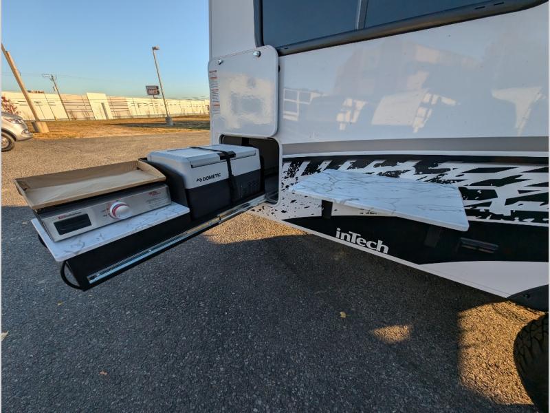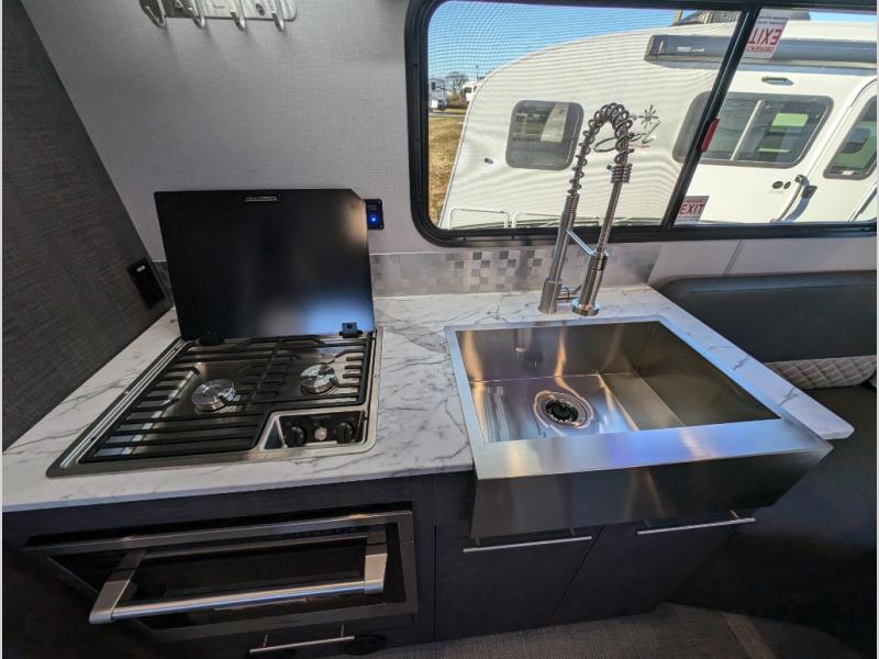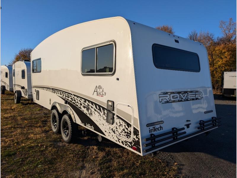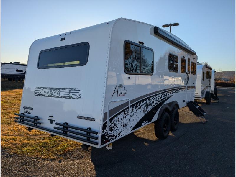 With any Aucta travel trailer by inTech RV you will enjoy creative interior spaces, luxury features, and smart storage spaces for a one-of-a-kind trailer. The one-piece fiberglass roof, all-aluminum cage frame, and Dexter torsion axle provide durable construction and smooth towing, and the fold-away double entry steps and power tongue jack will make set-up easier than ever. Inside, you'll find Infinity woven flooring, a large farmhouse sink, USB ports and 120V outlets, plenty of storage compartments, and MaxxAir vent fans to keep everything fresh. These models also include bubble foil insulation in the walls and ceiling, along with a 25K BTU furnace and a 15K BTU A/C so you can make memories year around!