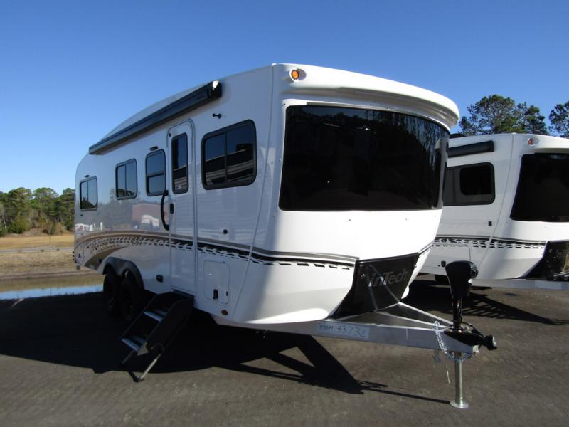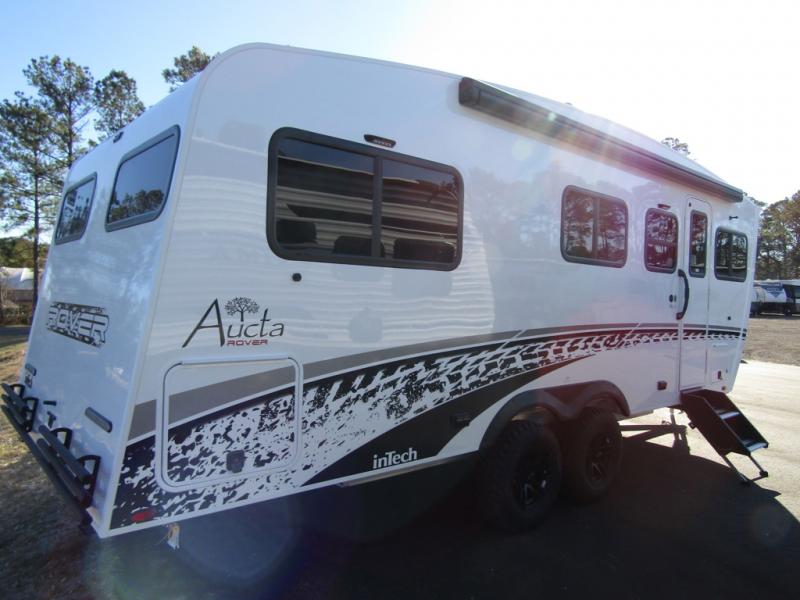 With any Aucta travel trailer by inTech RV you will enjoy creative interior spaces, luxury features, and smart storage spaces for a one-of-a-kind trailer. The one-piece fiberglass roof, all-aluminum cage frame, and Dexter torsion axle provide durable construction and smooth towing, and the fold-away double entry steps and power tongue jack will make set-up easier than ever. Inside, you'll find Infinity woven flooring, a large farmhouse sink, USB ports and 120V outlets, plenty of storage compartments, and MaxxAir vent fans to keep everything fresh. These models also include bubble foil insulation in the walls and ceiling, along with a 25K BTU furnace and a 15K BTU A/C so you can make memories year around!