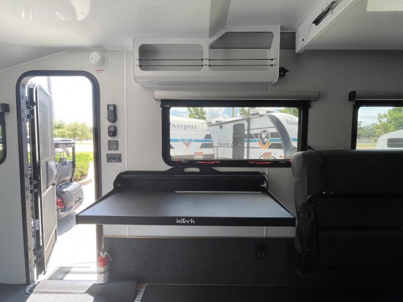With any Black Wing toy hauler travel trailer by inTech RV, you will durable construction thanks to the fully welded cage and frame construction. There is also a one-piece aluminum roof, a power tongue jack, and solar prep outside for off-grid capabilities. The interior features ample storage space, a MaxxAir vent, a large farmhouse style sink with a gold faucet, and a Bluetooth stereo plus a Smart TV to keep you entertained. Additional features include USB and 120V outlets, an on-demand water heater, aluminum garage flooring, and available options to further customize your toy hauler!