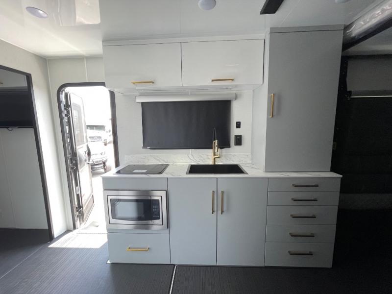 This spacious toy hauler is perfect for your toys, personal belongings, and more! There is 13' 3" total garage space when you utilize the space up to the wet bath, and the eight tie-down rings will keep everything secure. You'll enjoy the front bedroom with a queen bed with memory foam, a MaxxAir vent, and a 32" Smart TV. If you're needing more sleeping space, you can choose to add the optional Happijac queen bed and optional Happijac sofa beds. A full kitchen includes a two burner cooktop and a 10 cu. ft. 12V refrigerator, along with a fold-down removable table for dining space. And if you enjoy cooking outdoors, the optional exterior slide out kitchen can easily be added. The dry weight for this model ranges from 6,000 lbs. - 6,500 lbs., the carrying capacity ranges from 2,000 lbs. - 2,500 lbs., and the tongue weight ranges from 820 lbs. - 1,100 lbs.