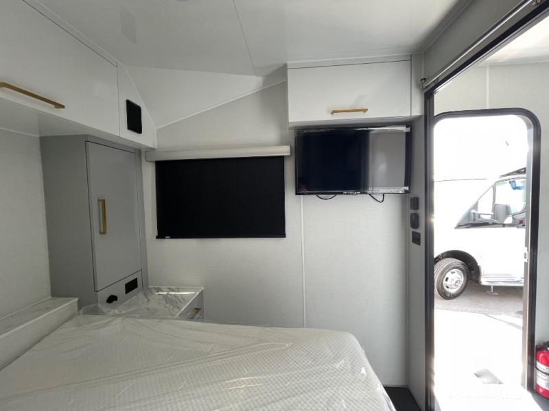 With any Black Wing toy hauler travel trailer by inTech RV, you will durable construction thanks to the fully welded cage and frame construction. There is also a one-piece aluminum roof, a power tongue jack, and solar prep outside for off-grid capabilities. The interior features ample storage space, a MaxxAir vent, a large farmhouse style sink with a gold faucet, and a Bluetooth stereo plus a Smart TV to keep you entertained. Additional features include USB and 120V outlets, an on-demand water heater, aluminum garage flooring, and available options to further customize your toy hauler!